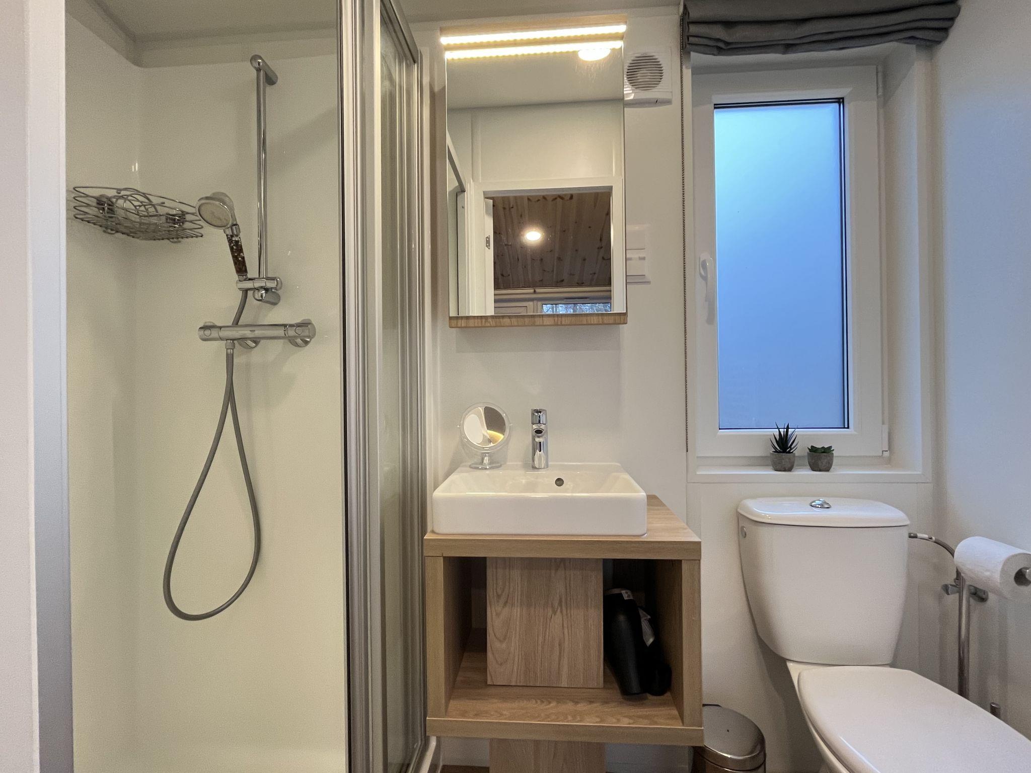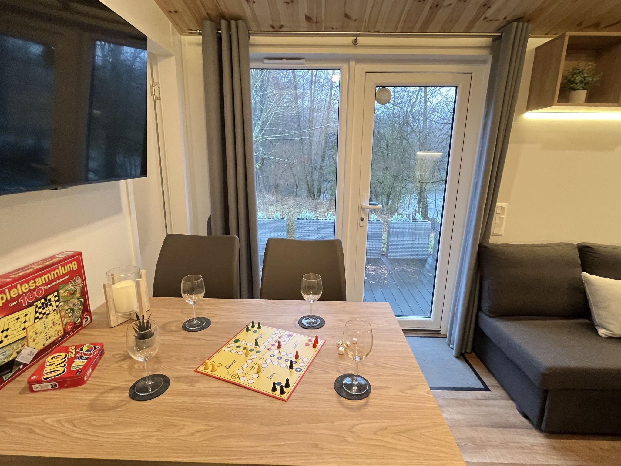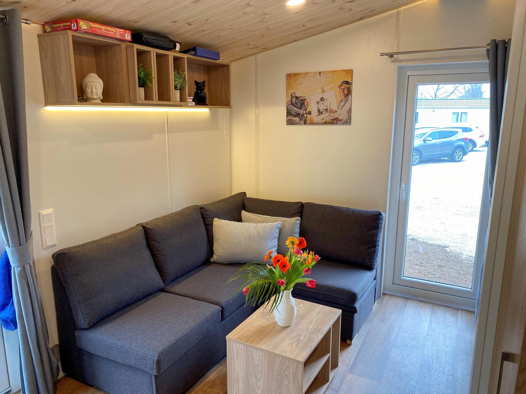 "Tiny Haus Seeblick", 3-Zimmer-Mobilheim 29 m2. Gemütlich eingerichtet: Wohn-/Esszimmer mit Esstisch und Sat-TV (Flachbildschirm). Ausgang zur Terrasse. 1 Zimmer mit 1 Doppelbett (140 cm, Länge 200 cm). 1 Zimmer mit 2 Betten (80 cm, Länge 200 cm). Kochnische (Geschirrspüler, 2 Induktionskochplatten, Wasserkocher, elektrische Kaffeemaschine). Dusche/WC. Terrasse. Terrassenmöbel, Elektrogrill (mobil), Liegestühle (2). Zur Verfügung: Internet (WLAN, gratis). Bitte beachten: Nichtraucher-Unterkunft. Hinweis: Die WLAN-Verbindung kann je nach Kapazität eingeschränkt sein.