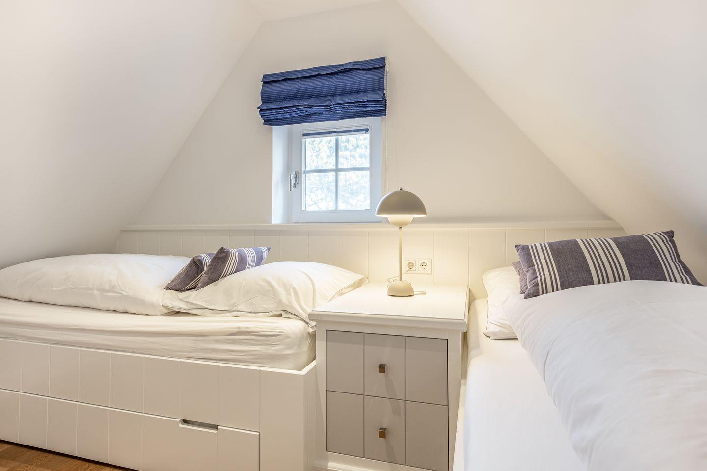 Das gesamte Dachgeschoss des Domizils wurde Anfang 2022 neu gestaltet. Dort erwarten Sie zwei weitere Räume mit hochwertigen Einbauten. Hiervon ist einer mit einem Doppelbett und einem Flatscreen-TV ausgestattet und der andere Raum mit zwei Einzelbetten.