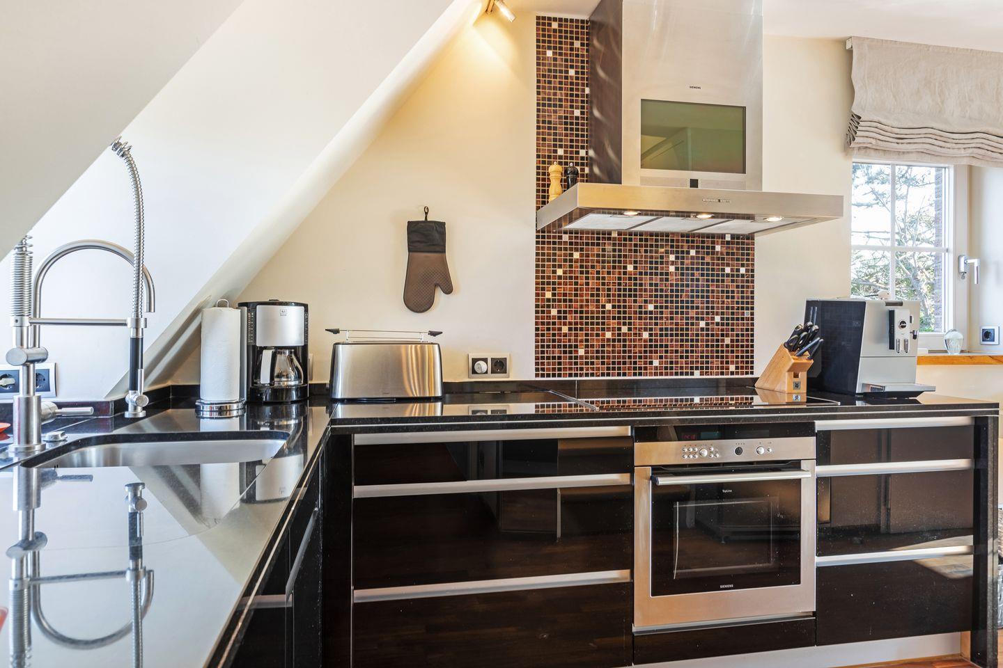 OG: Wohnraum mit Flatscreen-TV, Radio, W-Lan, Essbereich, offene Küche mit Backofen-Microwellen-Kombi, Induktionsherd, Geschirrspüler, Filterkaffeemaschine, Jura-Vollautomat, Weinkühlschrank, Badezimmer mit Dusche, Whirlpool-Badewanne und WC, Balkon mit Balkonmöbeln, Waschtrockner