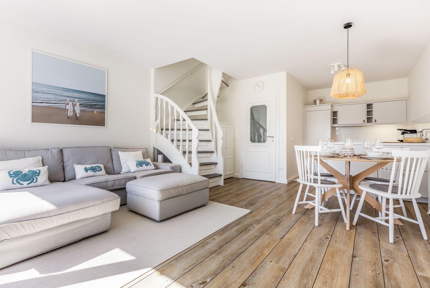 Der Wohnbereich im Obergeschoss des Hauses hält für Sie eine gemütliche Couch, einen Essbereich und eine offene Küche bereit. Die Küche ist mit Backofen, Ceranfeld, und Nespressomaschine ausgestattet und bietet Ihnen somit alles was Sie brauchen, um sich in Ihrem Urlaub ein leckeres Frühstück oder Abendessen zu zaubern. Vom Wohnbereich aus erreichen Sie Ihren eigenen kleinen Balkon, der von April bis Oktober möbliert ist. Hier lässt sich entspannt die Sylter Nordseeluft bei einem leckeren Gläschen genießen.