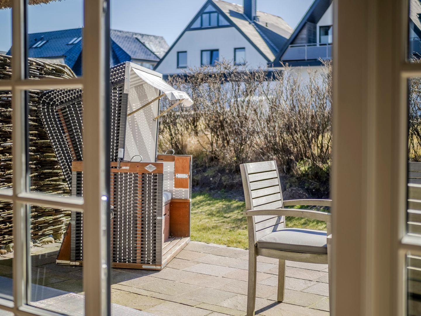 Vom Wohn- und Esszimmer gelangen Sie auf die möblierte Südterrasse mit Ganzjahresstrandkorb und können das Meeresrauschen der Nordsee hören. Eine kleine Erhebung im Garten ermöglicht den Blick über die Dünen auf die Nordsee.