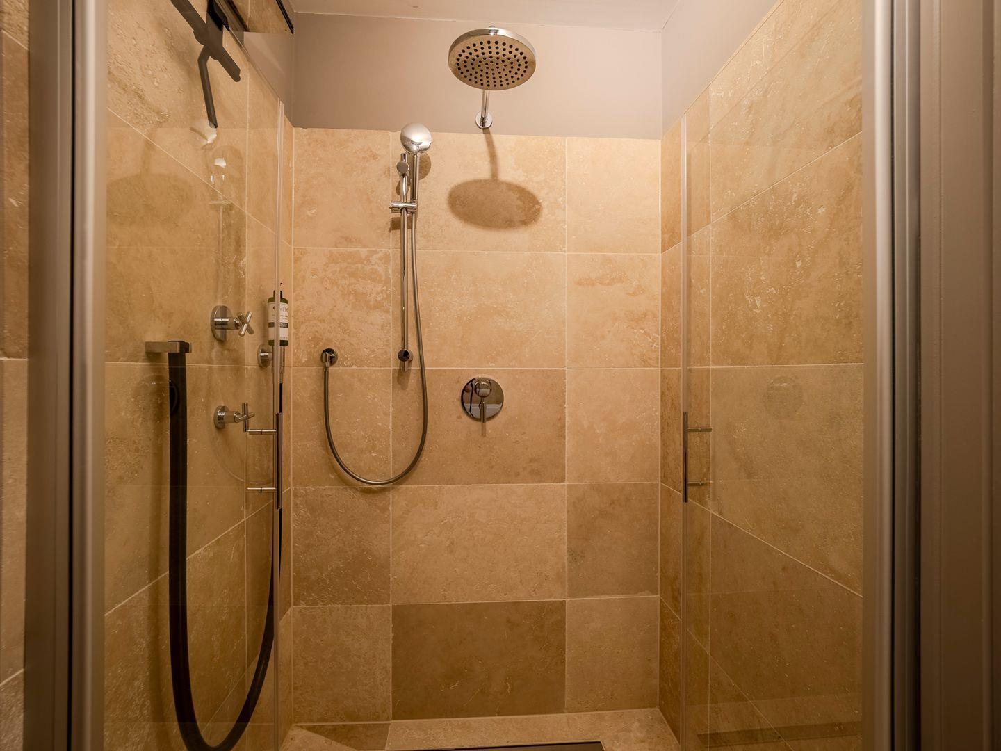 Zwei Badezimmer mit bodengleicher Regendusche, Handtuchtrockner. Eines der Badezimmer verfügt zusätzlich über eine freistehende Badewanne, Radio und Meerblick.