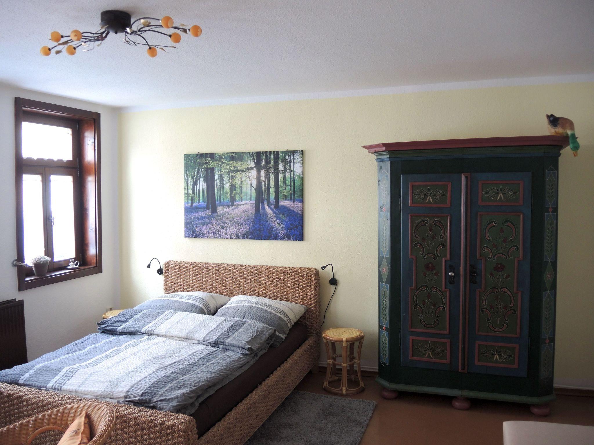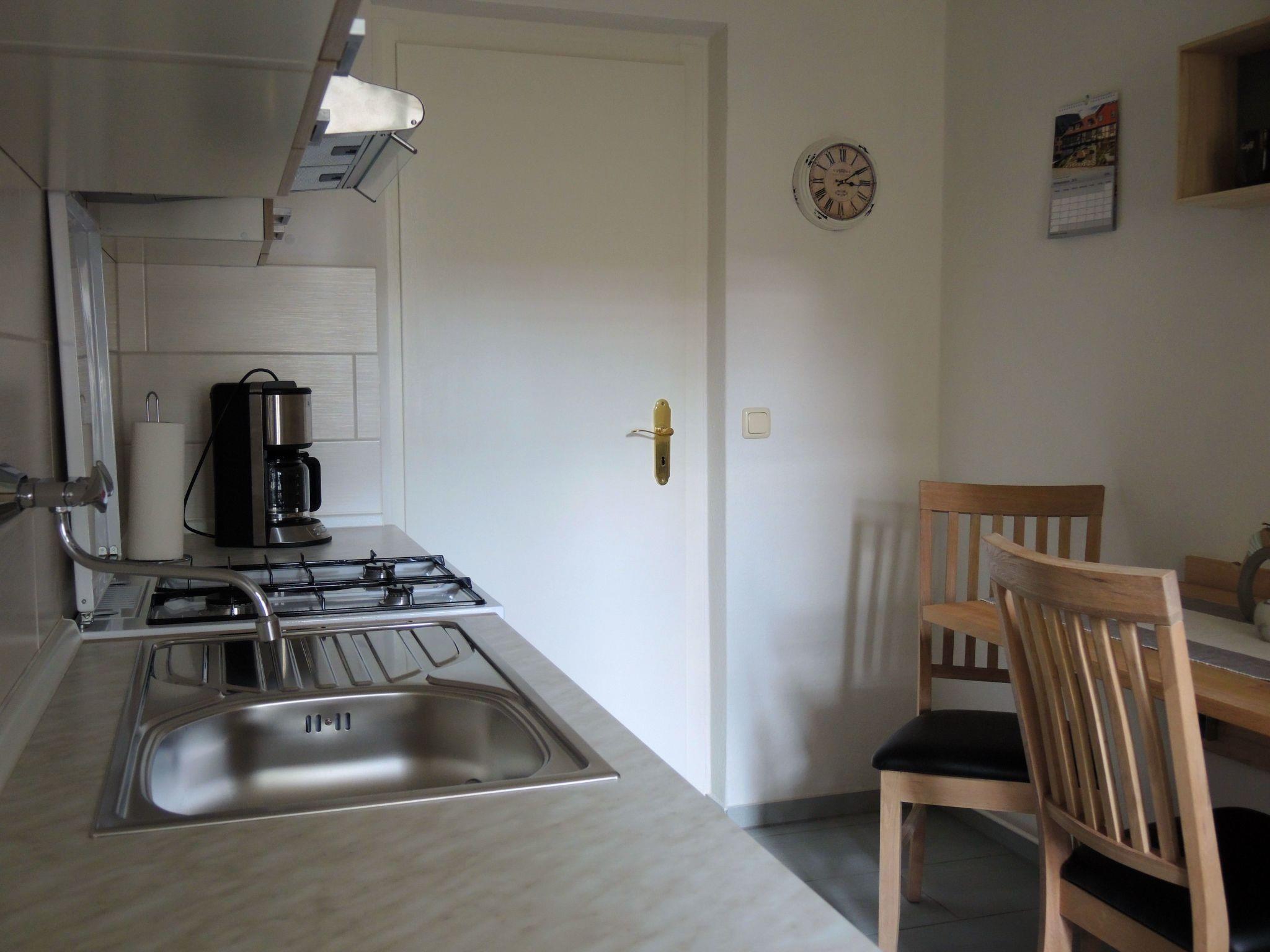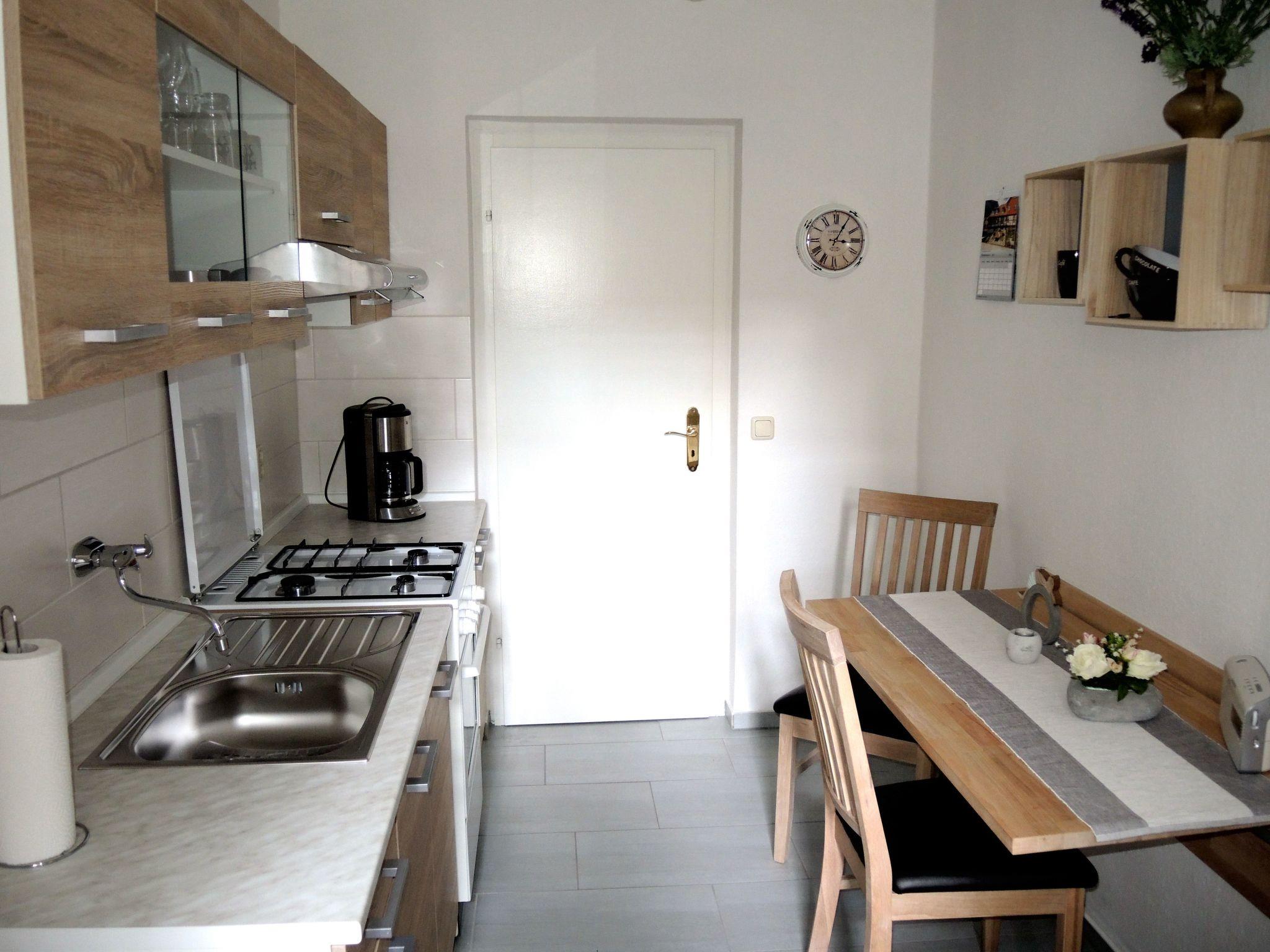 Gemütliche Ferienwohnung direkt im Parterre in unserem zentral aber ruhig gelegenen historischen Fachwerkhaus neben der ältesten Kirche von Wernigerode mit Platz für max. 3 Erwachsene. Der kombinierte Wohn- und Schlafraum ist geschmackvoll eingerichtet und bietet neben einer neuen Möblierung als optisches Highlight auch einen bemalten Schrank aus dem 18. Jahrhundert. Die Fenster zur Straßenseite hin können mit von innen bedienbaren Fensterläden zusätzlich verschlossen werden. Die Wohnküche ist ebenfalls neu eingerichtet und bietet neben einer kompletten Küchenausstattung mit Gasherd, Backofen, Mikrowelle, Kühl- und Gefrierschrank viele weitere nützliche Details. In dem modernen Bad mit Dusche, WC, Spiegelschrank und Haarfön ist außerdem eine Waschmaschine vorhanden.Anreisende und abreisende Feriengäste können zum Be- und Entladen in Hausnähe bzw. je nach Parksituation auch vor dem Haus parken. Ein Dauerparken ist nach der Entscheidung des Landkreises in der Innenstadt von Wernigerode nur noch kostenpflichtig auf den ausgewiesenen Parkplätzen bzw. im Parkhaus in der Pfarrstraße möglich. Dementsprechend werden vom Ordnungsamt der Stadt Wernigerode keine Jahresparkgenehmigungen mehr an die Vermieter von Ferienwohnungen ausgegeben.Bitte beachten Sie: Die Parkregelungen der Stadt Wernigerode und des Landreises Harz unterliegen laufenden Änderungen. Auf Grund höherer Gewalt kann ich als Vermieter daher keine Garantien abgeben.