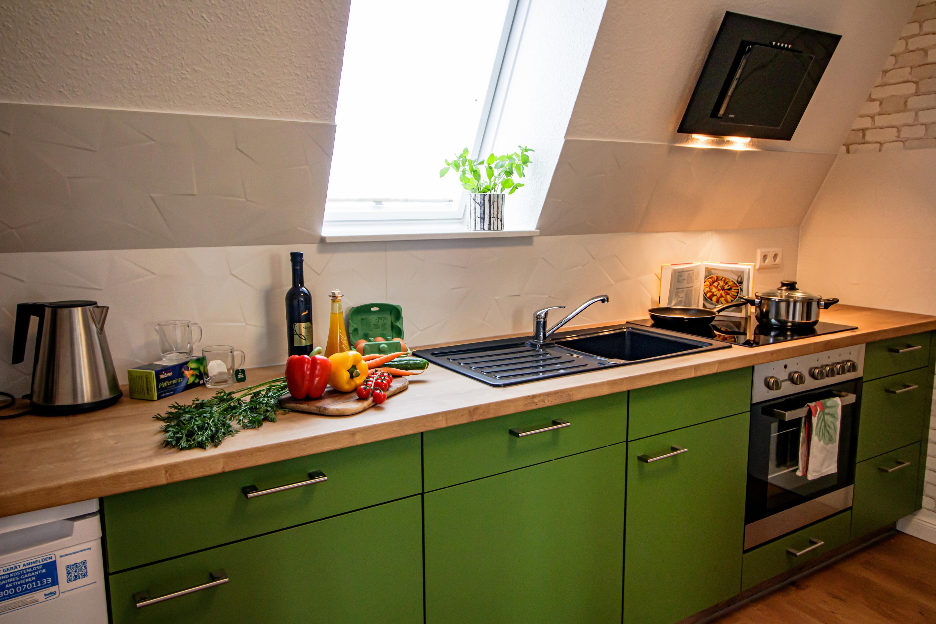 Für einen Aufenthalt von 4 Personen ist Ihre Nichtraucher-Unterkunft im zweiten OG optimal. Der Wohnbereich mit großem Esstisch grenzt an eine moderne Küche, die mit allem eingerichtet ist, was das Herz begehrt - Ceranfeld, Backofen, Kühlschrank, Geschirrspüler etc.