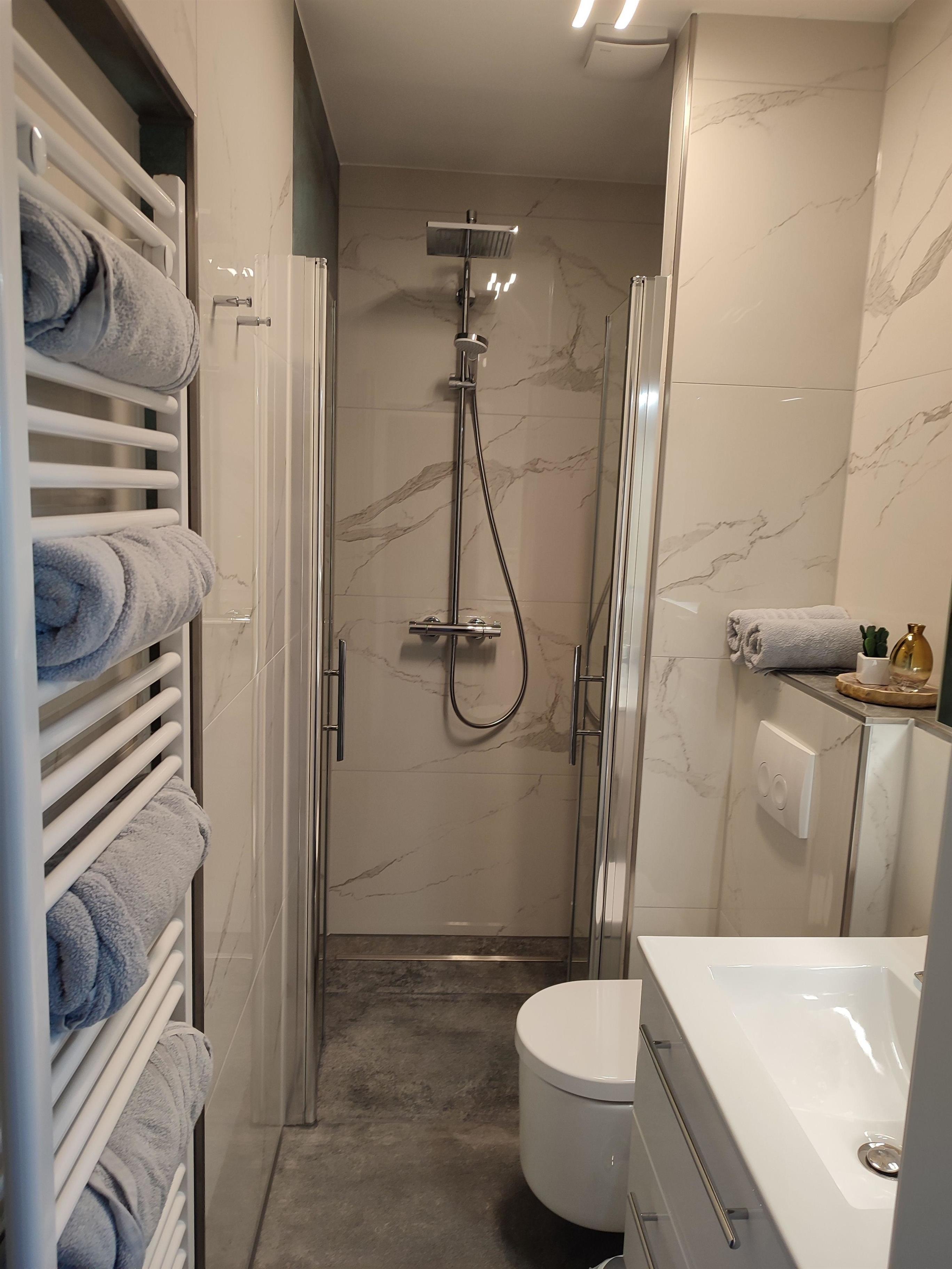 Im Badezimmer haben Sie einen großzügigen Duschbereich mit Sitzmöglichkeit.