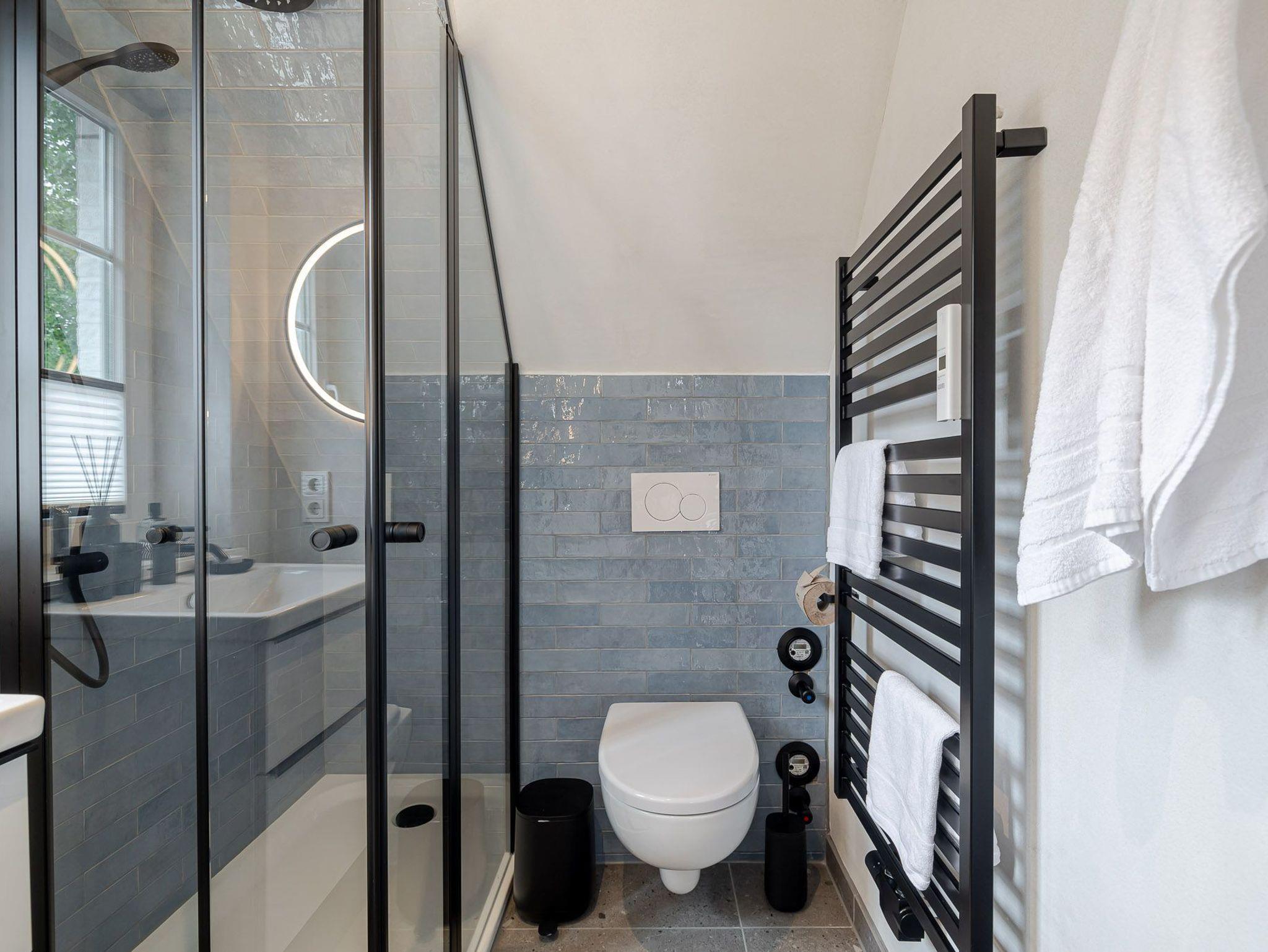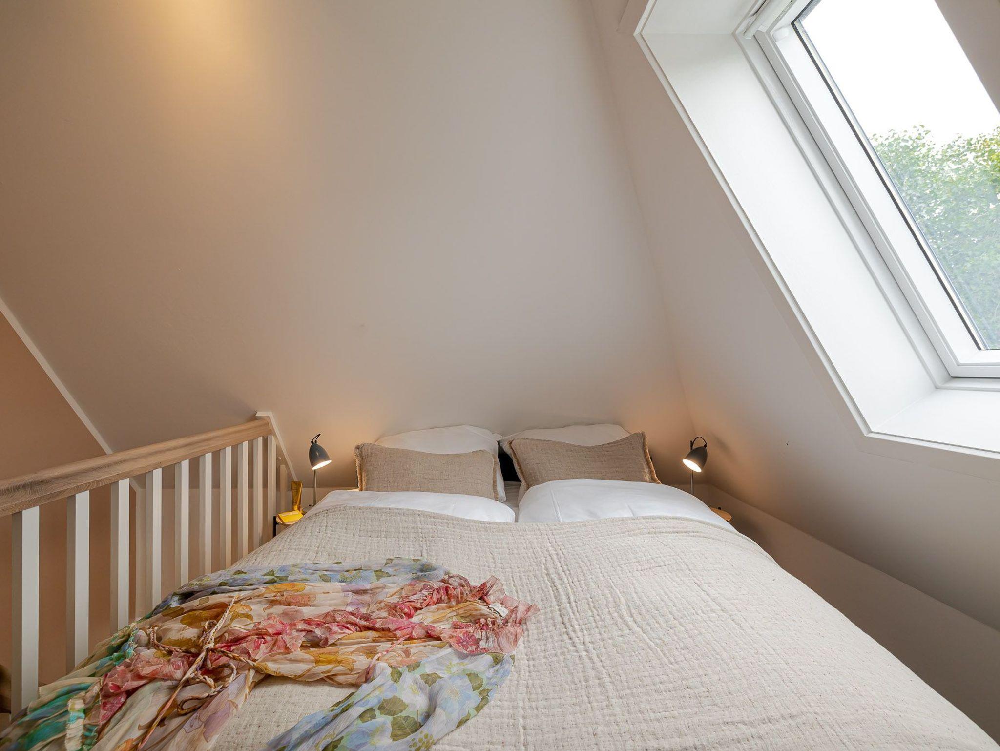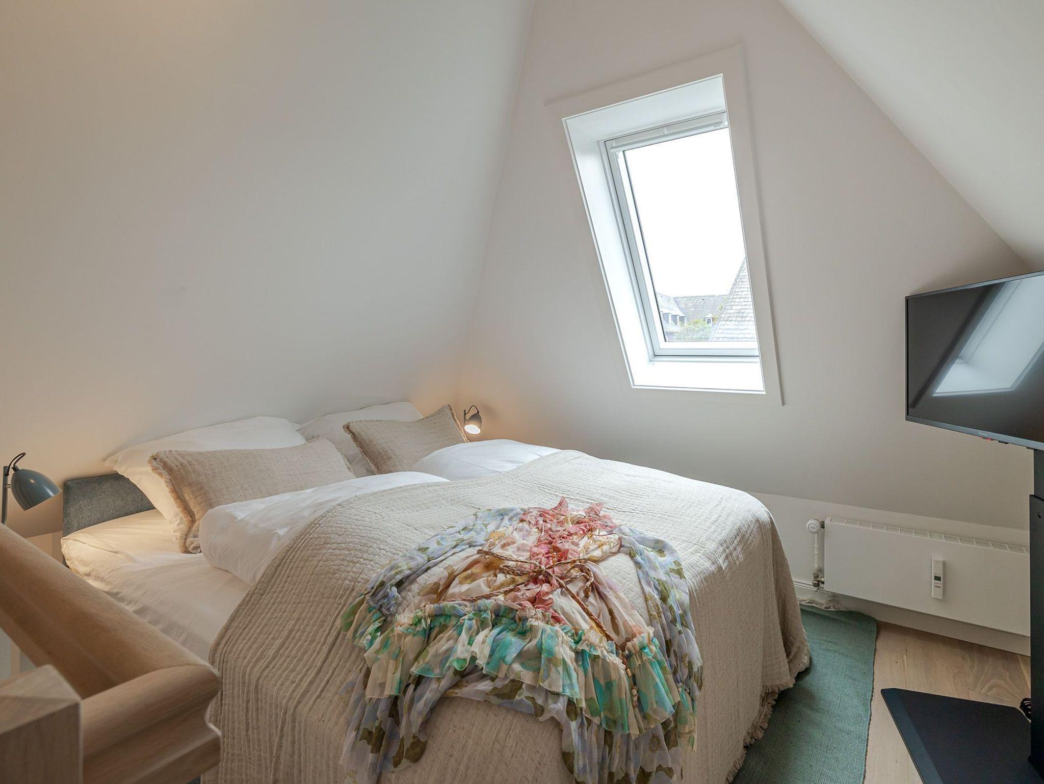 Am Abend ist der Weg das Ziel, und zwar geht es nun über die Treppe nach oben, auf Ihr Oberdeck! Hier werden Sie herrlich ruhige Nächte in einem exklusiven Boxspringbett der Marke Schramm genießen können. Tipp: Öffnen Sie das Fenster und lassen Sie die gesunde Nordseeluft ruhig hinein.