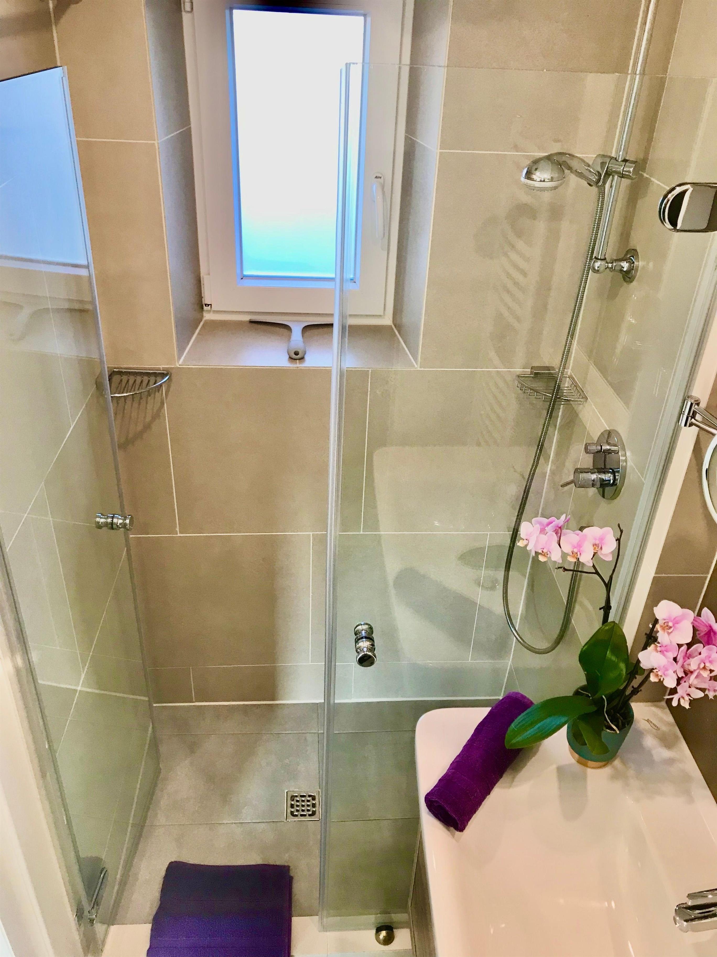 Ein neues Bad mit bodengleicher Dusche, Rainshower, WC, Waschtisch, Handtuchtrockner und Fön.