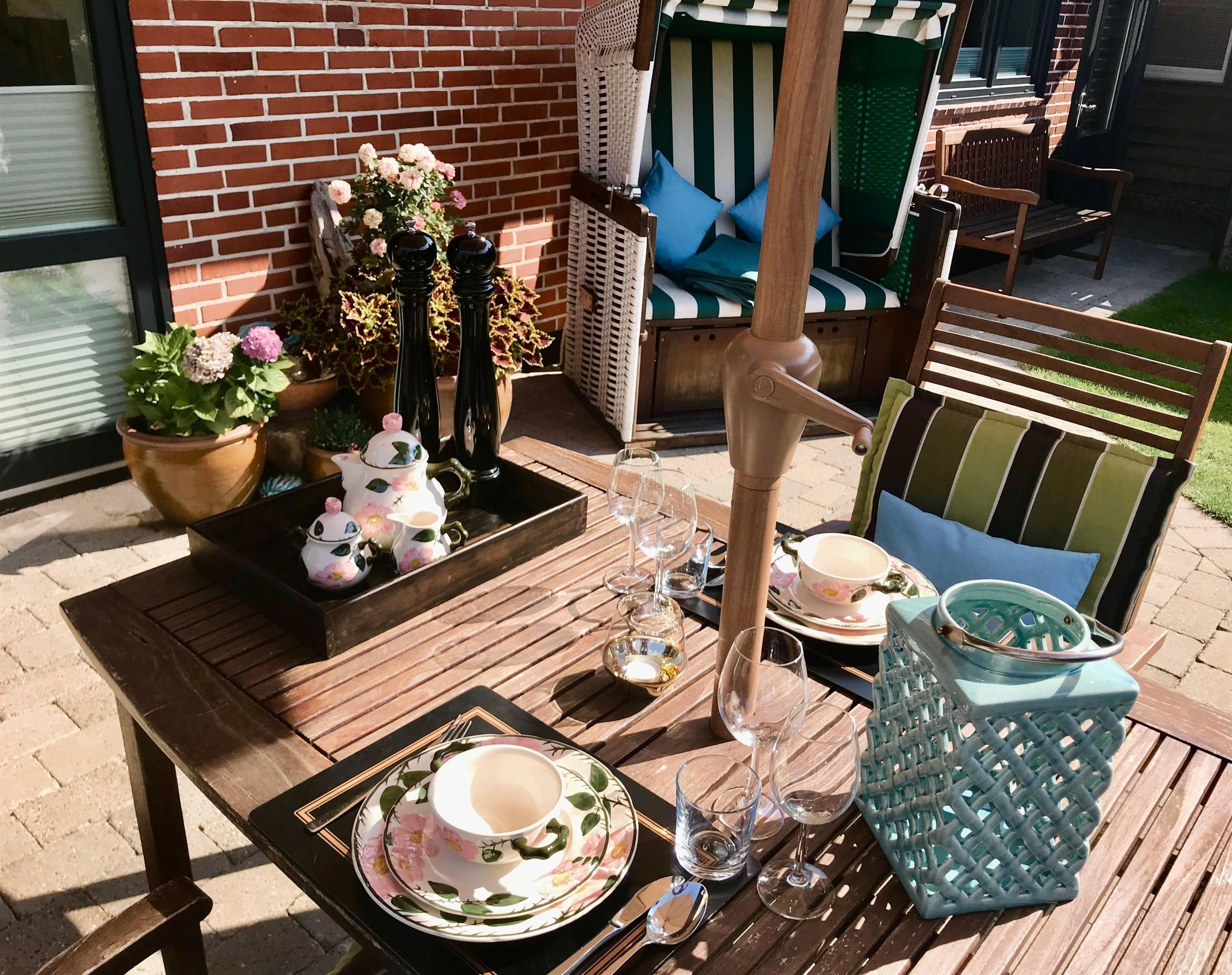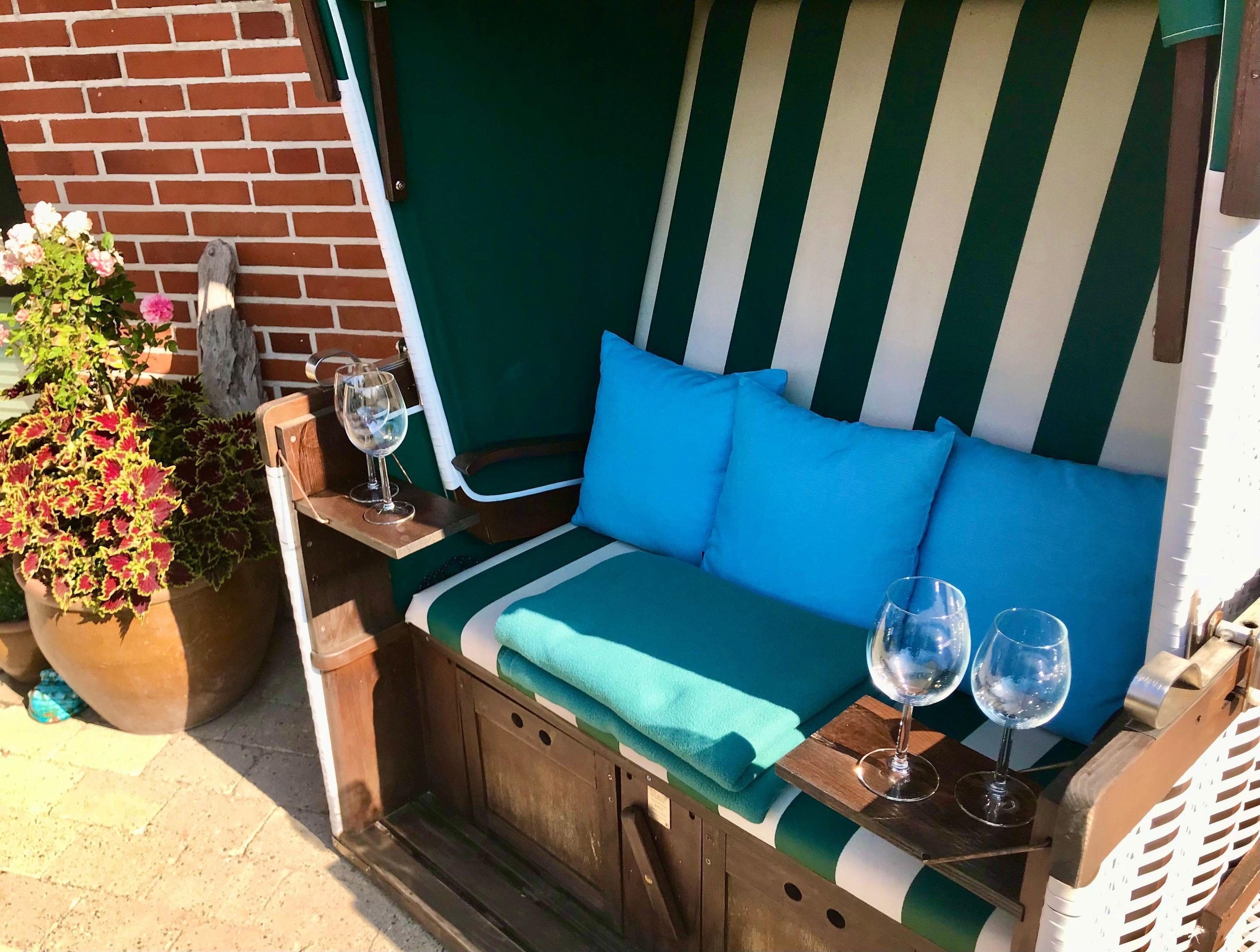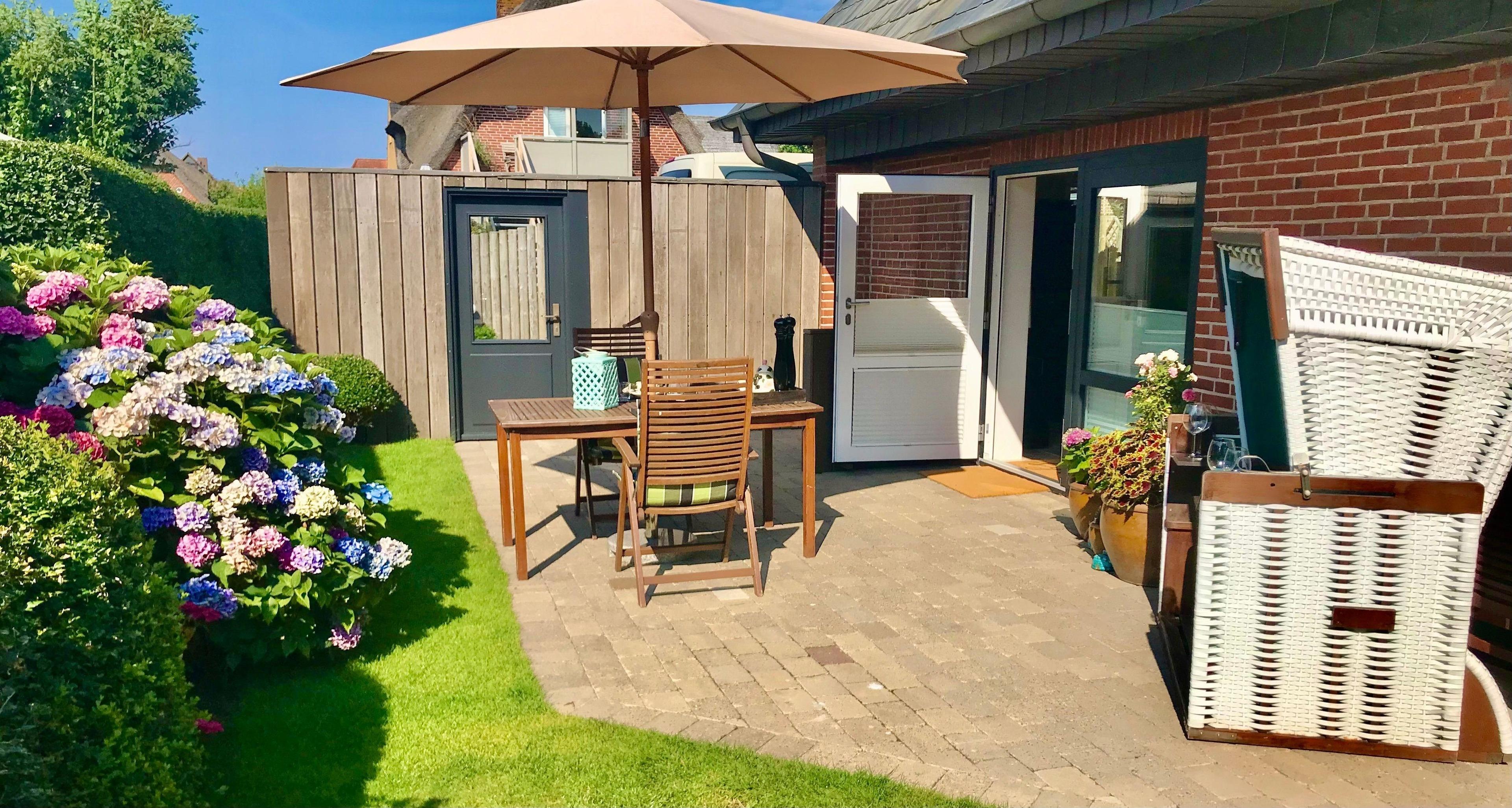 Die Wohnung verfügt über eine an der Südseite des Hauses gelegene, eigene, uneinsehbare, möblierte Terrasse mit Sonnenschirm und Sylter Strandkorb.
