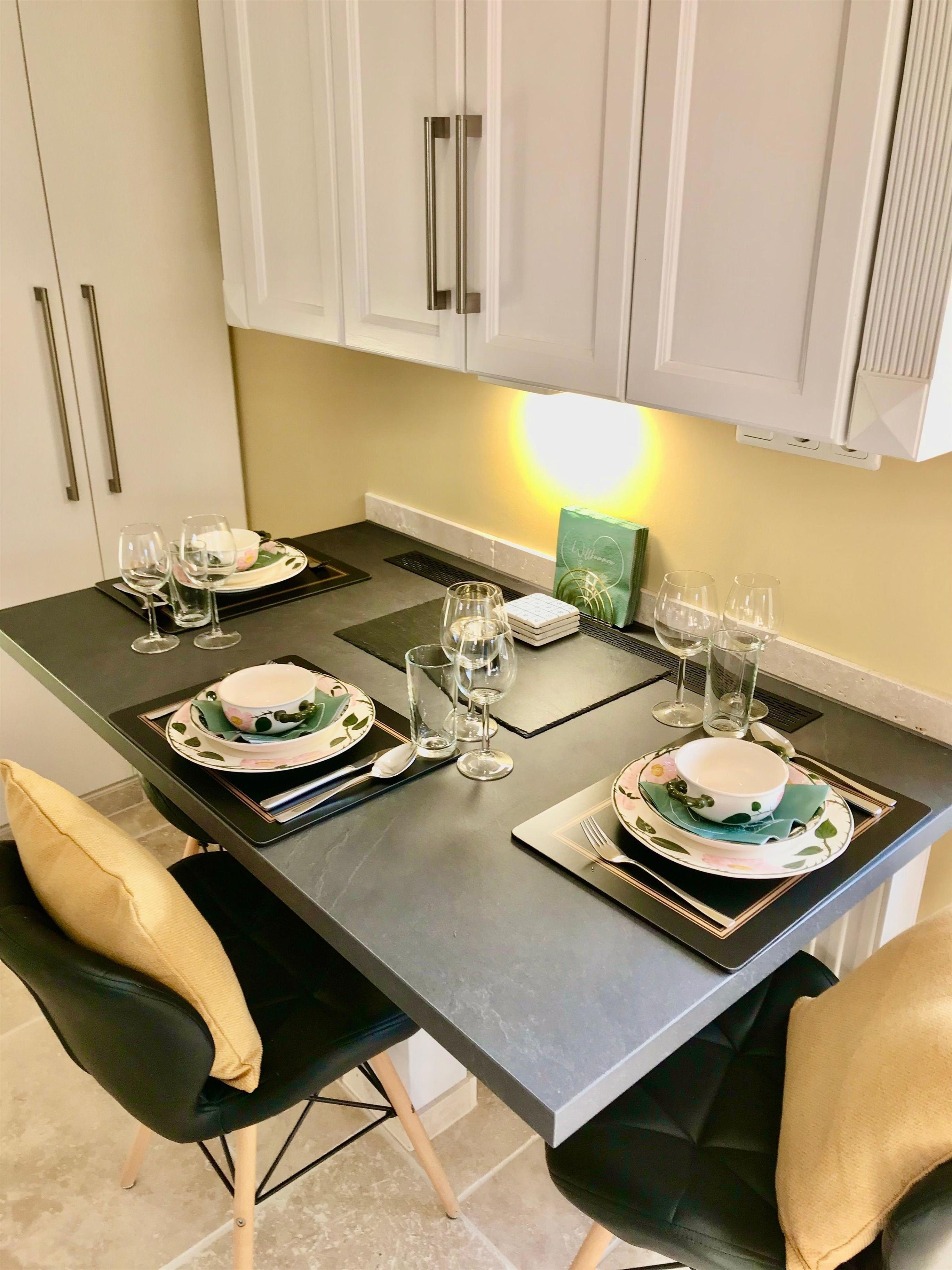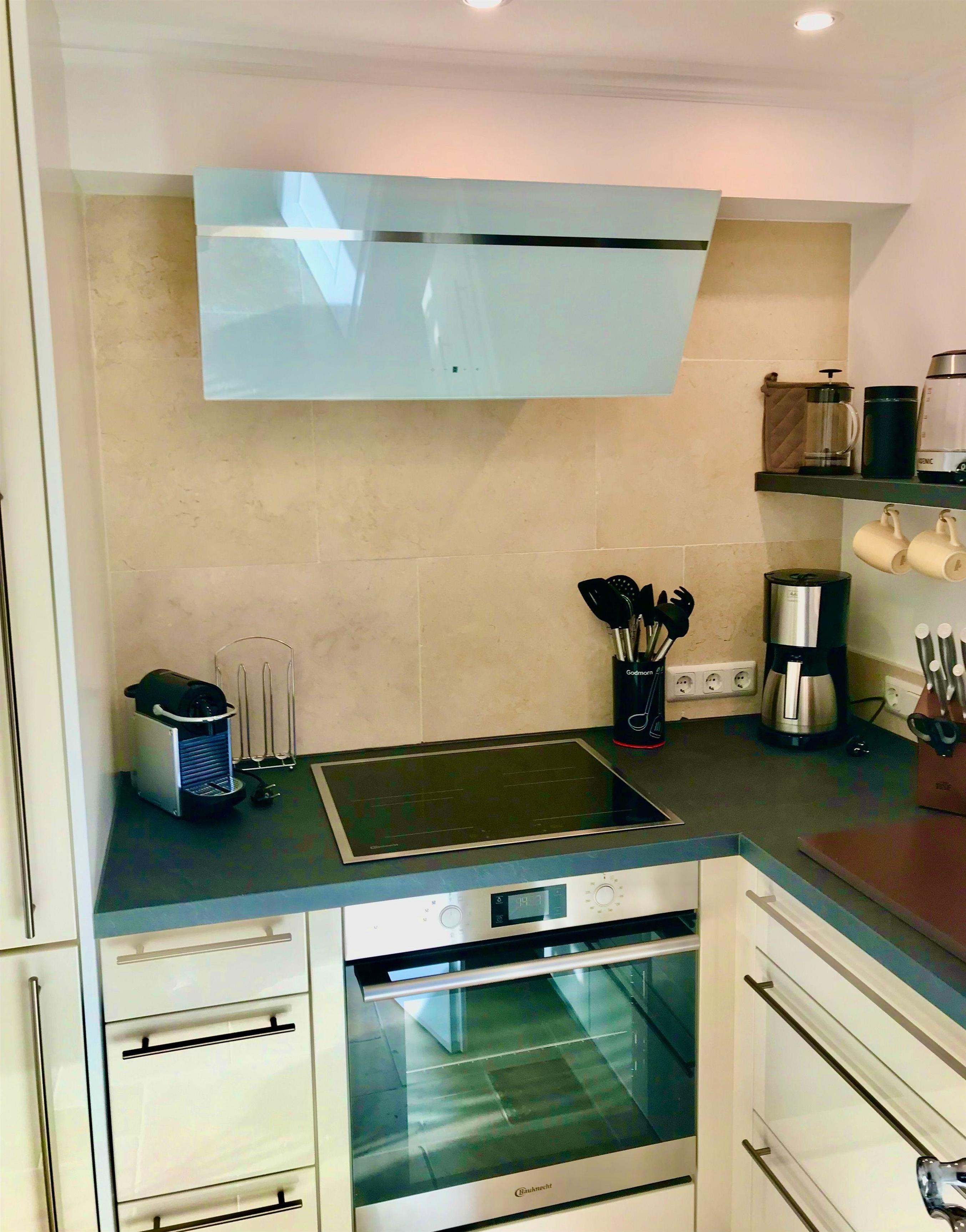 Moderne Küche mit Ceran- Kochfeld, Backofen, Kühlschrank, Geschirrspüler, Waschmaschine, Espresso- Maschine (Nespresso), Filter- Kaffeemaschine, Wasserkocher und Toaster sind selbstverständlich.