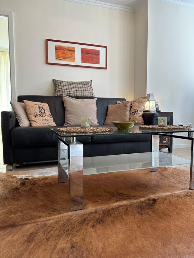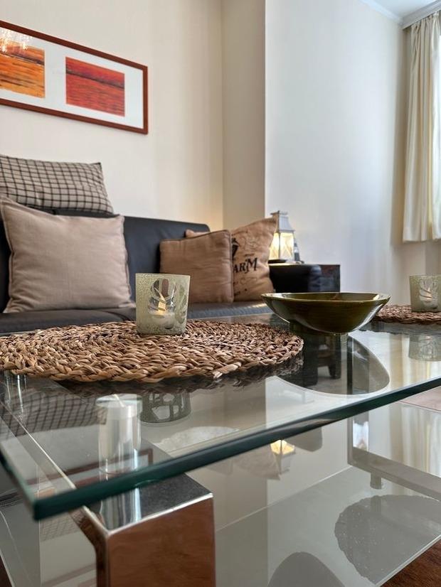 Der hübsche Wohnraum ist mit Vinyl-Designer-Boden ausgelegt, eine Schlafcouch, einen Esstisch mit 4 Stühlen, einen Vitrinenschrank, Flachbild-TV, WLAN (ohne Gewähr) und eine Stereoanlage runden das Bild ab. Im Schlafzimmer befindet sich ein helles Doppelbett und ein heller Kleiderschrank sowie ein weiterer Flachbildfernseher. Ein sonniger Südbalkon schließt sich mit einem seitlichem Meerblick an. Eine vanillefarbene Einbauküche mit 4-Platten-Ceranfeld, Geschirrspülmaschine und eine Mikrowelle mit Grill stehen Ihnen selbstverständlich zur Verfügung. Der Boden ist mit terracottafarbenen Fliesen ausgelegt. Im weißen Badezimmer befindet sich eine Dusche (die Duschkabine wurde im März 2019 erneuert) und eine Handtuchheizung. Ein Haarföhn steht Ihnen auch zur Verfügung.
