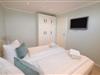 Das Schlafzimmer ist mit einem komfortablen Boxspring-Doppelbett (Liegefläche 1,80 x 2,00m, Einzelmatratzen) ausgestattet. Auf Wunsch kann das Bett in zwei Einzelbetten umgewandelt werden. Im neuen, großzügigen Badezimmer befinden sich eine Dusche mit extra flachem Einstieg, zusätzlich eine kleine Badewanne, ein Waschtisch, ein Handtuchtrockner, sowie WC.