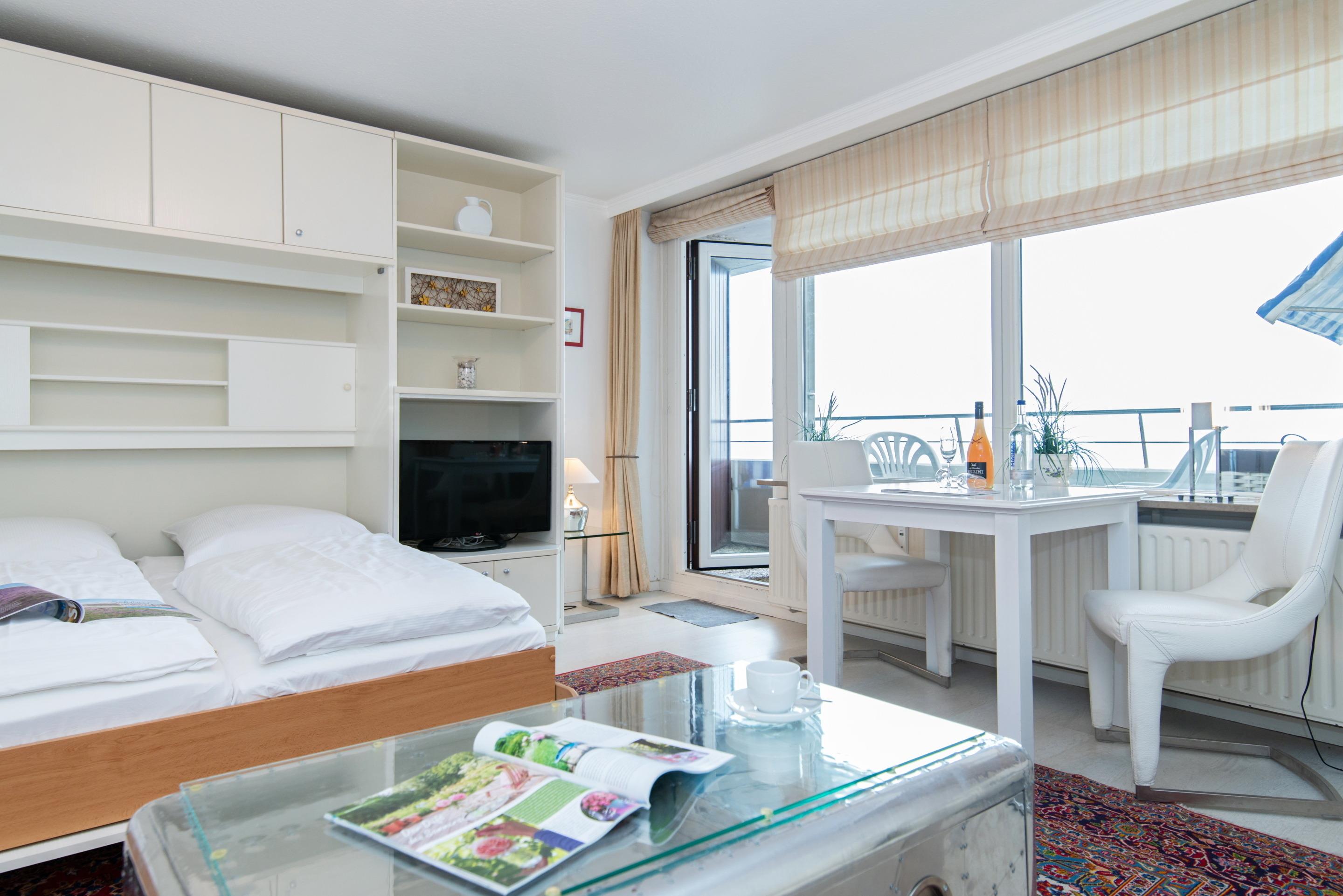 Angeboten wird Ihnen ein 1-Zimmer-Nichtraucher-Appartement (ca. 43 qm) in der 3. Etage mit Meerblick und Westloggia (Nachmittagssonne/Sonnenuntergang) für 2 Personen.