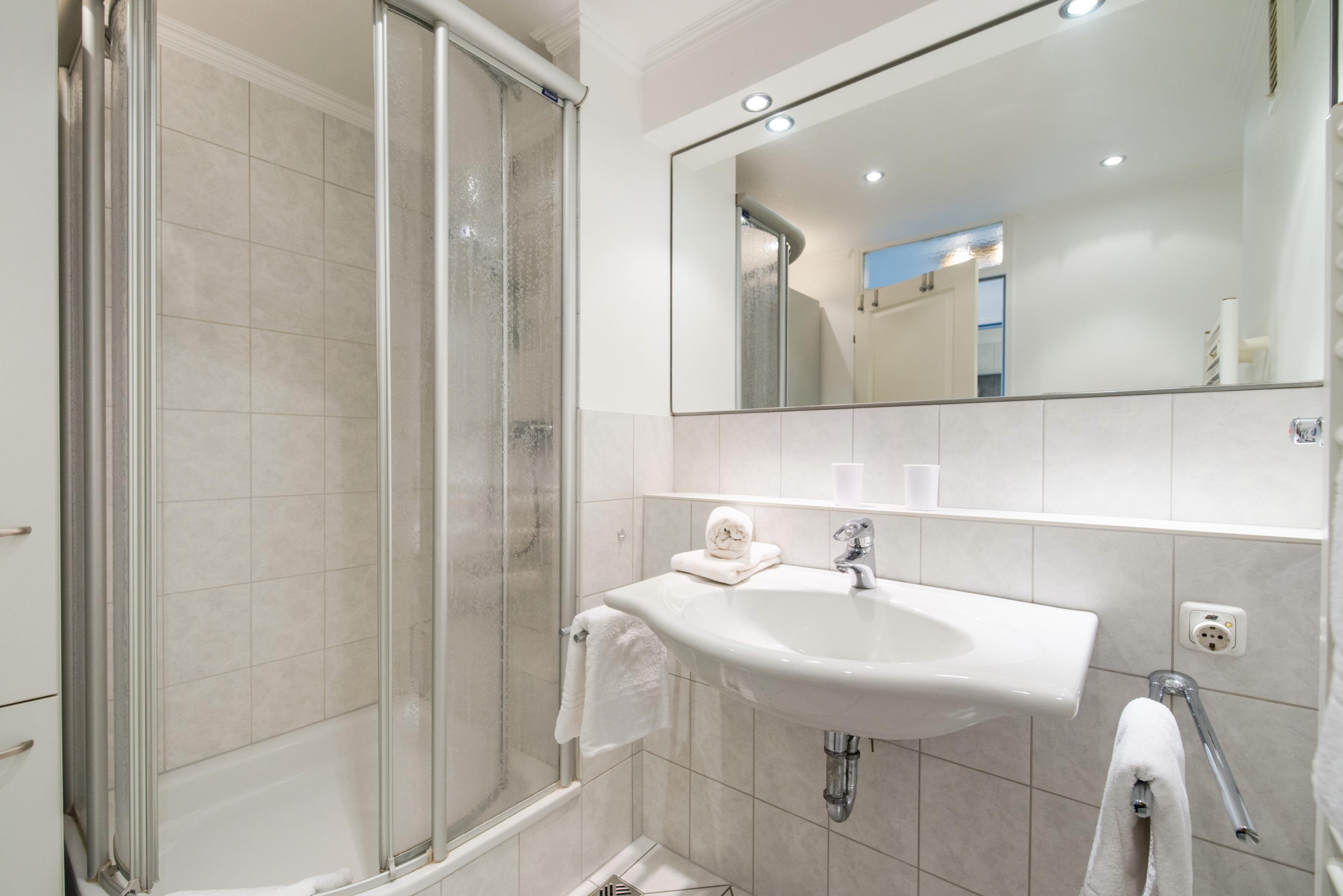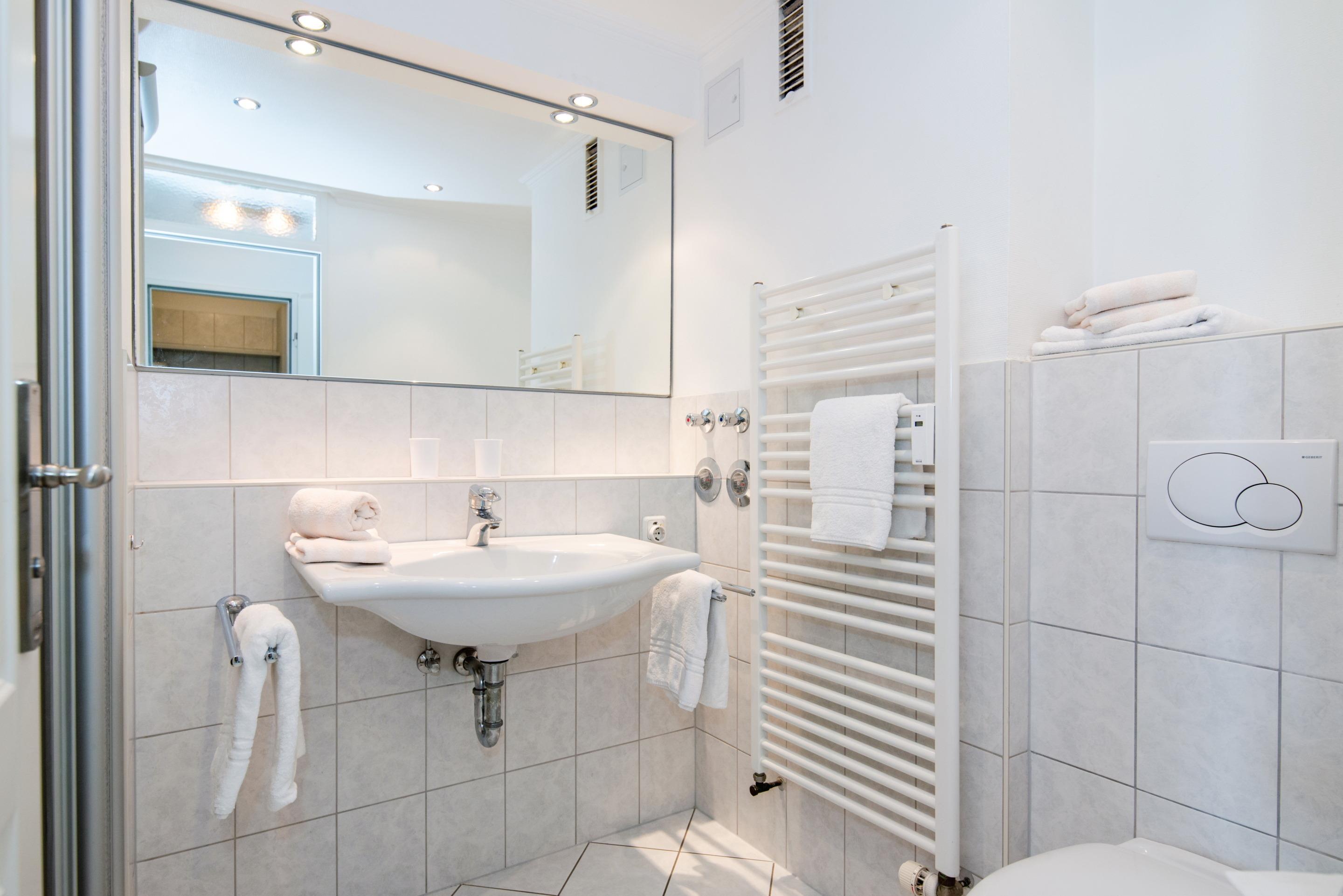 Das Bad hat eine Dusche, ein WC und ein Waschtisch.