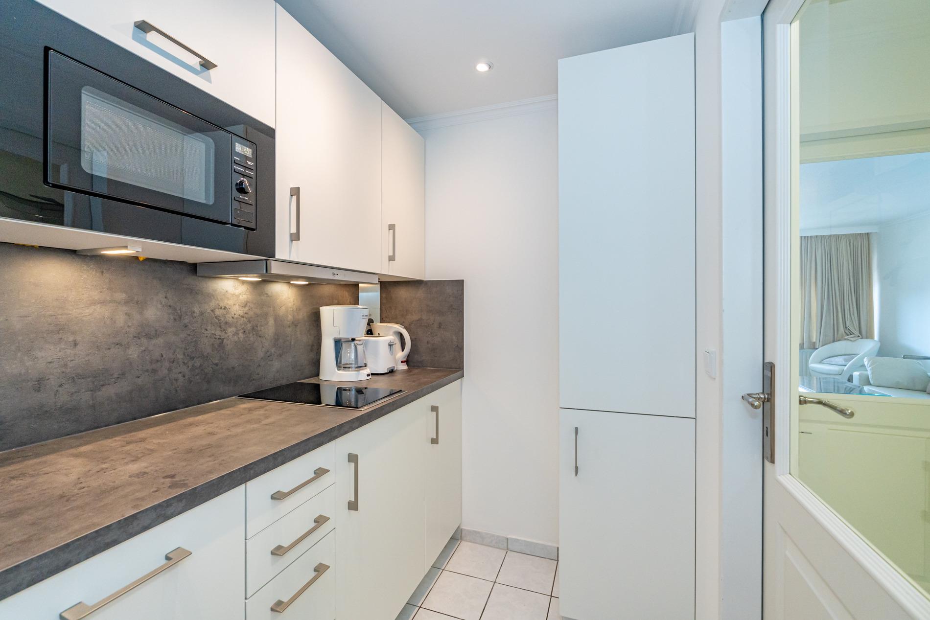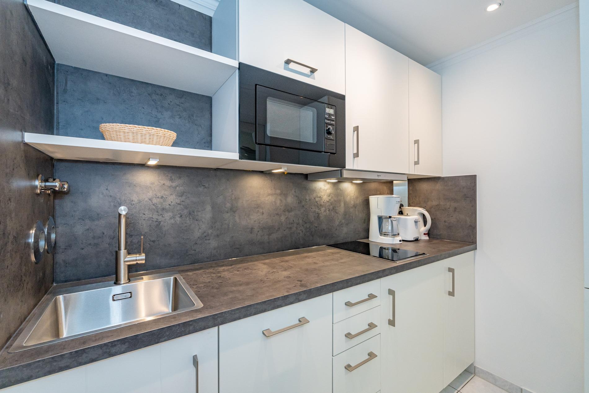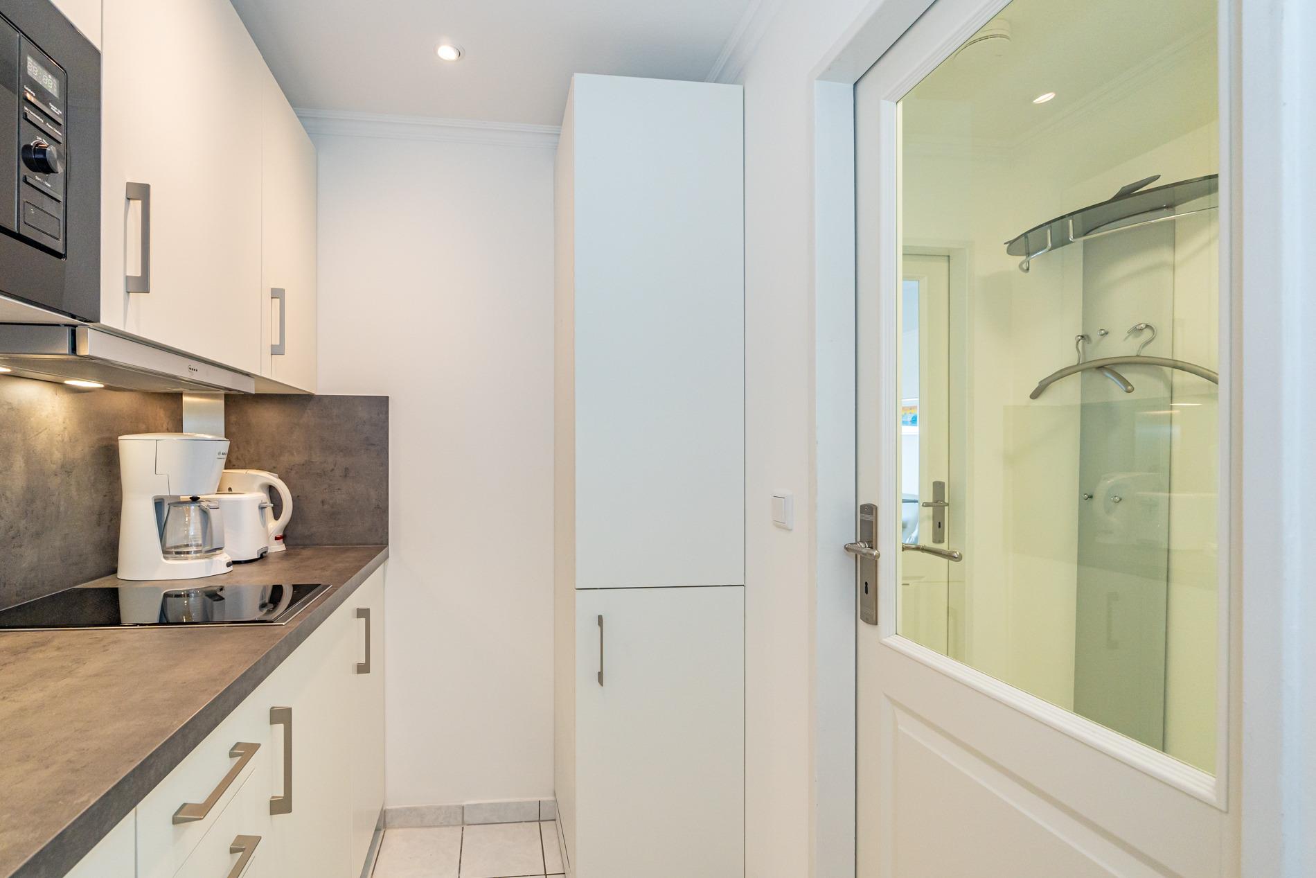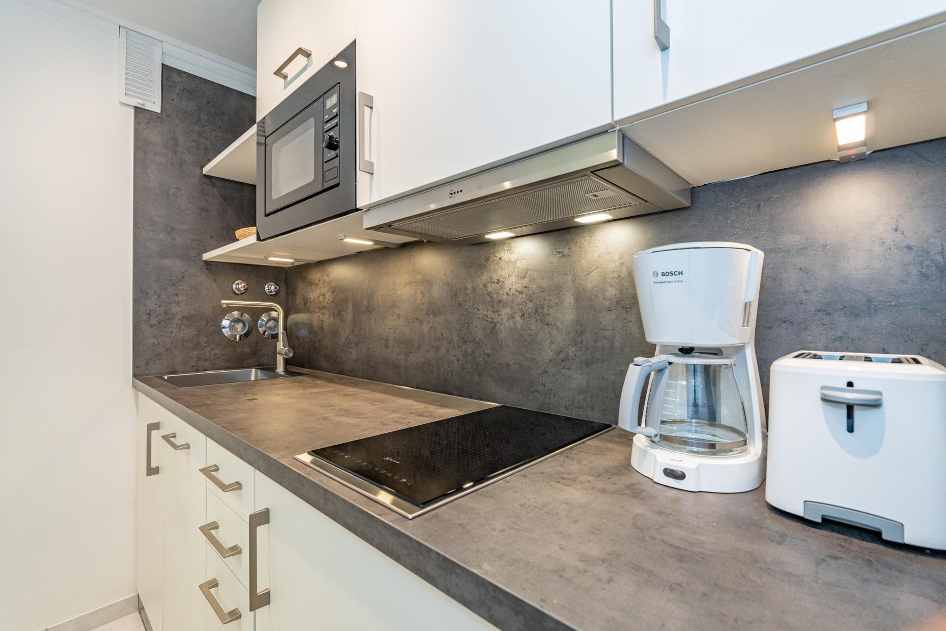 Die Küche hat eine Mikrowelle, ein Cerankochfeld, einen Geschirrspüler und einen Kühlschrank mit 3*-Gefrierfach. Kaffeemaschine, Wasserkocher und Toaster gehören zur Grundausstattung.