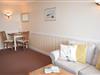 Der gemütliche Wohn-/Schlafraum besteht aus einem 2-Sitzer-Sofa, einem Sessel, einem Essplatz, einem Doppelschrankbett (einzeln klappbar), Flachbild-TV. Die Küchenzeile hat ein Induktionskochfeld, einen Geschirrspüler, eine Mikrowelle und einen Kühlschrank. Kaffeemaschine, Wasserkocher und Toaster gehören zur Grundausstattung.