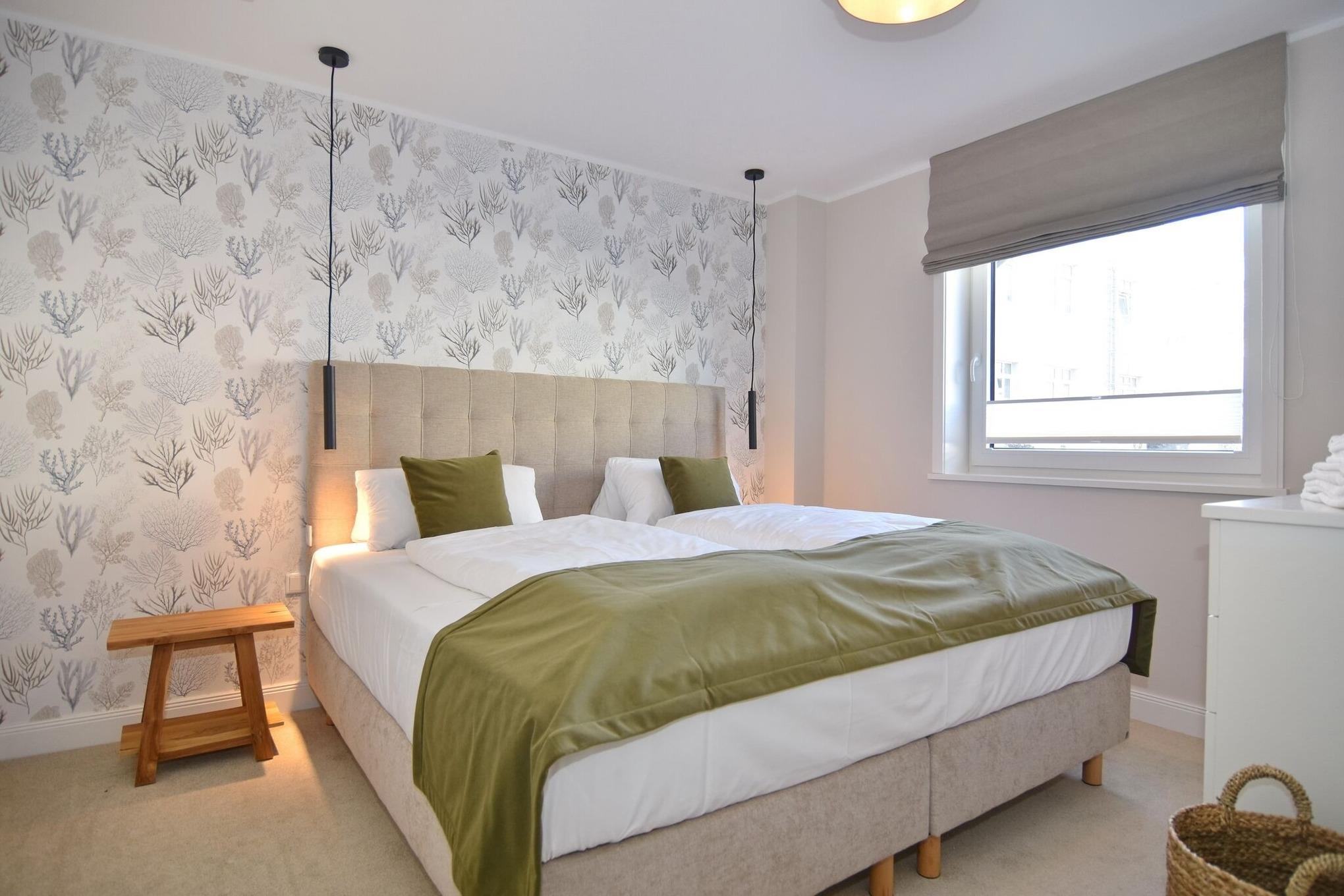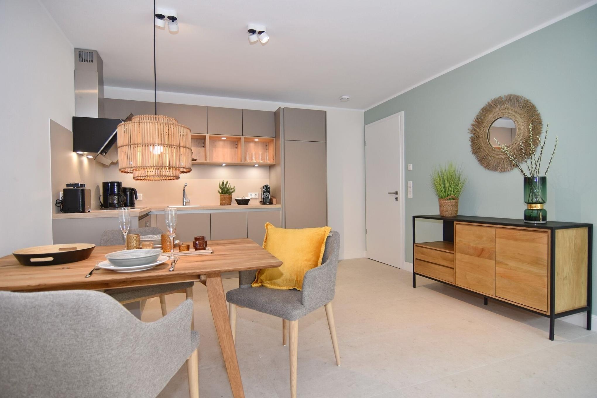 Die hochwertige 3-Zimmer-Erdgeschosswohnung mit ca. 60 qm ist für maximal 3 Personen ausgestattet. Vom geräumigen Flur mit Garderobe gelangen Sie in das Wohnzimmer mit offener Küche und möblierter Südterrasse. Die hochwertige Küche bietet neben Induktionsherd auch Geschirrspüler, Kühlschrank mit Gefrierfach und Backofen mit integrierter Mikrowelle. Die Wohnung bietet Ihnen zwei Schlafräume und ein Duschbad /WC mit Haar- und Handtuchtrockner. Das große Schlafzimmer ist mit einem Boxspringbett (200x200) der Marke FBF, Flat-TV und Einbauschrank ausgestattet (1 Kinderbett zubuchbar), das kleine Schlafzimmer hat ein vom Tischler eingebautes Einzelbett (90x200) und einen kleinen Einbauschrank.