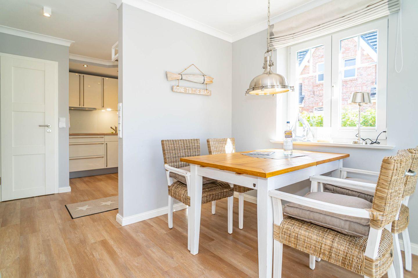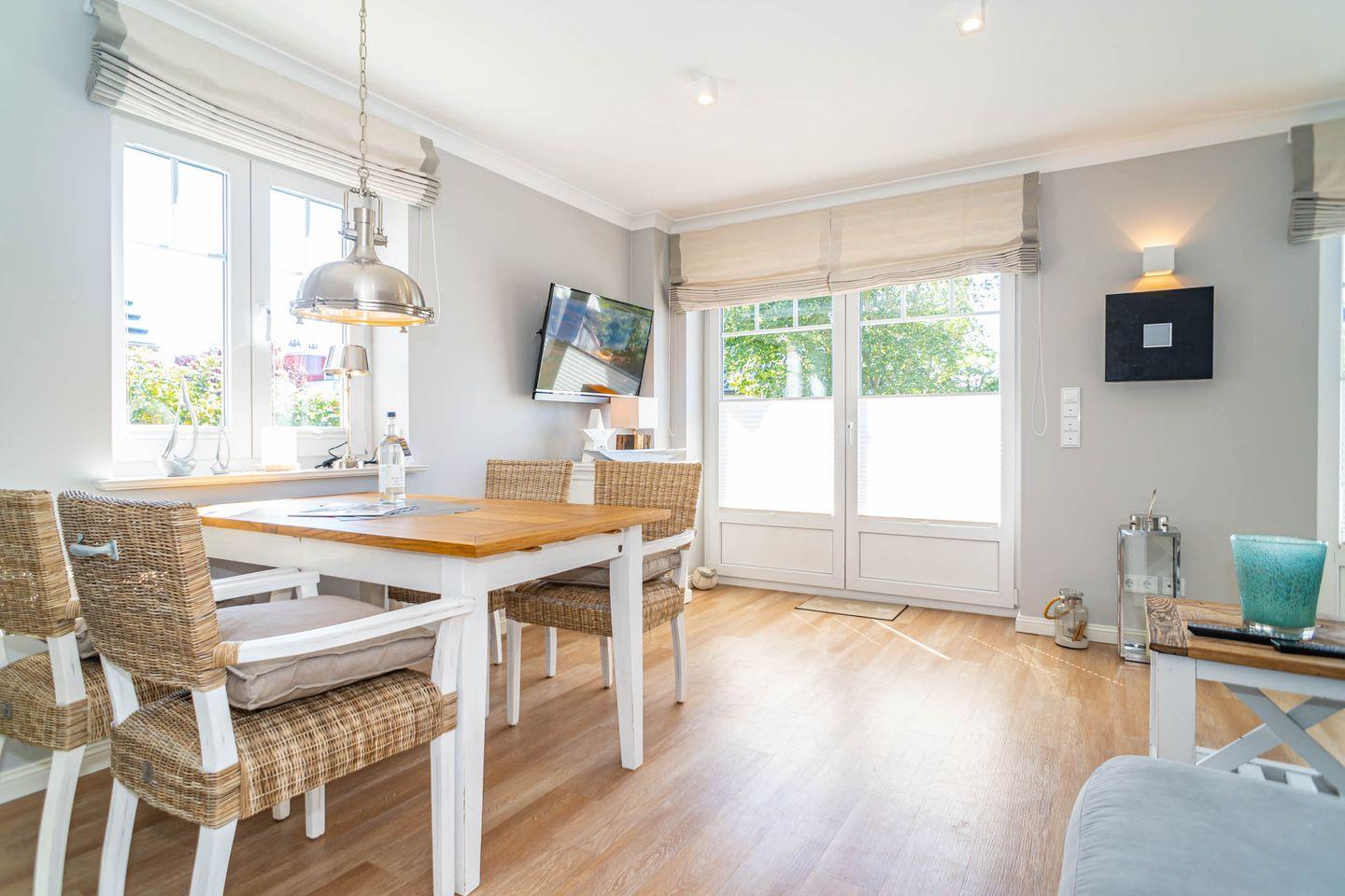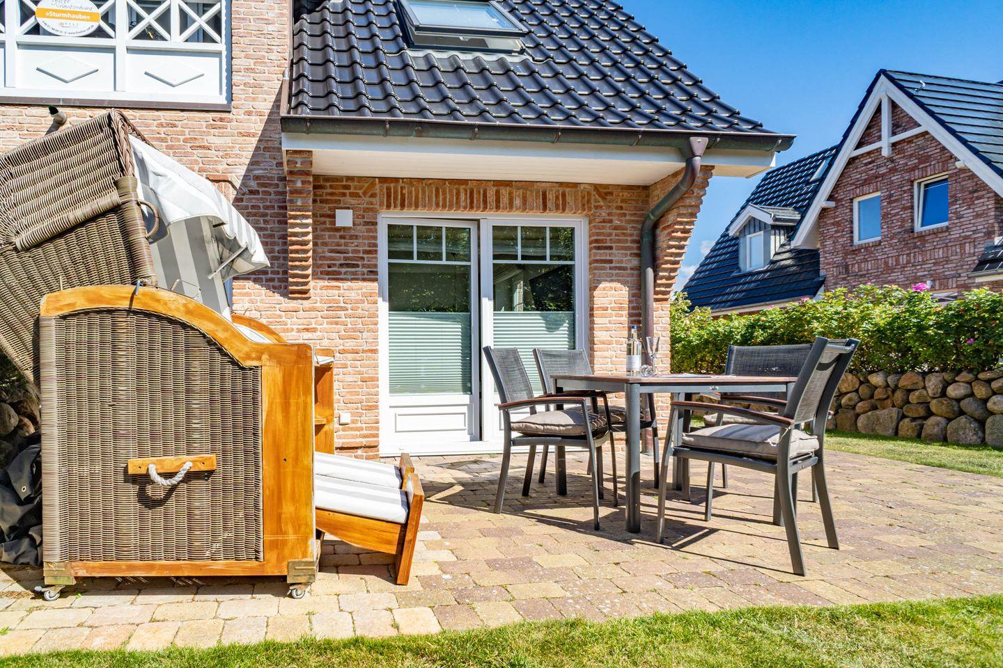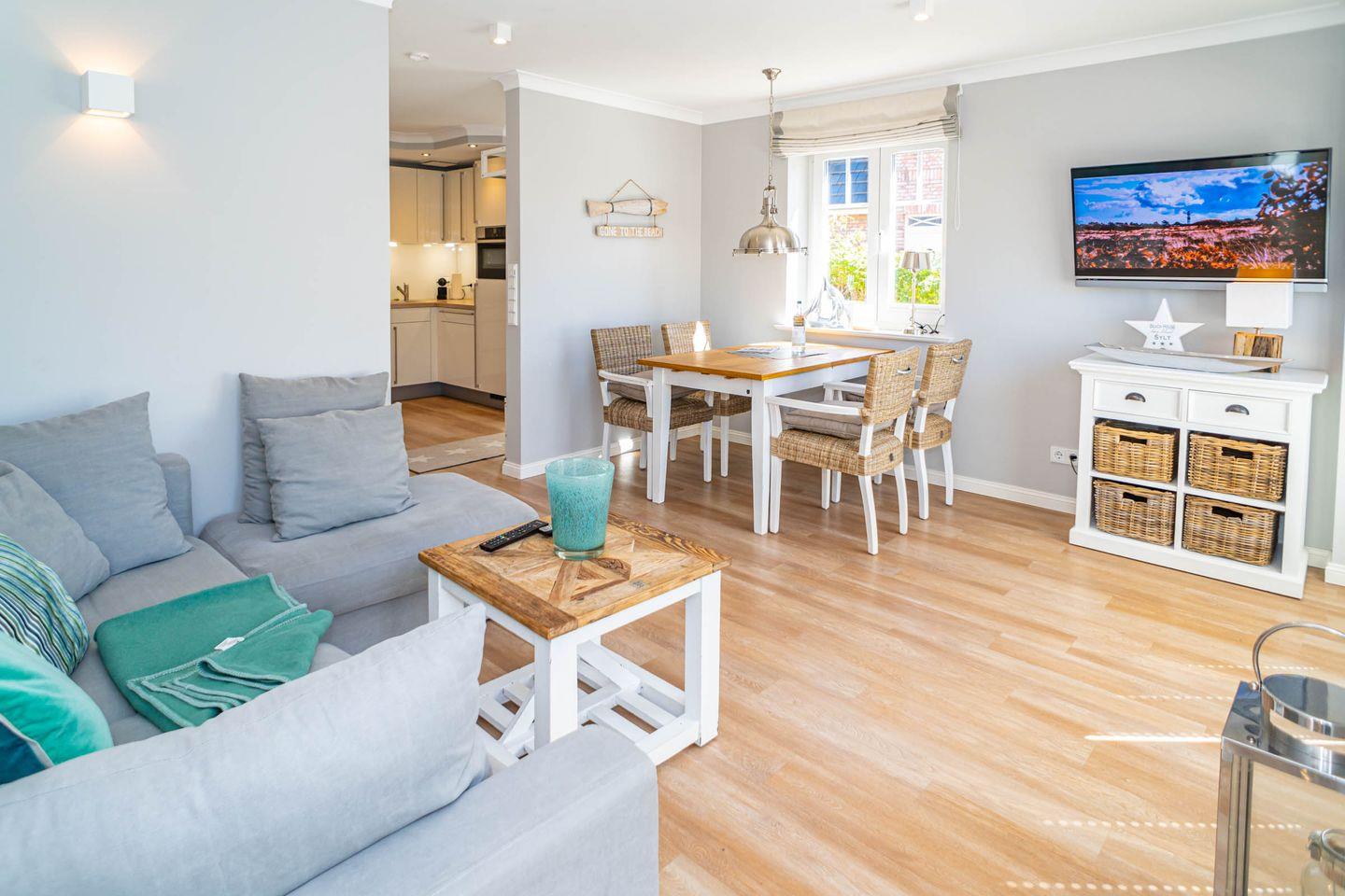 Die Ferienwohnung bietet zwei Schlafzimmer, eine offene Küche und ein behagliches Wohnzimmer mit Zugang zur Terrasse, ideal für entspannte Stunden im Freien. Entspannen Sie im Garten im typisch Sylter Strandkorb.