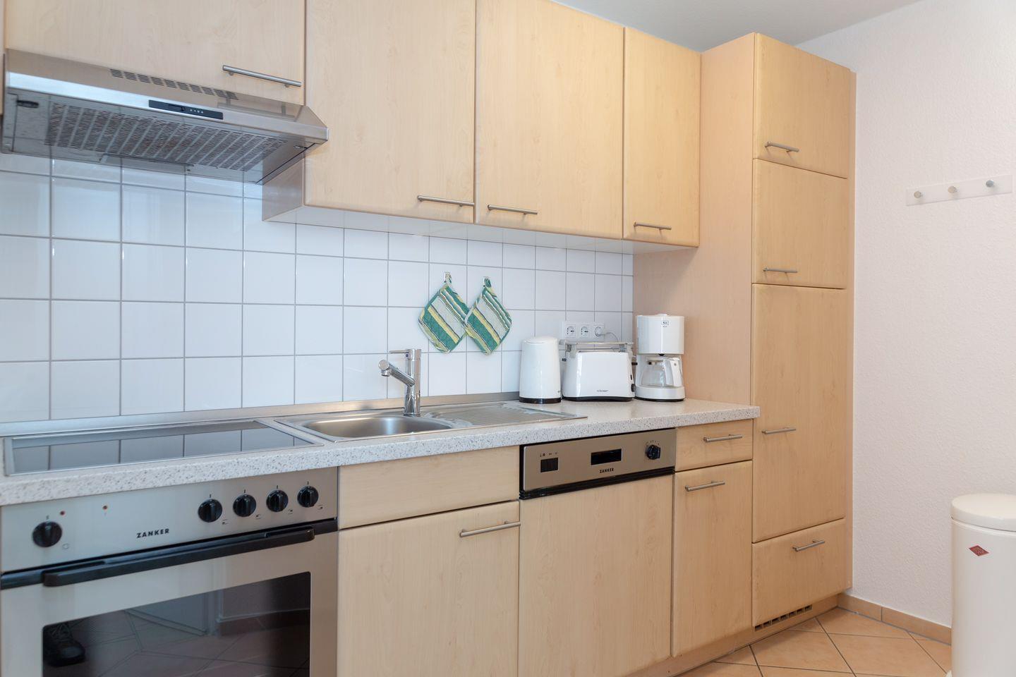 Separate Küche mit Geschirrspüler, Ceranherd Backofen und Kühl-Gefrierkombi.