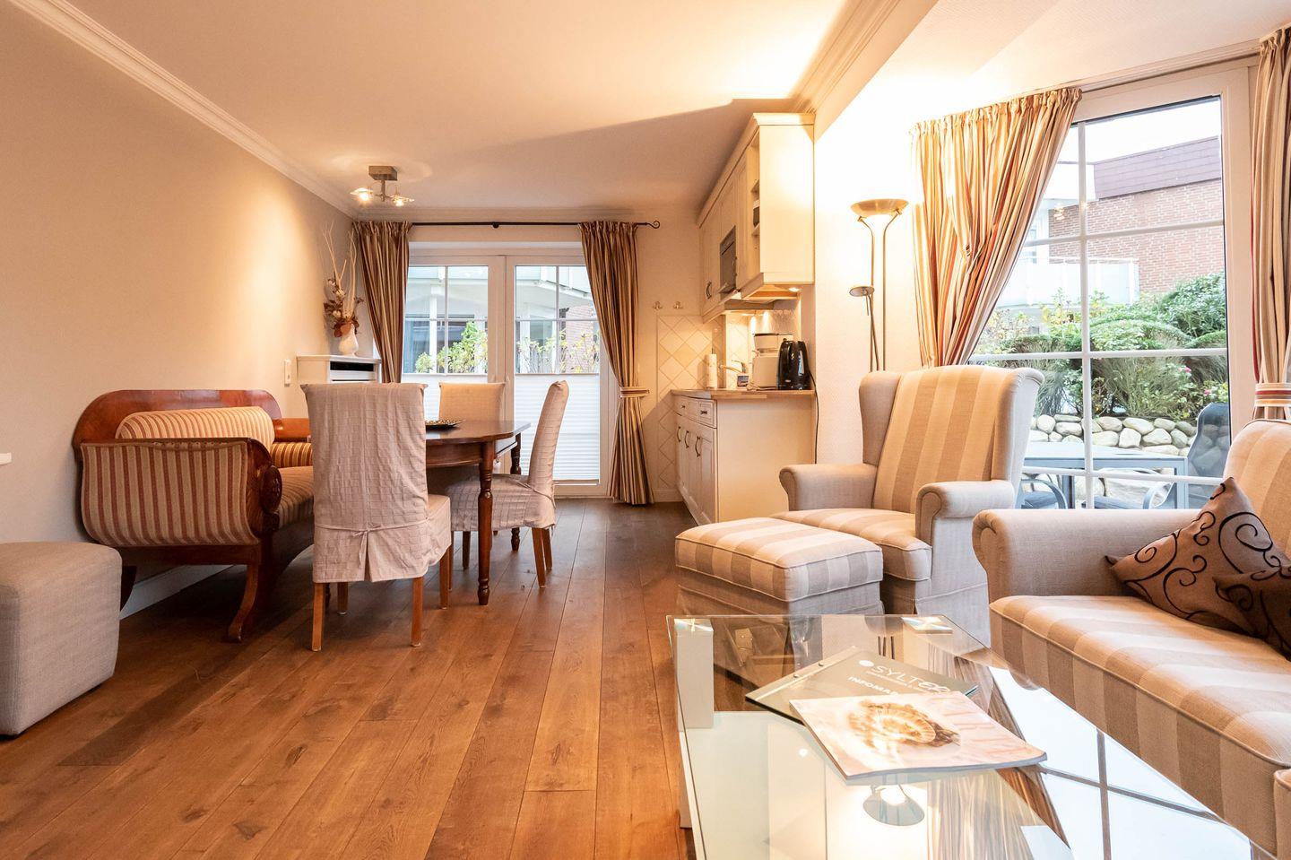 Ferienwohnung im Landhausstil mit 2 Zimmern auf ca. 60 m², für max. 4 Personen. Hier erwartet Sie ein hell eingerichtetes Feriendomizil in reiner Erdgeschosslage in ruhiger und dennoch zentraler, strandnaher Lage von Westerland.