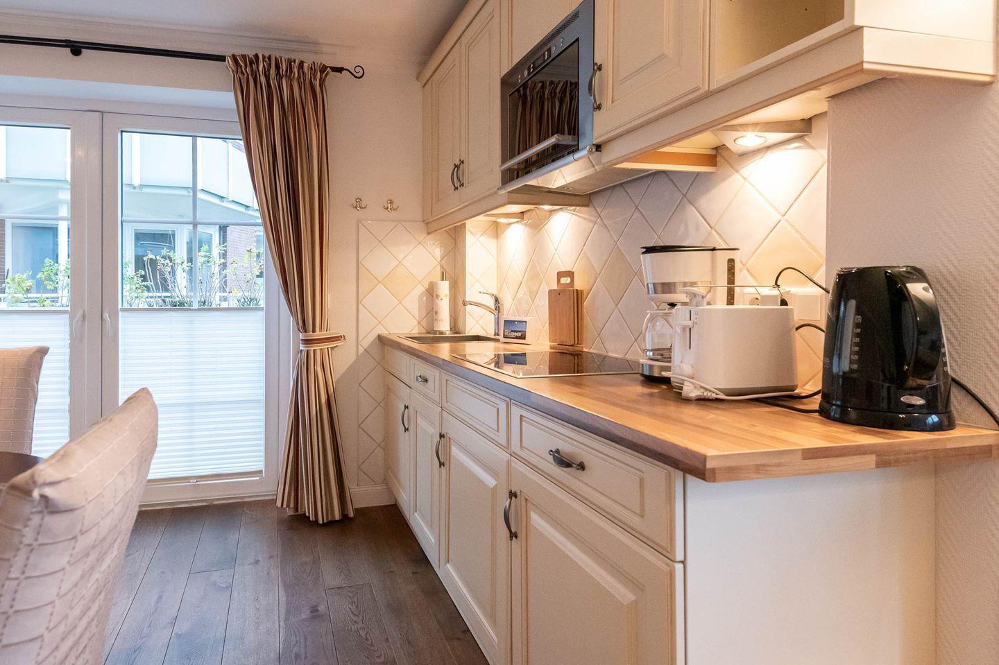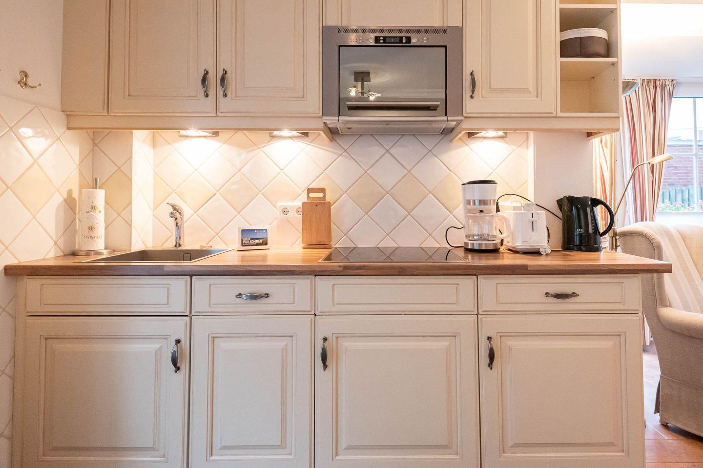 Wohn-/Koch-/Essbereich: Geräumiger Wohnraum mit einer Sofaecke, Sessel & TV. Bei dem Sofa handelt es sich um ein Schlafsofa, welches in ausgezogenem Zustand eine Liegefläche von 1,50 m x 2,00 m hat und einen Schlafplatz für zwei weitere Personen bietet. Der antike Essbereich mit gemütlichem Sofa lädt zu geselligen Mahlzeiten ein. Die halboffene und im Landhausstil eingerichtete Küche ist gut ausgestattet.