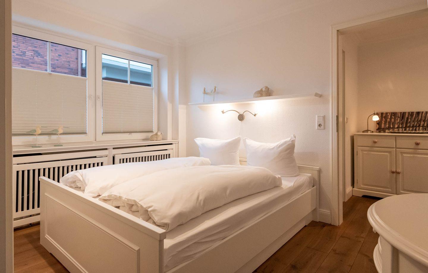 Schlafzimmer 1: Doppelbett, Einbauschränke, TV und Fenster.