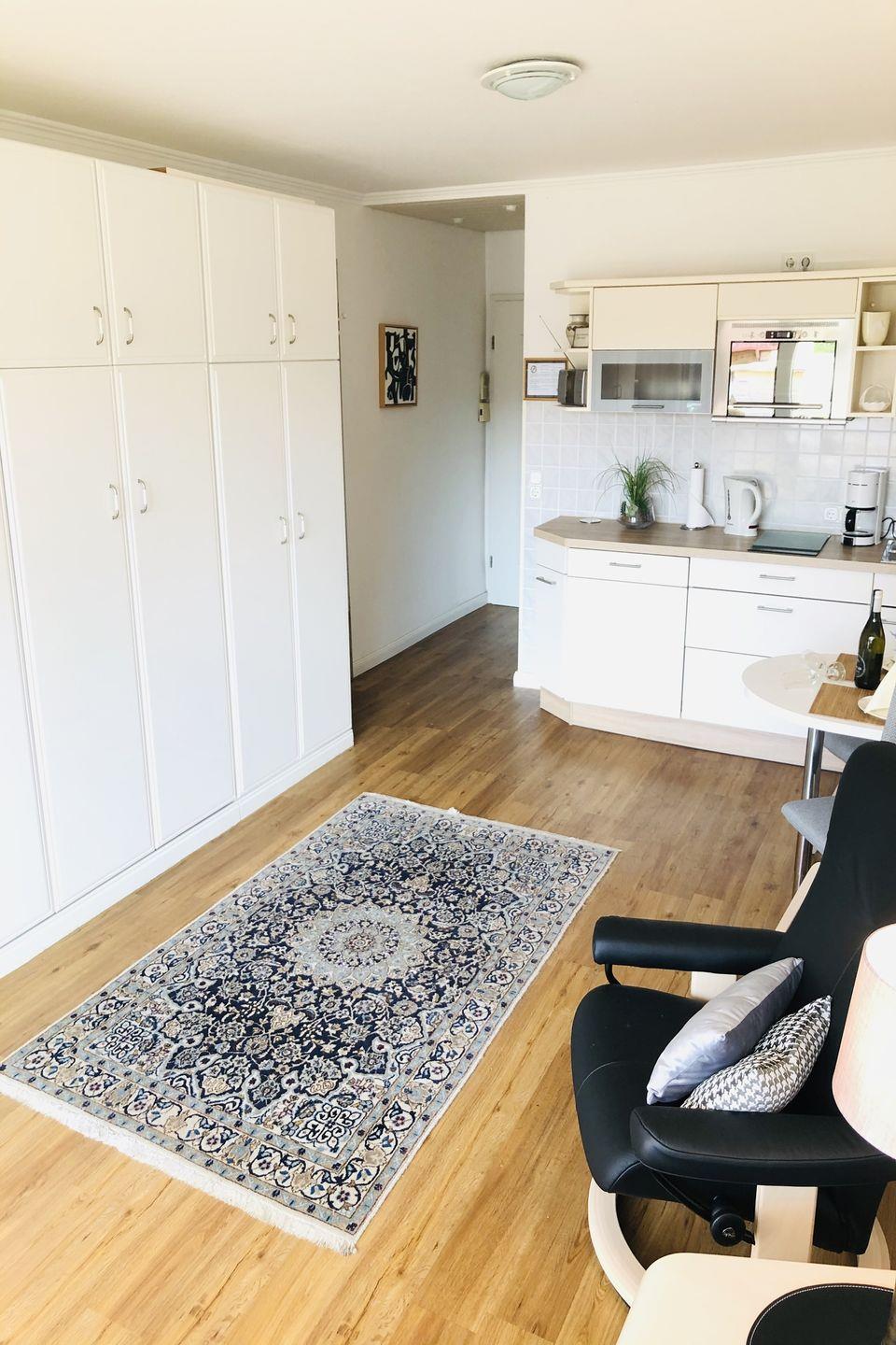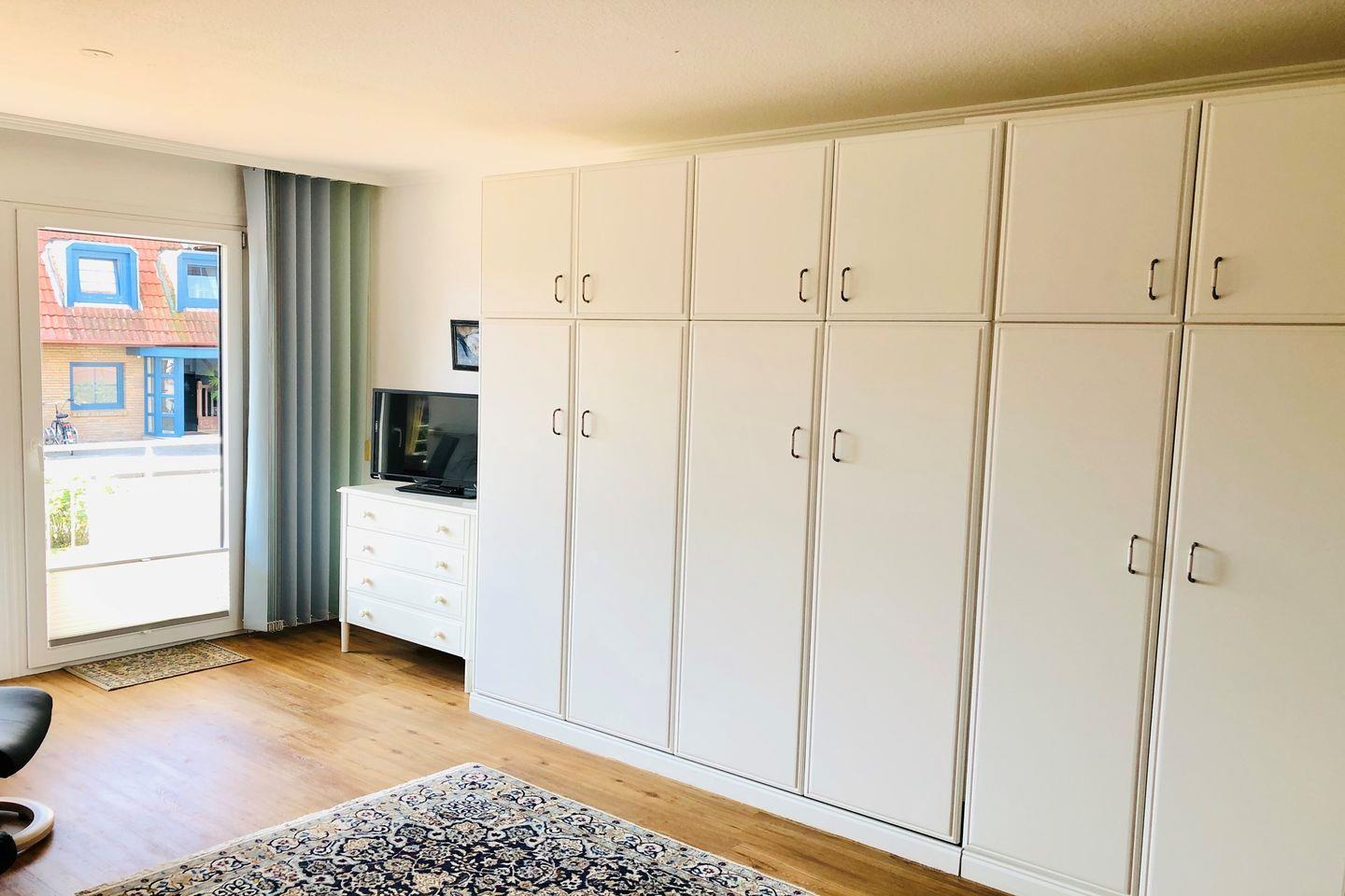 Das ca. 36 m² große 1-Zimmer-Appartement befindet sich im Hochparterre des Hauses und bietet ein angenehmes Wohnkonzept für bis zu zwei Personen. Der kombinierte Wohn- und Schlafbereich ist mit einem Doppelschrankbett ausgestattet, das tagsüber für ein großzügiges Raumgefühl sorgt. 2 Stressless-Sessel laden zum Entspannen nach einem erlebnisreichen Tag auf der Insel ein.