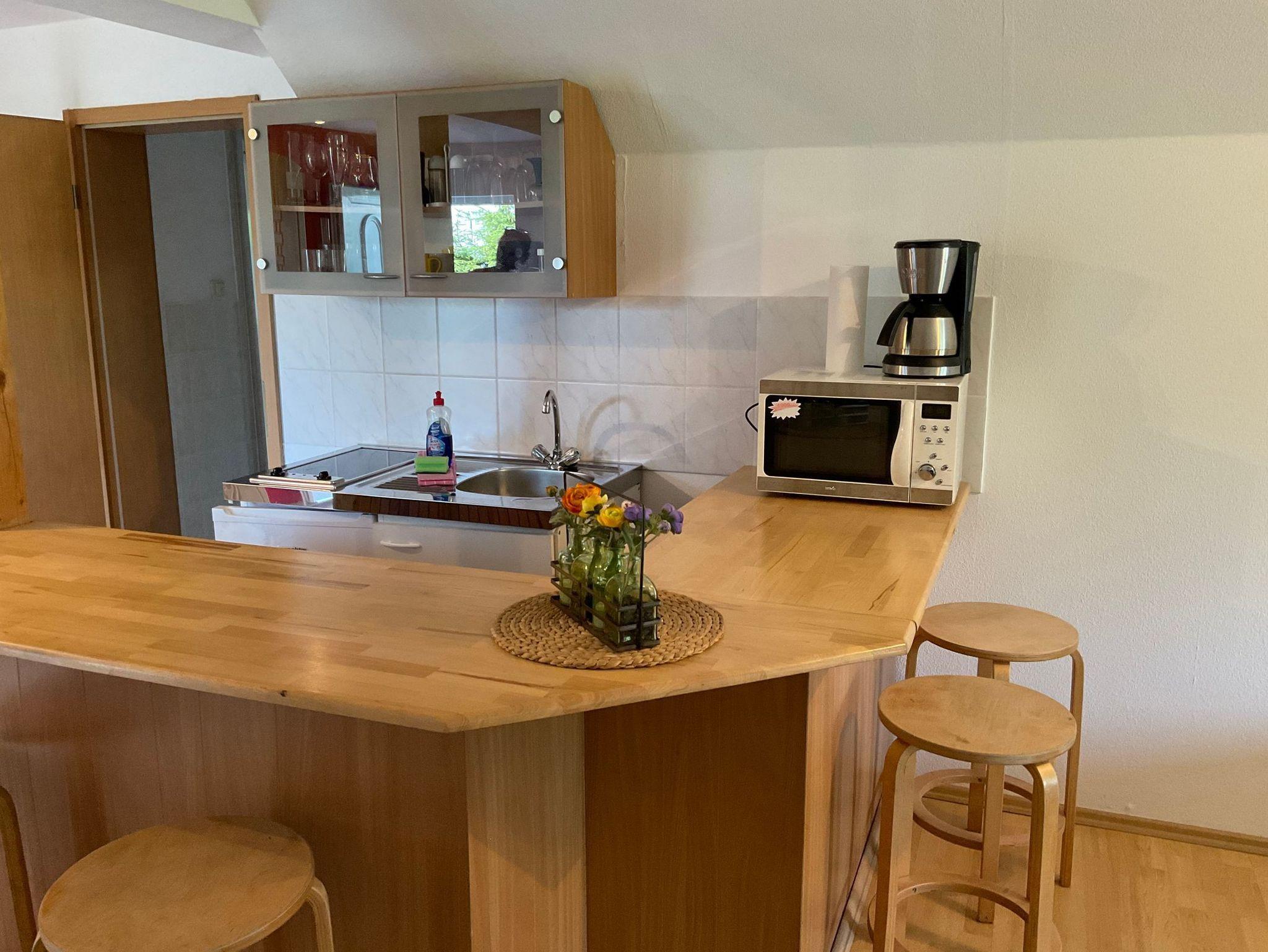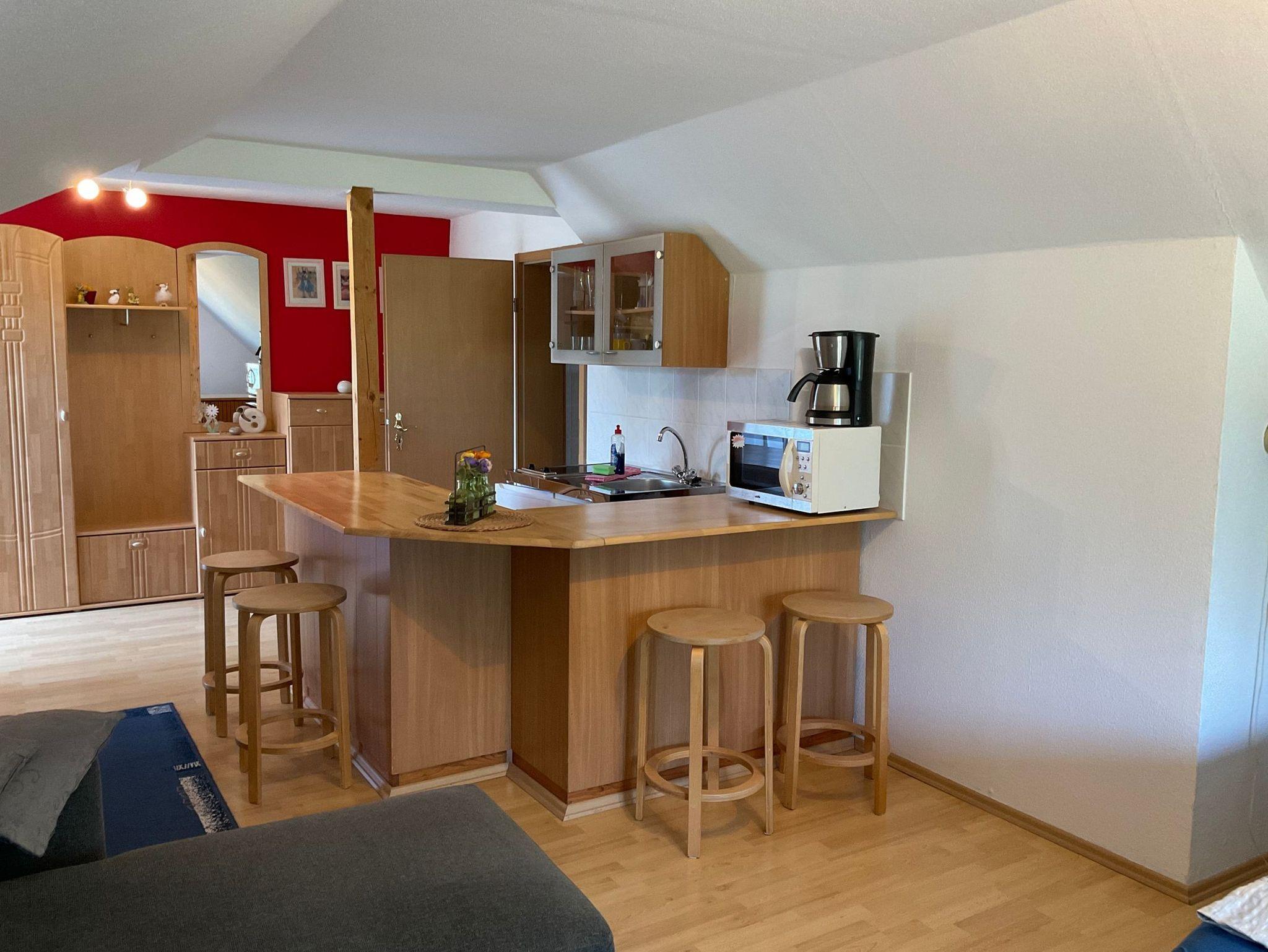 Die Ferienwohnung 4 befindet sich im Obergeschoß und ist über eine Außentreppe zu erreichen. Sie verfügt über einen Wohn-/Schlafraum mit Küchenzeile, einer gemütlichen Sitzgruppe und einem Doppelbett, (Sat TV, Radio). -Bad mit DU/WC. Das großzügige Grundstück läden zur aktiven Erhohlung ein.