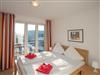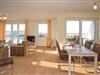 Der Wohnraum ist modern eingerichtet und verfügt über einen großen Flachbild-TV, einem Lowboard, einem Highboard und einer stilvollen Couch (3-er Sofa, 2-er Sofa und verstellbarem Sofasessel) sowie einem großen massiven Esstisch mit passenden Stühlen. Vom Wohnraum ist der Zugang zum großen Balkon gegeben. Die Ferienwohnung verfügt über zwei separate Schlafzimmer mit jeweils einem Doppelbett (2,00 x 1,80m, einzelnen 21cm dicken Komfort-Kaltschaum-Matratzen sowie sehr guten Lattenrosten) und jeweils einen großen Kleiderschrank.