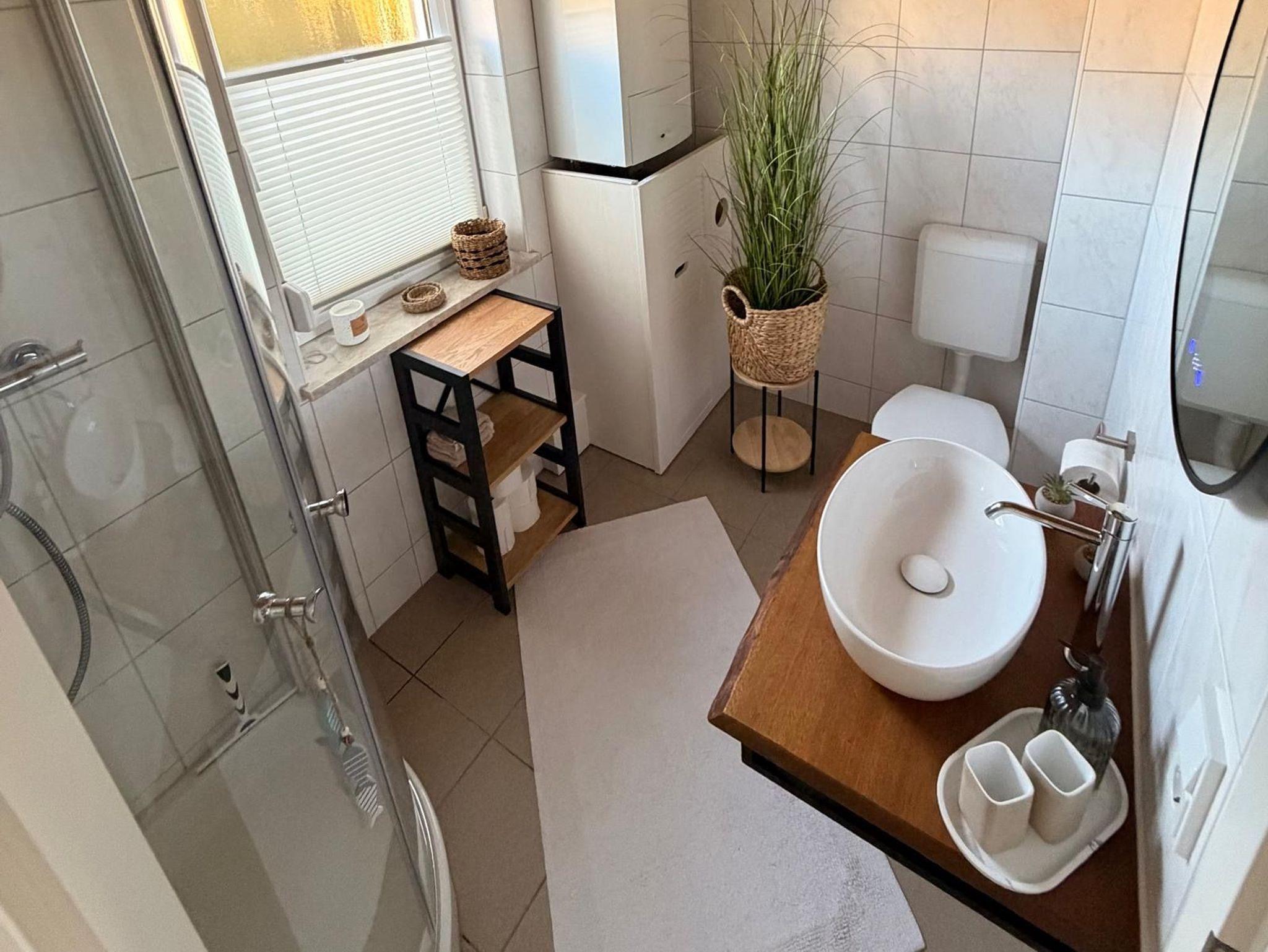 Das moderne Badezimmer verfügt über eine großzügige Dusche sowie einen praktischen Waschtrockner und bietet damit zusätzlichen Komfort, insbesondere bei längeren Aufenthalten oder Reisen mit der Familie.