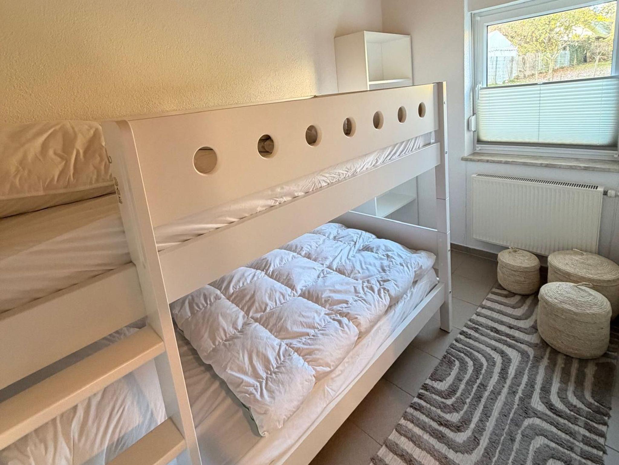 Das stylische Häuschen überzeugt durch ein durchdachtes Raumkonzept und bietet mit drei Schlafzimmern ausreichend Platz für bis zu fünf Personen. Ein Schlafzimmer ist mit einem komfortablen Doppelbett ausgestattet, ein weiteres verfügt über ein Etagenbett und eignet sich besonders gut für Kinder, während das dritte Schlafzimmer mit einem Einzelbett zusätzlichen Rückzugsraum bietet. Die Räume sind modern, freundlich und mit viel Liebe zum Detail eingerichtet. Wäschepakete (Bettwäsche und Handtücher) sind über Übernachtungspreis inkludiert.