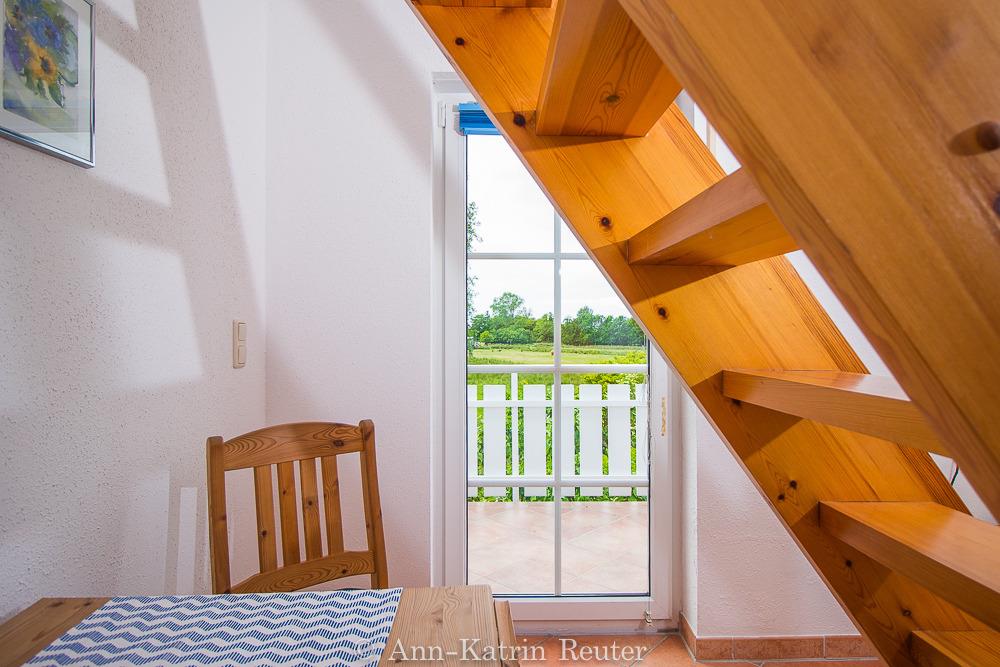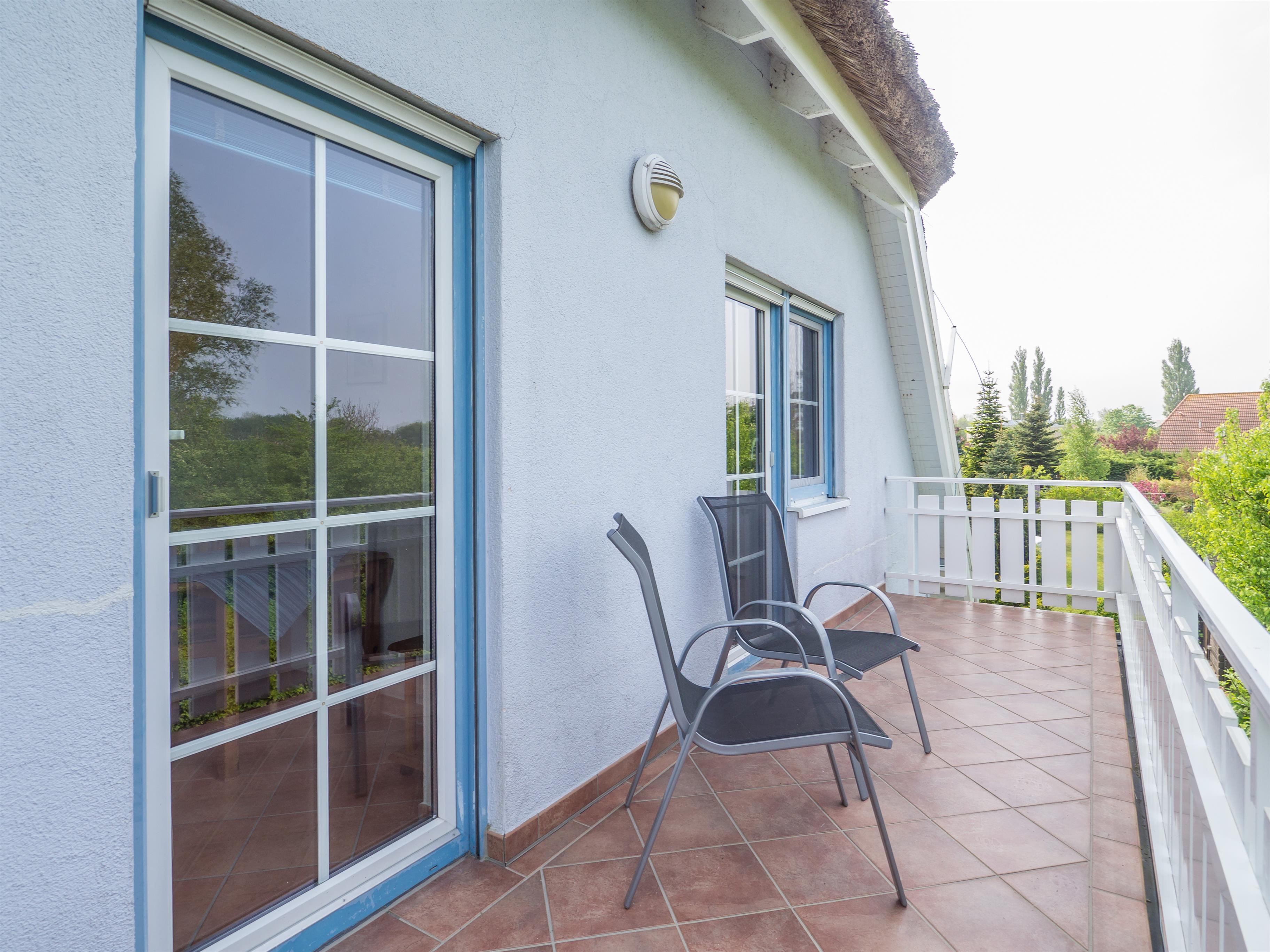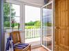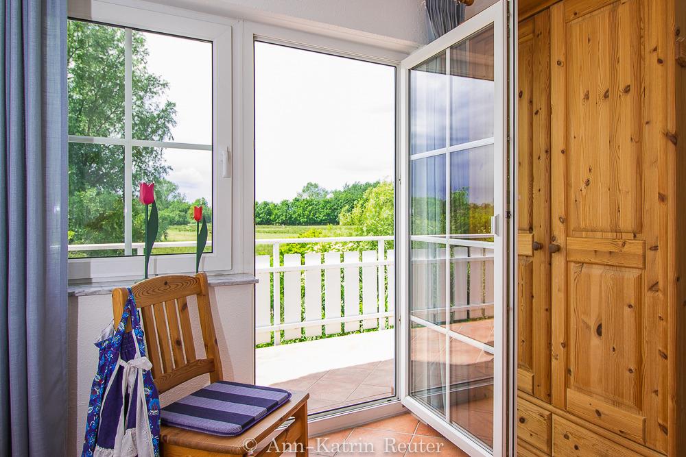 Von dem kleinen Zimmer, wie auch dem nebenanliegenden Schlafzimmer gelangen Sie auf den Südwest-Balkon mit Blick auf die angrenzenden Wiesen, wo Sie grasende Galloway Rinder, Schafe und auch Pferde beobachten können. Nicht weit dahinter befindet sich der Wieker Bodden.