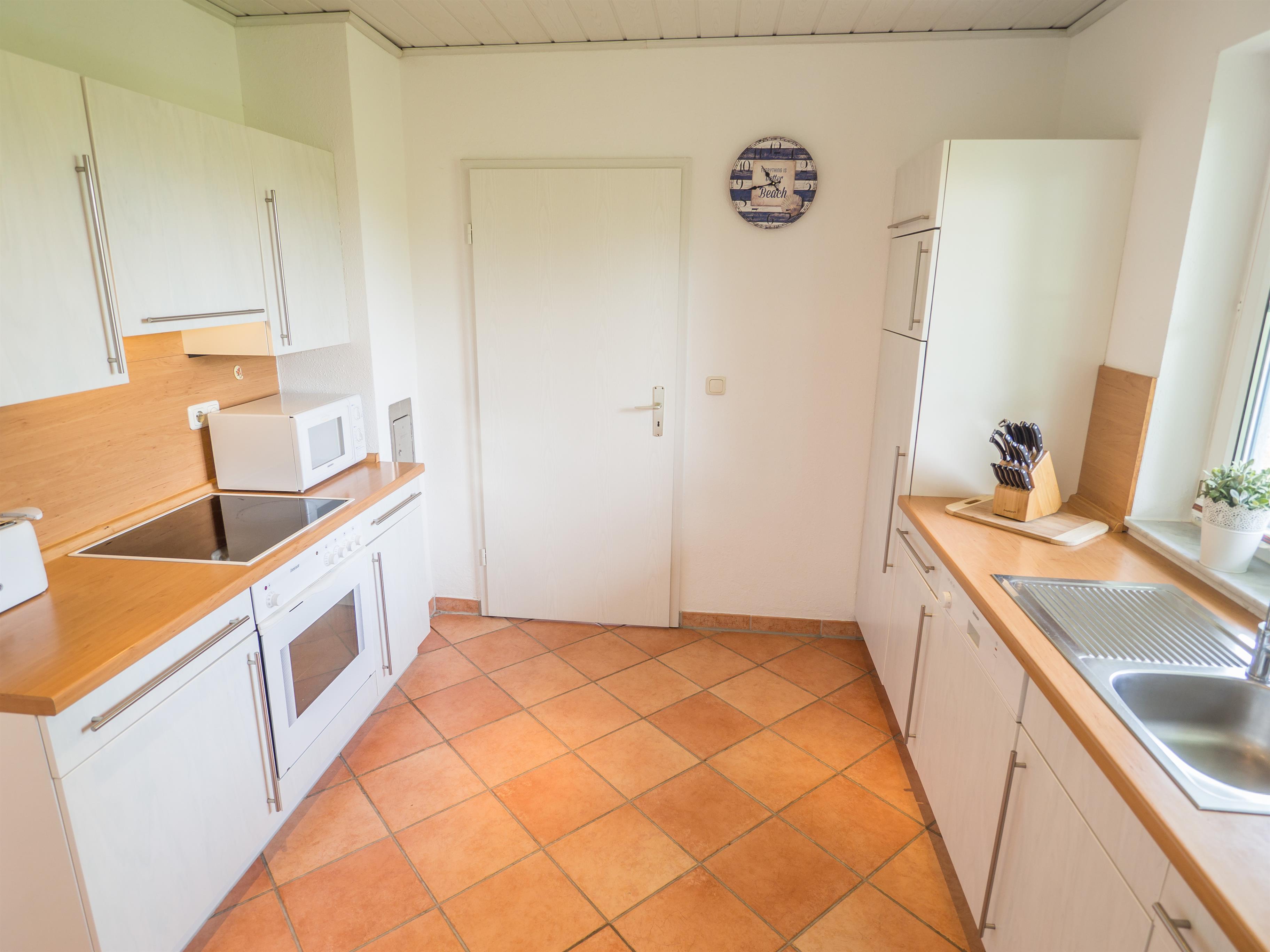 Vom Essbereich im Wohnzimmer gelangen Sie ebenfalls in die Küche, welche ausgestattet ist mit Ceranfeld, Backofen, Mikrowelle, Geschirrspüler, Kühl/Gefrierschrank, Kaffeemaschine, Toaster, Eierkocher, Mixer, etc. . Eine Waschmaschine befindet sich in einer von der Küche zugänglichen separaten Abstellkammer.
