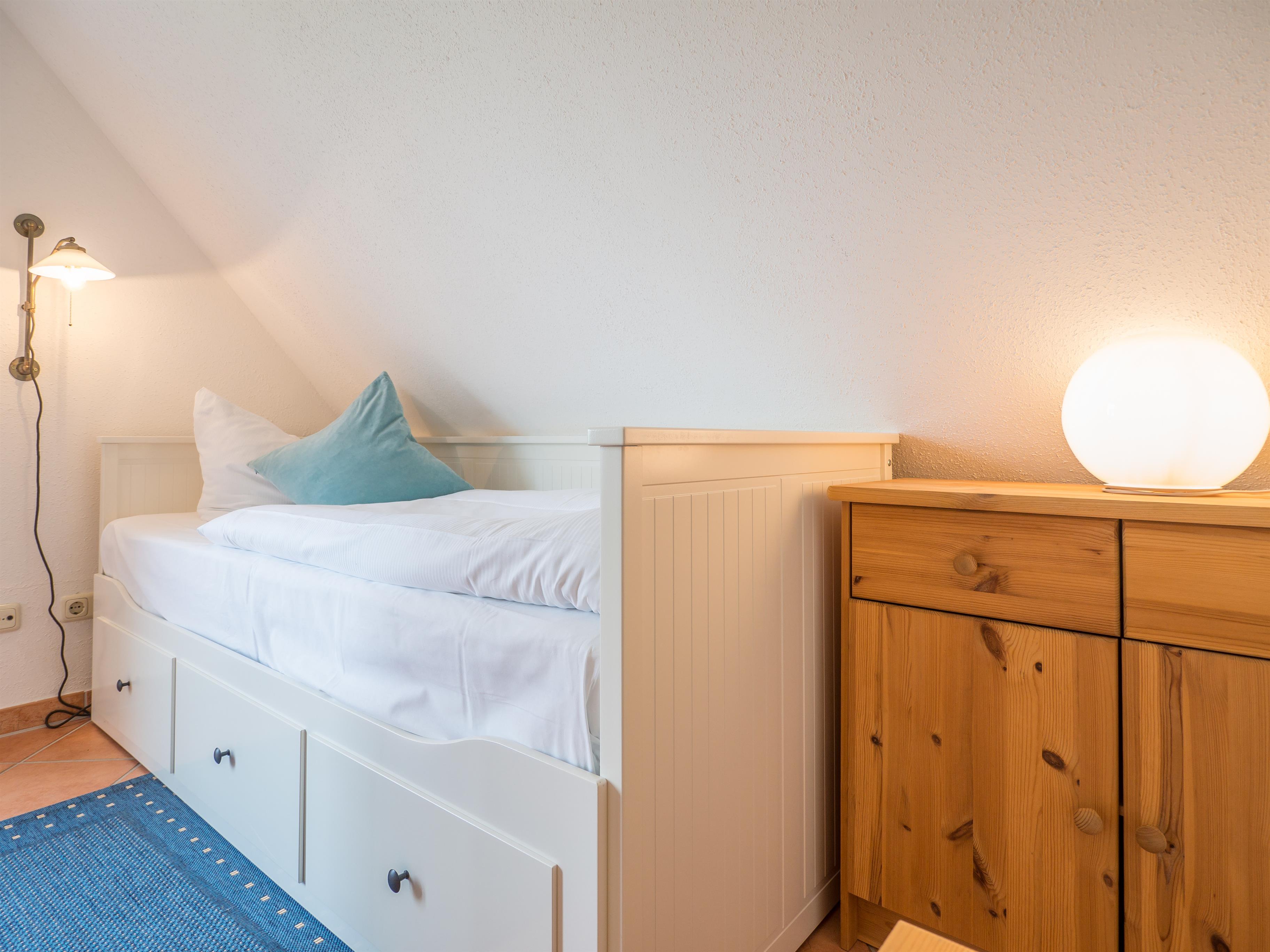 Eine weitere Schlafmöglichkeit für 1 Person befindet sich in einem kleinen Zimmer, über dieses gelangt Sie auch über eine Holztreppe zum gemütlichen Spitzboden, wo sich 2 weitere Einzelbetten und ein ausziehbares Bett für 2 Personen befinden.