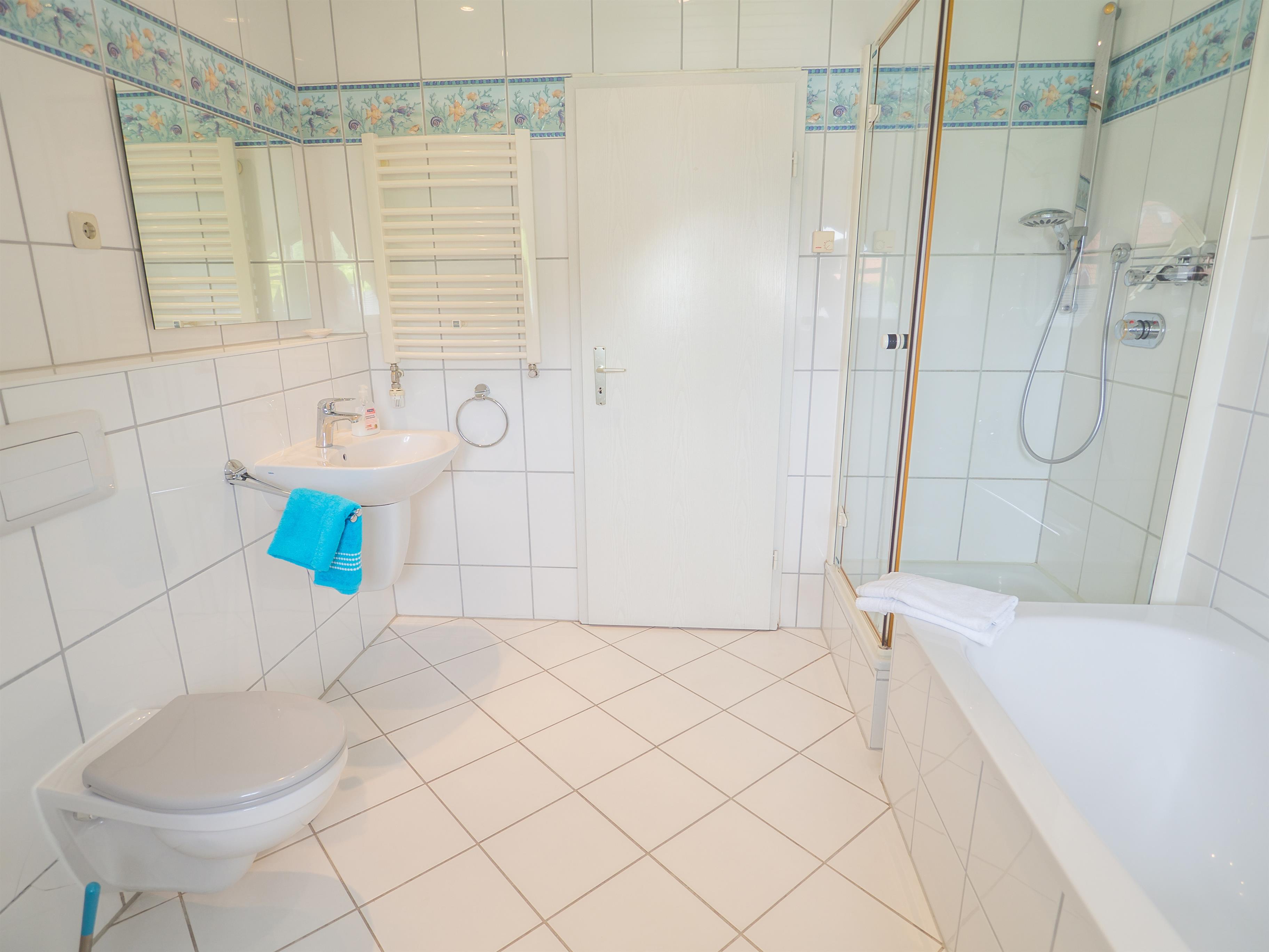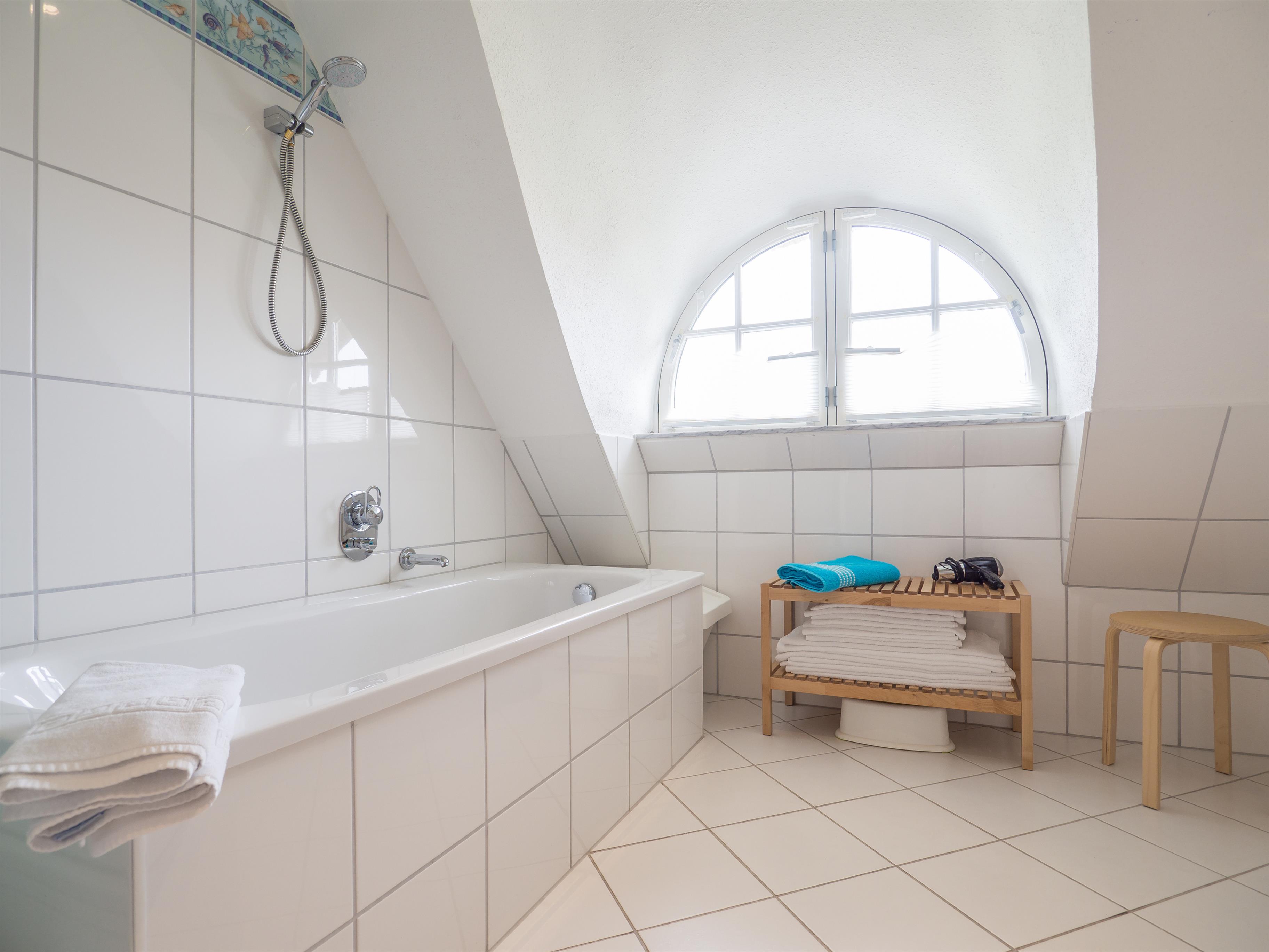 Im Obergeschoß, befinden sich ein großes Tageslichtbad mit Gauben Fenster. Ausgestattet mit Badewanne, Dusche, Doppelwaschtisch, LED-Spiegel und Haartrockner.
