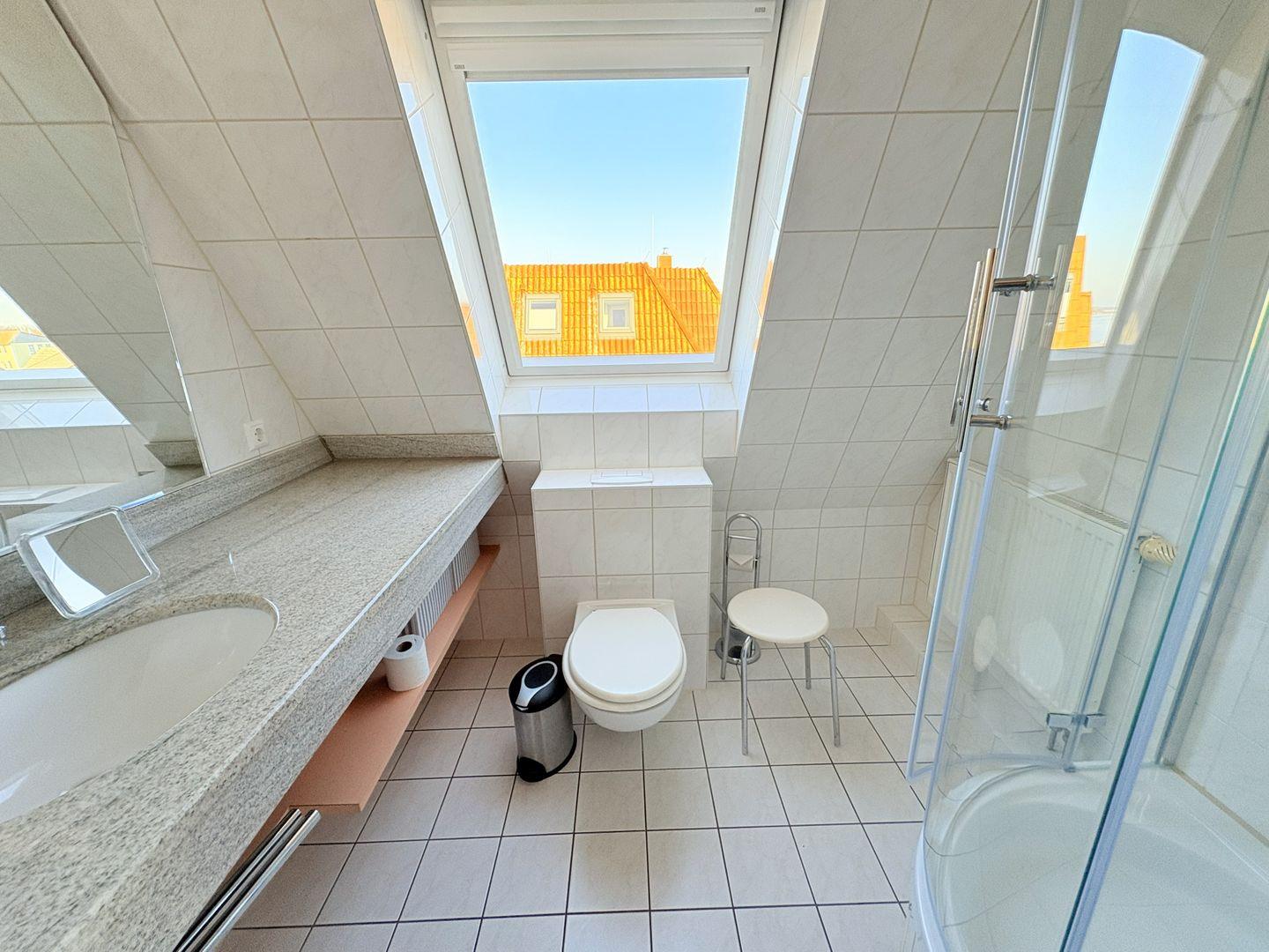 In der oberen Ebene befinden sich zwei Schlafräume mit Verdunklungsmöglichkeit und das Badezimmer mit großem Fenster.