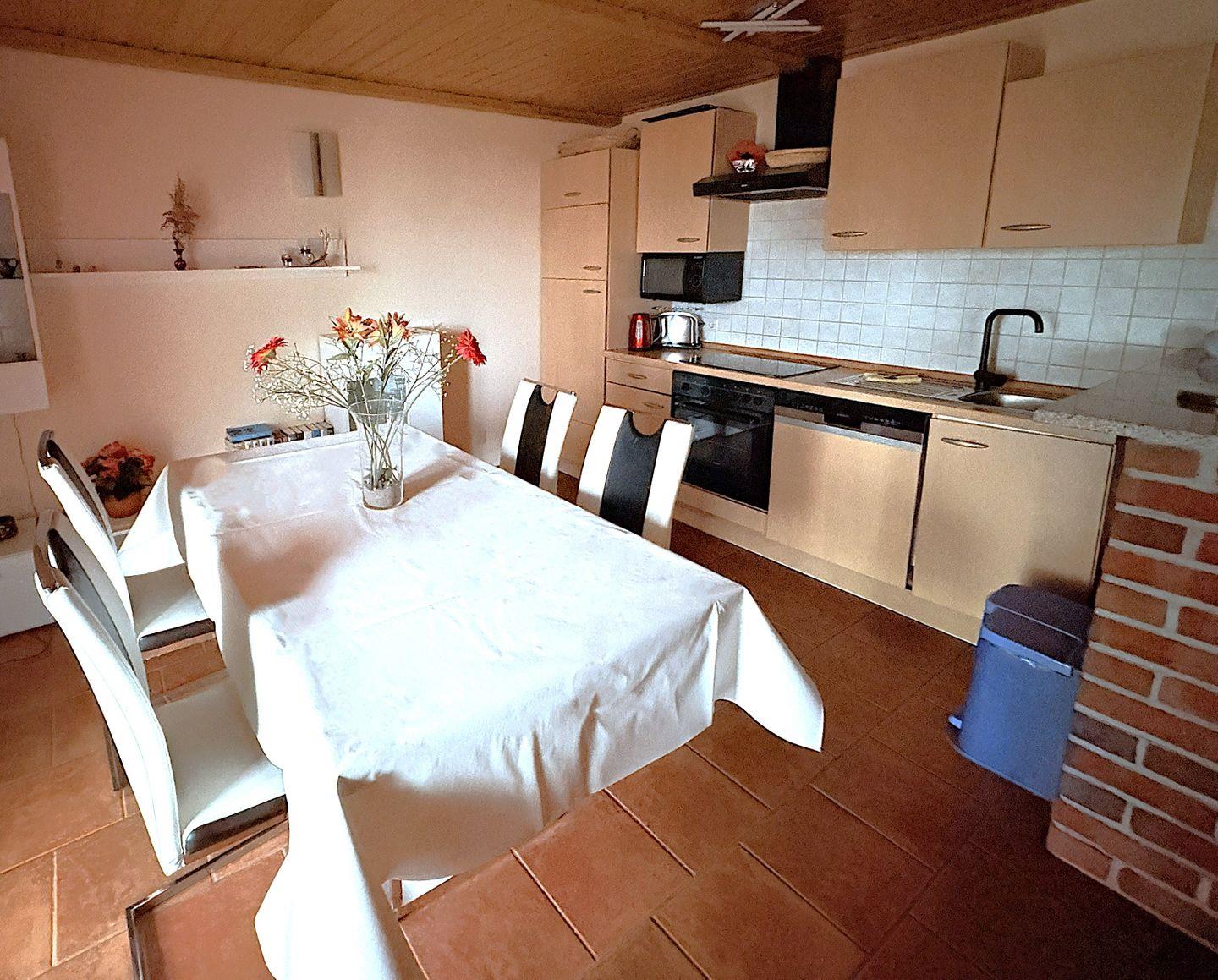 Genießen Sie gemeinsame Mahlzeiten am Esstisch oder auf der möblierten Terrasse.