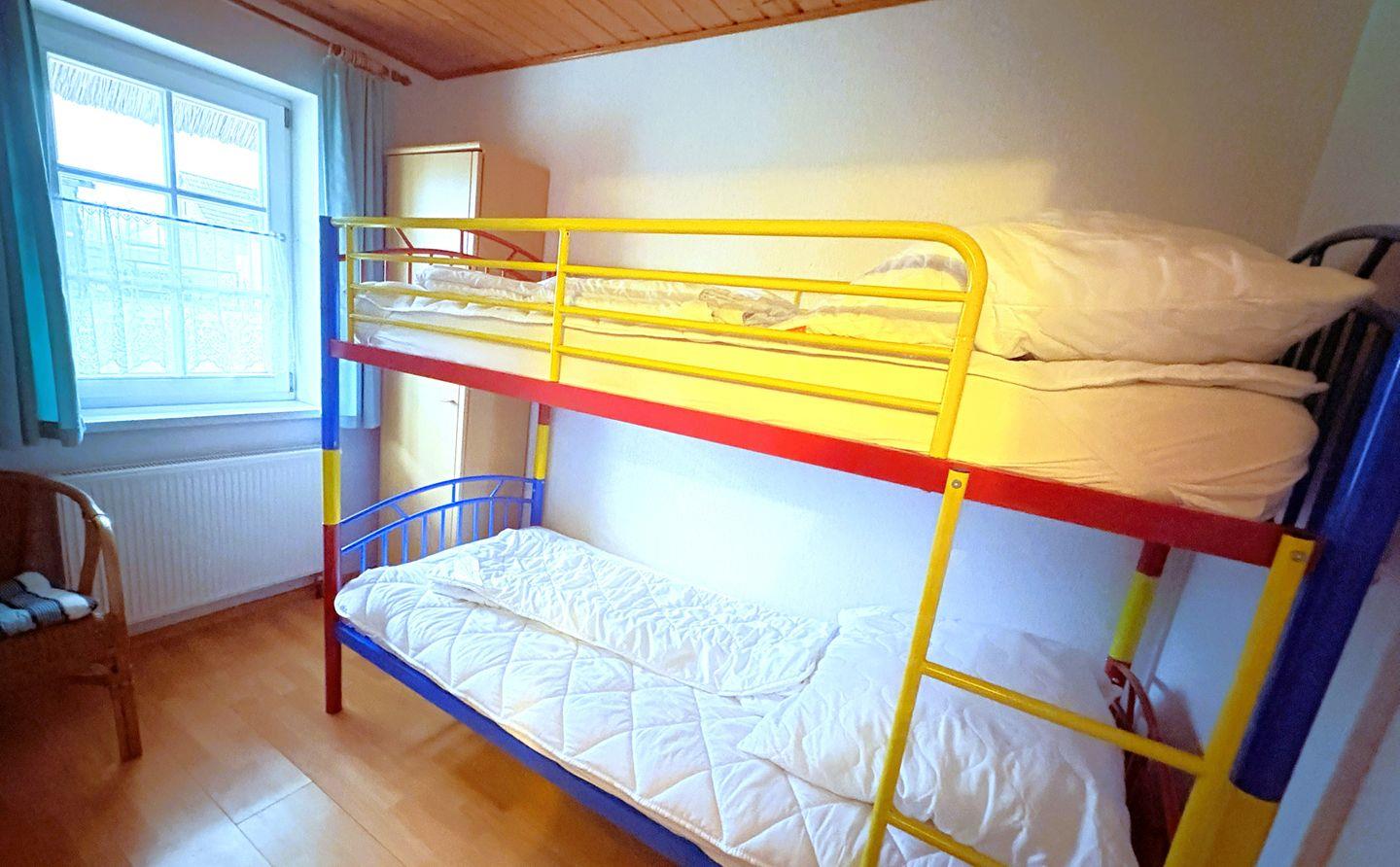 Das Apartment verfügt über zwei separate Schlafzimmer: eines mit einem komfortablen Doppelbett und eines mit Etagenbett - ideal für Kinder. Das moderne Bad bietet eine Dusche, WC, Waschmaschine und ein Fenster für Tageslicht.