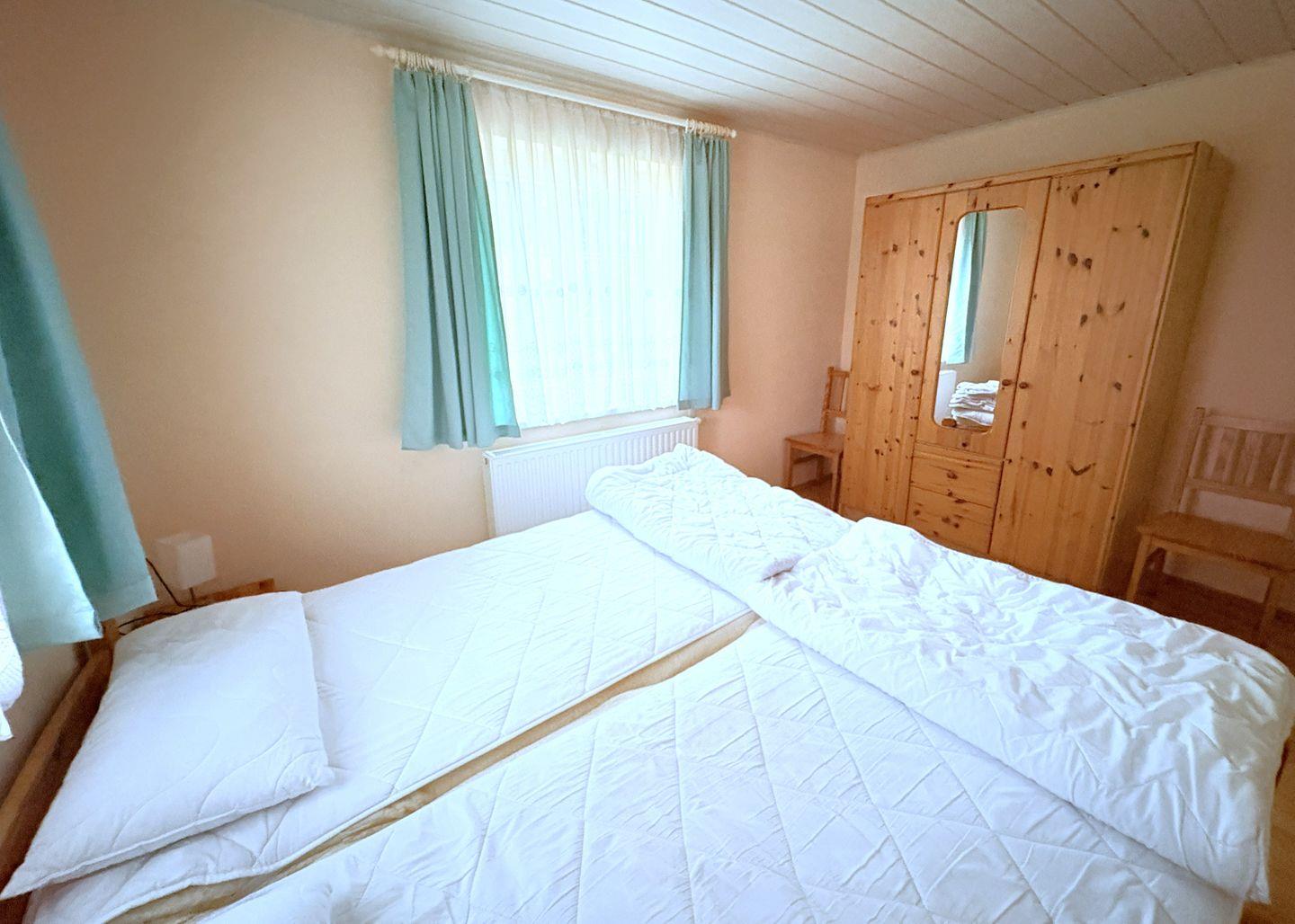 Das Schlafzimmer mit großem Doppelbett, hellen Vorhängen und sanften Farben sorgt für erholsamen Schlaf. Das Badezimmer verfügt über Dusche und Waschmaschine .