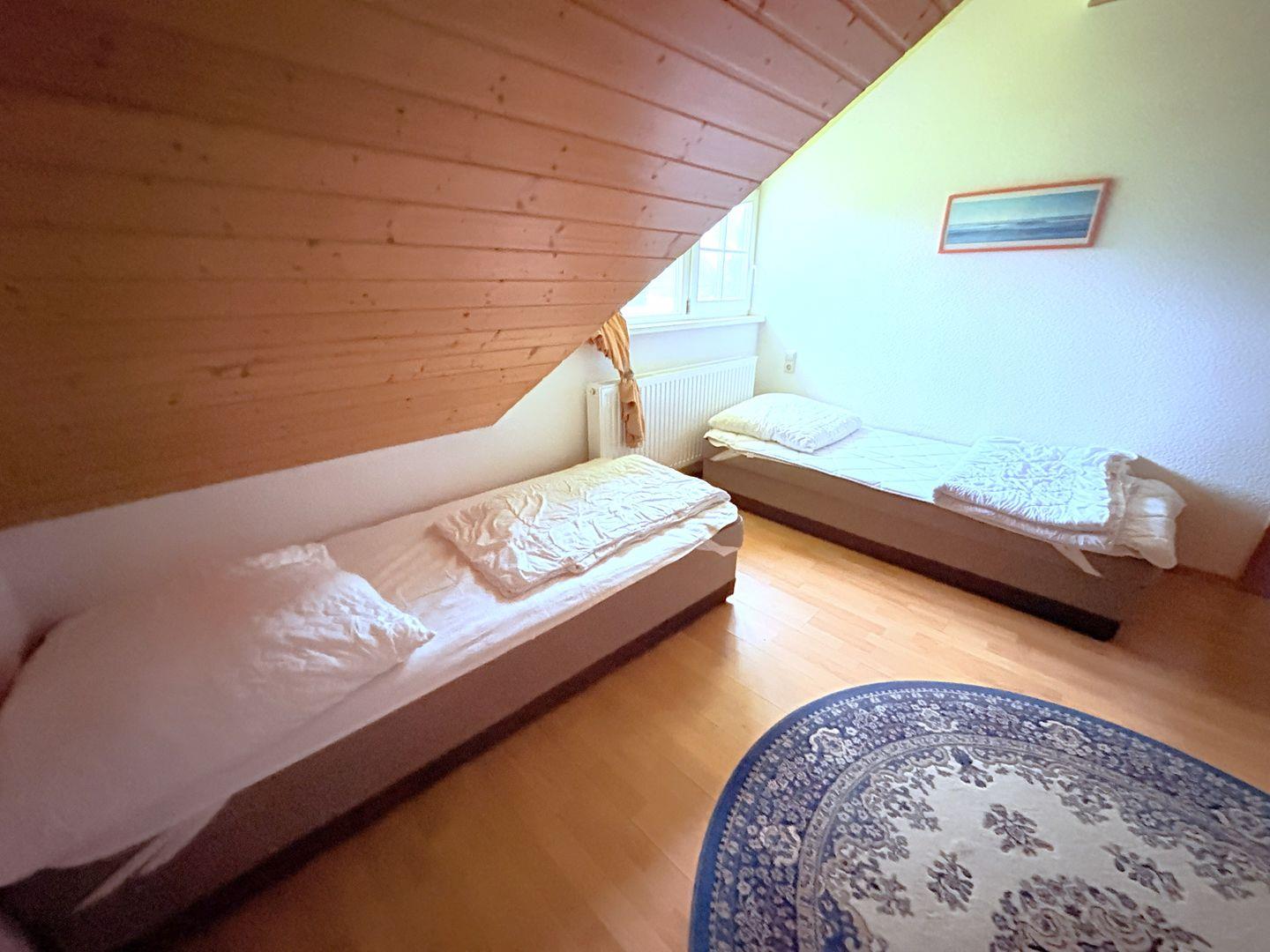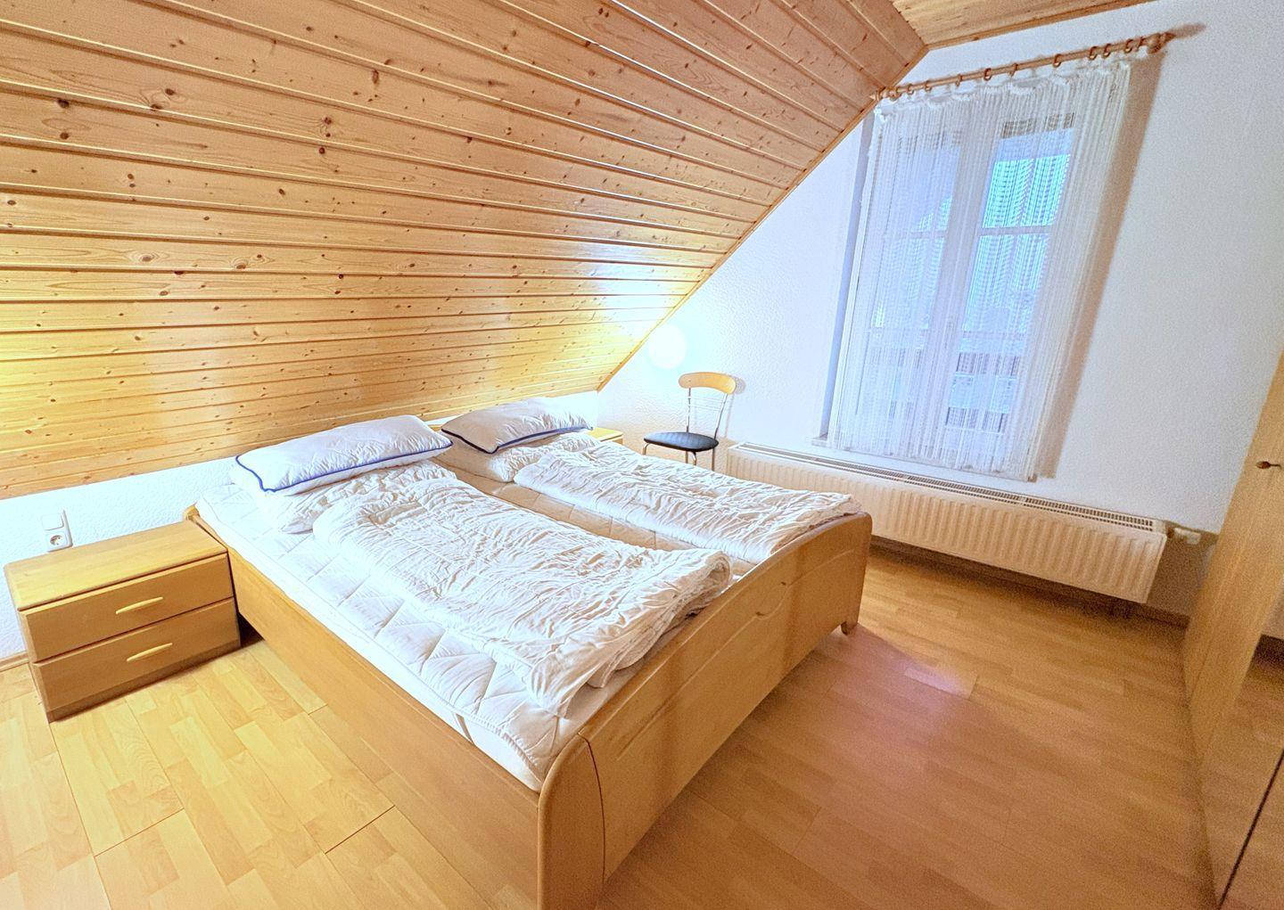 Das separate Schlafzimmer ist mit einem Doppelbett und großem Kleiderschrank eingerichtet. Im zweiten Schlafzimmer befinden sich zwei Einzelbetten und zusätzliche Sitzgelegenheiten - ideal für Kinder oder Mitreisende.