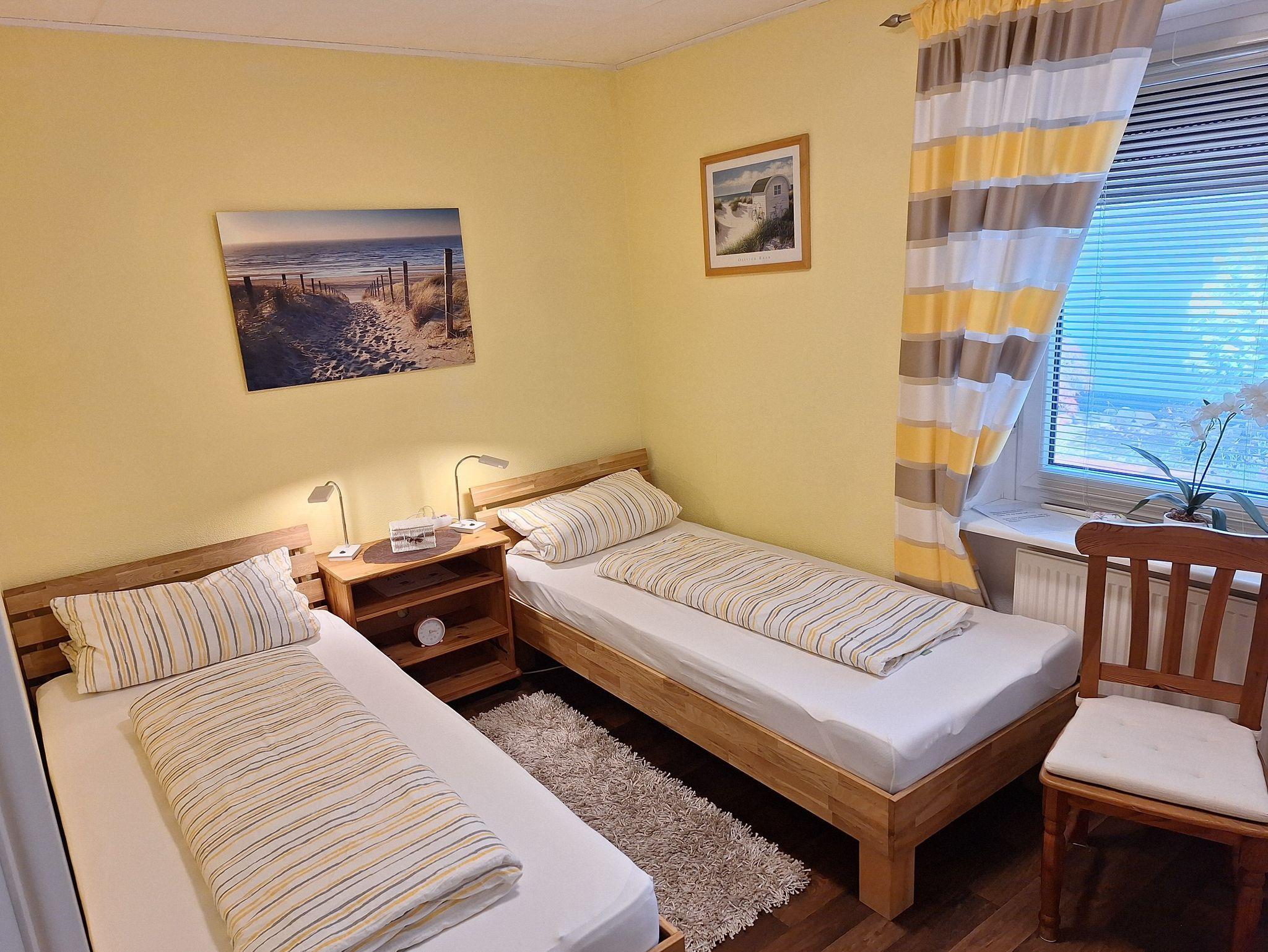 1 ruhiges Schlafzimmer mit 2 Einzelbetten, Fenster mit Rollladen, 1 heller, freundlicher Wohnraum Südfenster mit Rollladen, WLAN vorhanden.