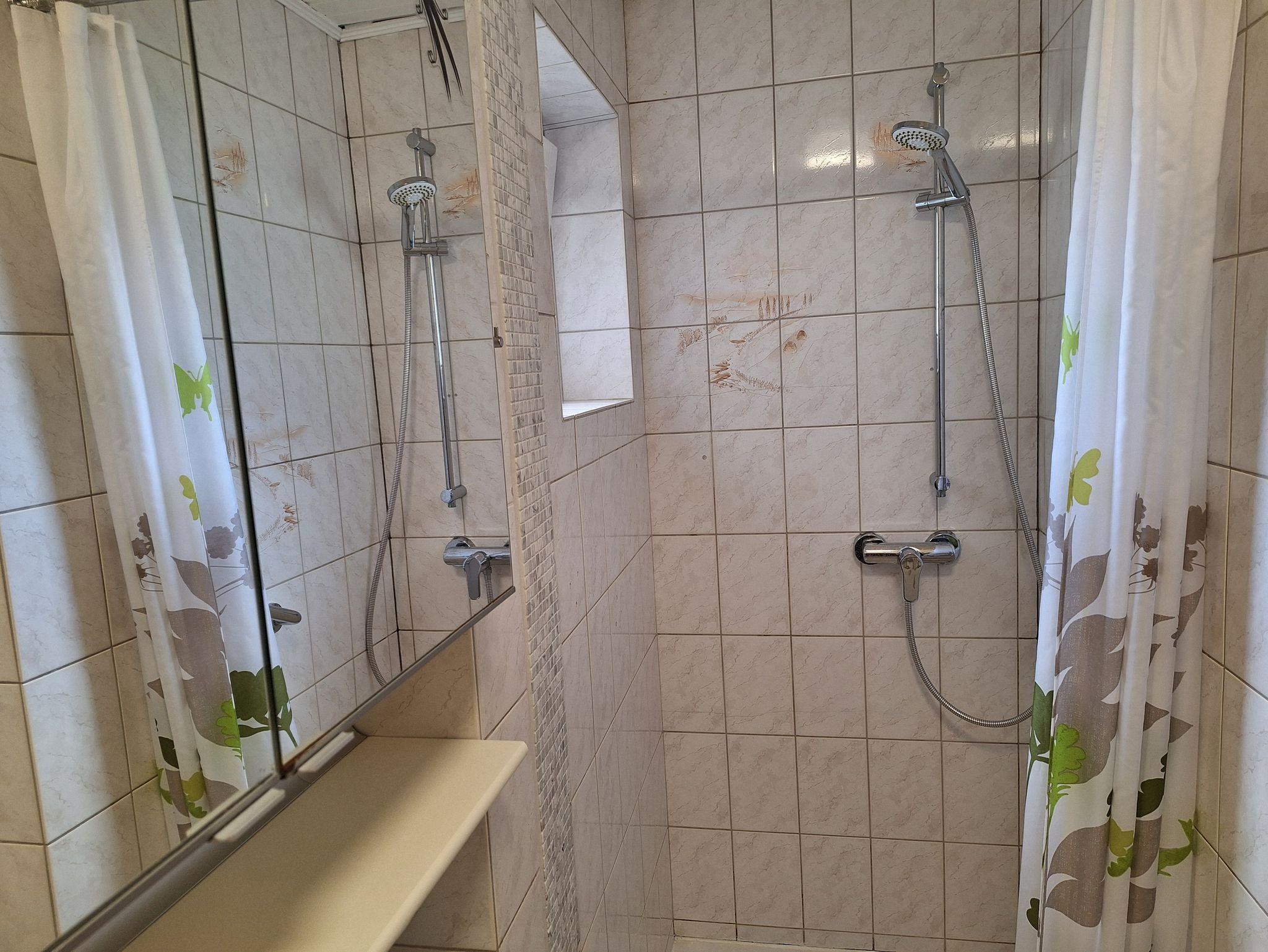 Helle Dusche, WC, mit Fenster, Föhn vorhanden, großer Flur mit Garderobe, Schrank und Abstellmöglichkeit. Waschmaschine, Bügelbrett und Bügeleisen vorhanden.