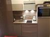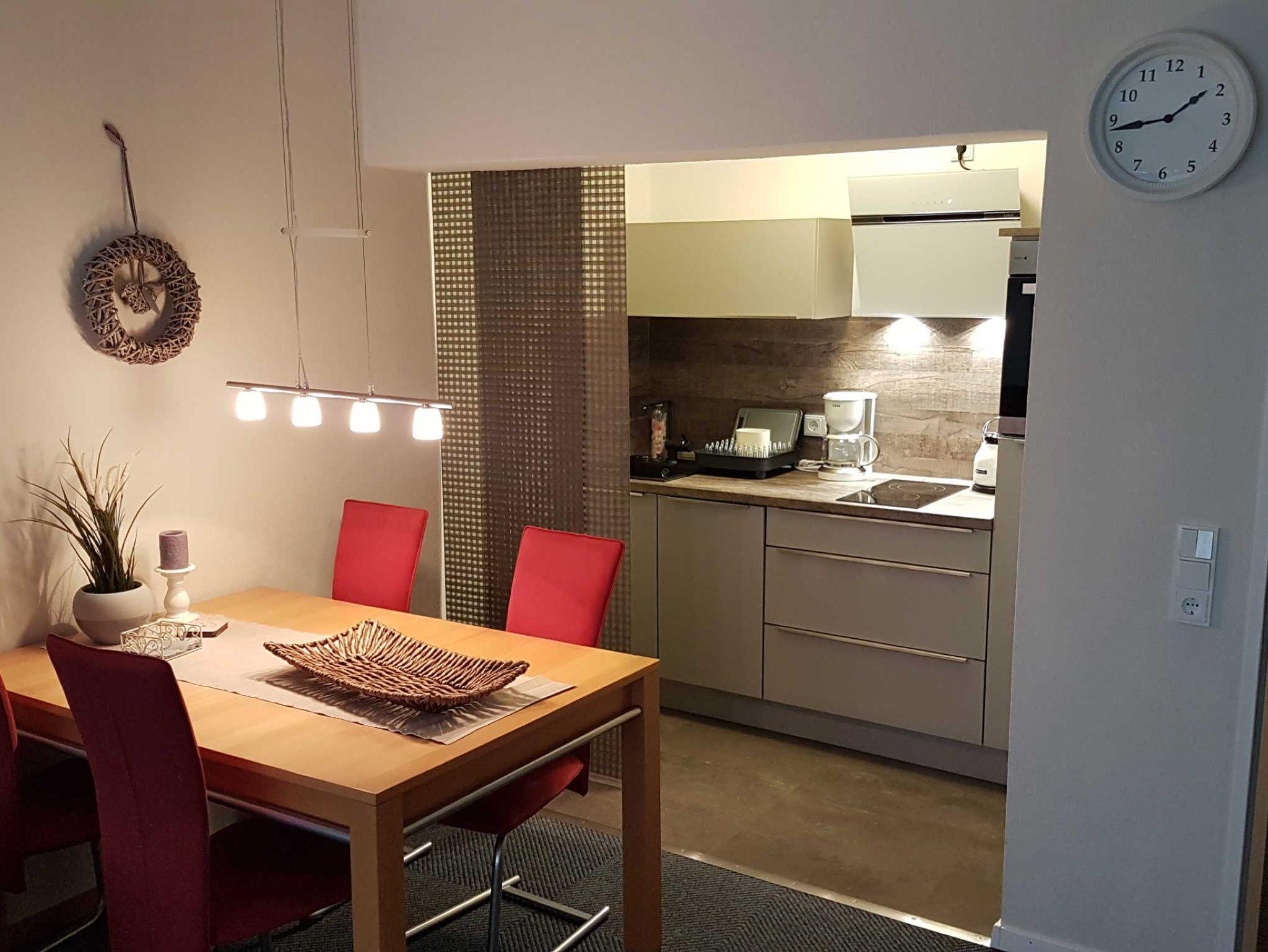 Die am Wohnzimmer angrenzende Küchenzeile mit Essecke ist vollständig eingerichtet. Ein Backofen mit Dampfgarer ergänzt die vorhandenen Herdplatteen. Eine Spülmaschine ist vorhanden. Die hochwertige Küchenzeile wurde 2021 komplett erneuert.