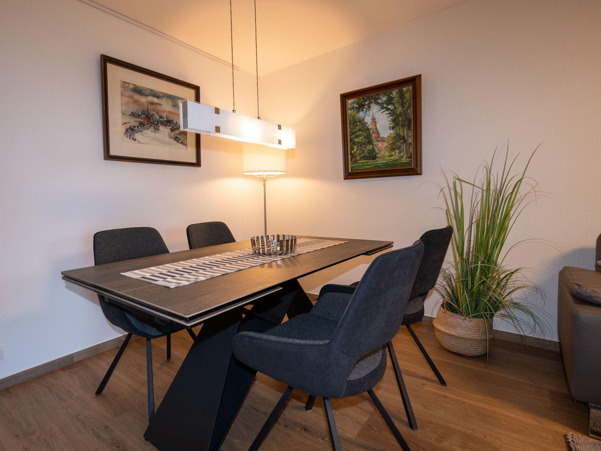 Der stilvoll eingerichtete offene Wohn-, Essbereich ist mit einer gemütlichen Sitzecke und einem Multimedia-Angebot , d.h.Fernseher LCD-TV 65 Zoll, Sky Soundbox, Blueray Player sowie einer 500 MBIT WLAN ausgestattet.
