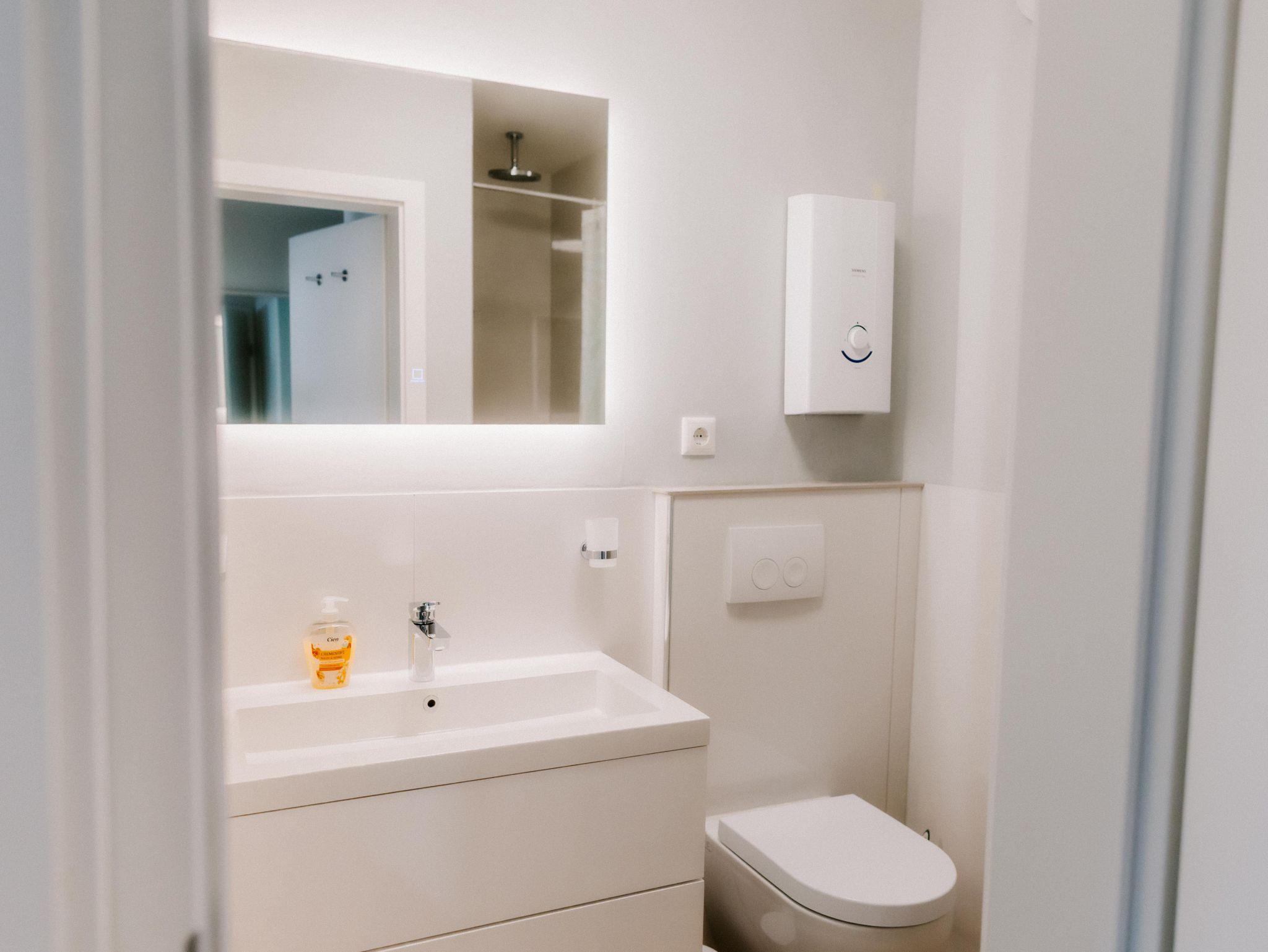 In zwei behaglichen Schlafzimmern mit Doppelbetten schlafen Sie tief und ruhig – umgeben von wohltuender Stille. Im stilvollen Bad mit bodengleicher Dusche beginnt der Tag mit einem Hauch von Luxus.