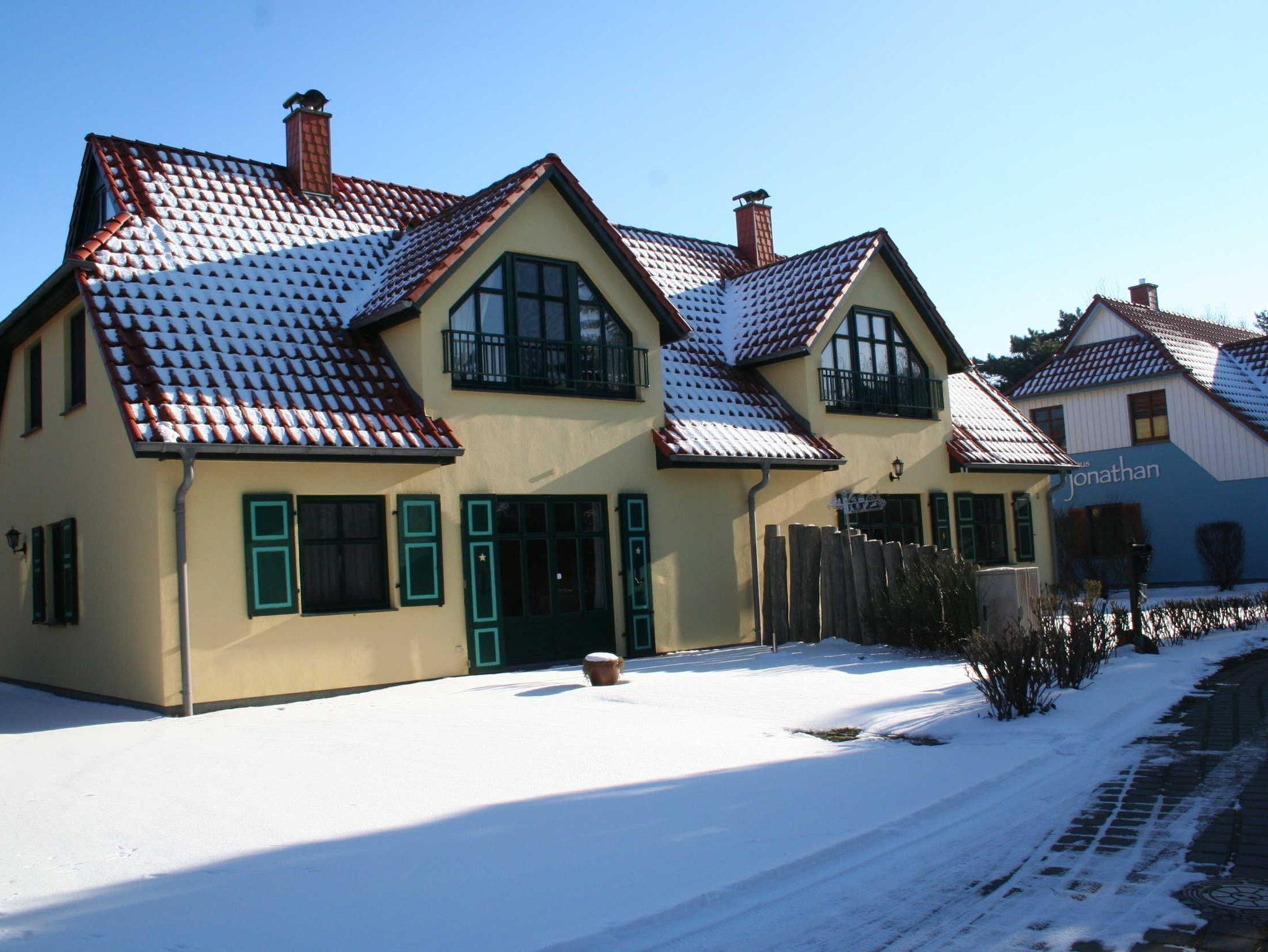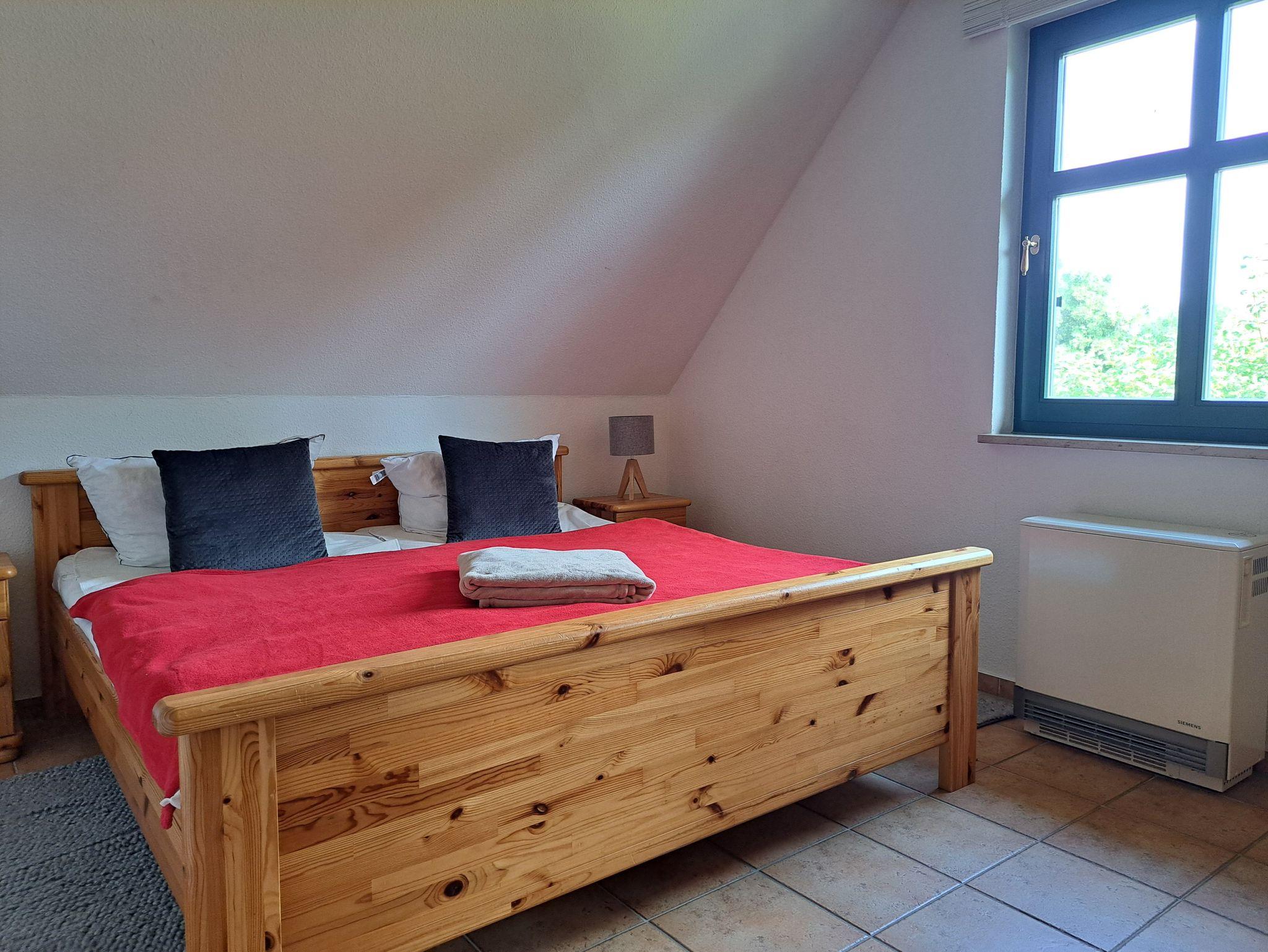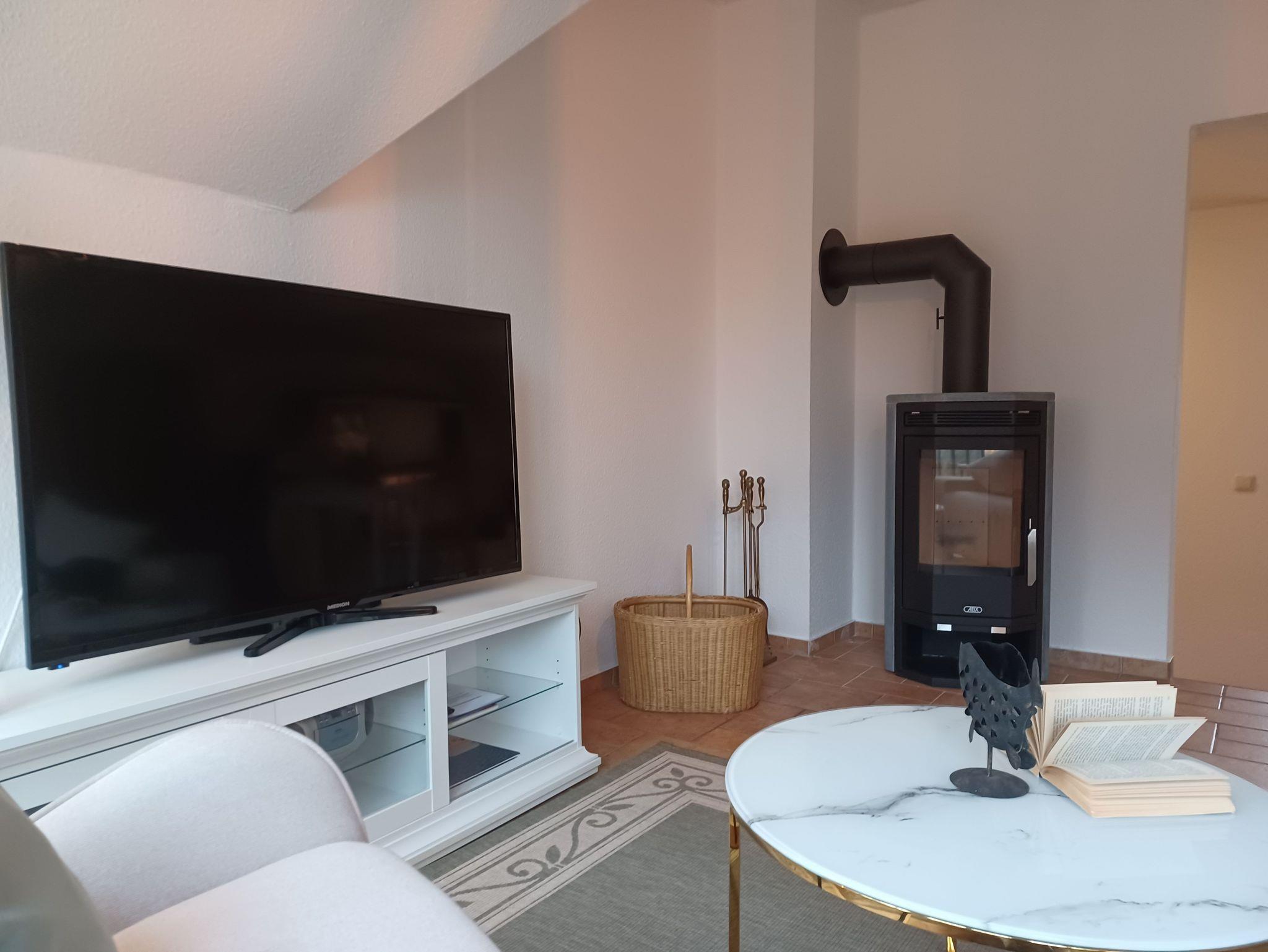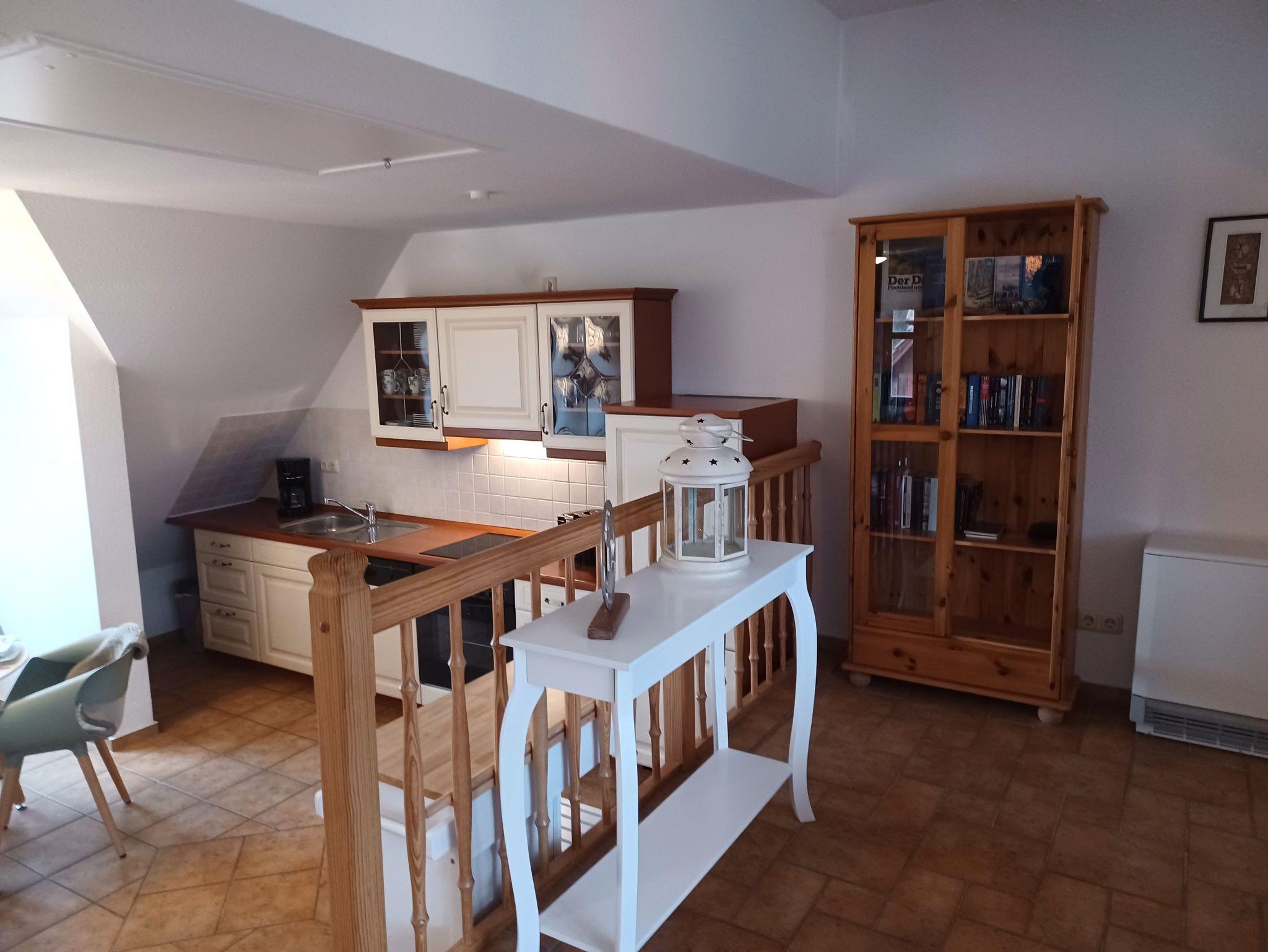 Das Wohnzimmer wurde ausgestattet mit einem Kamin, (das Kaminholz ist von den Gästen mitzubringen). einer Couch und SAT- TV . Alle Wohnungen sind Nichtraucherwohnungen. In der offenen Küchenzeile befinden sich ein Backofen und Geschirrspüler, sowie umfangreiche Küchenutensilien. Für unsere kleinen Gäste können Sie Kinderreisebett und Kinderhochstuhl à 10,00 € /pro Woche dazubuchen. Für die nächtliche Ruhe steht Ihnen 1 Schlafzimmern mit 1 Doppelbett 1,80 x 2,00 m (getrennte Matratze) zur Verfügung. Im Schlafgiebel befindet sich eine weitere Schlafgelegenheit mit einem Doppelbett. Der Schlafgiebel mit einer Stehhöhe von ca. 1,65 m ist über eine ausziehbare Treppe zu erreichen und ist nur für Kinder ab 6 Jahre geeignet. Die Bettwäsche und Handtücher können bei der Zimmervermittlung dazugebucht werden - ein Paket 19,50 € (1 Badetuch, 1 Handtuch, 1 Kopfkissen, 1 Bezug und 1 Spannbettlaken). Ein WLAN Gästezugang steht Ihnen während Ihres Aufenthaltes kostenlos zur Verfügung. Zum gemütlichen Verweilen lädt die Terrasse mit Strandkorb ein. Ein Parkplatz befindet sich auf dem Grundstück. Haustiere sind herzlich willkommen. Die Ferienwohnung wurde mit einer Elektroheizung ausgestattet.