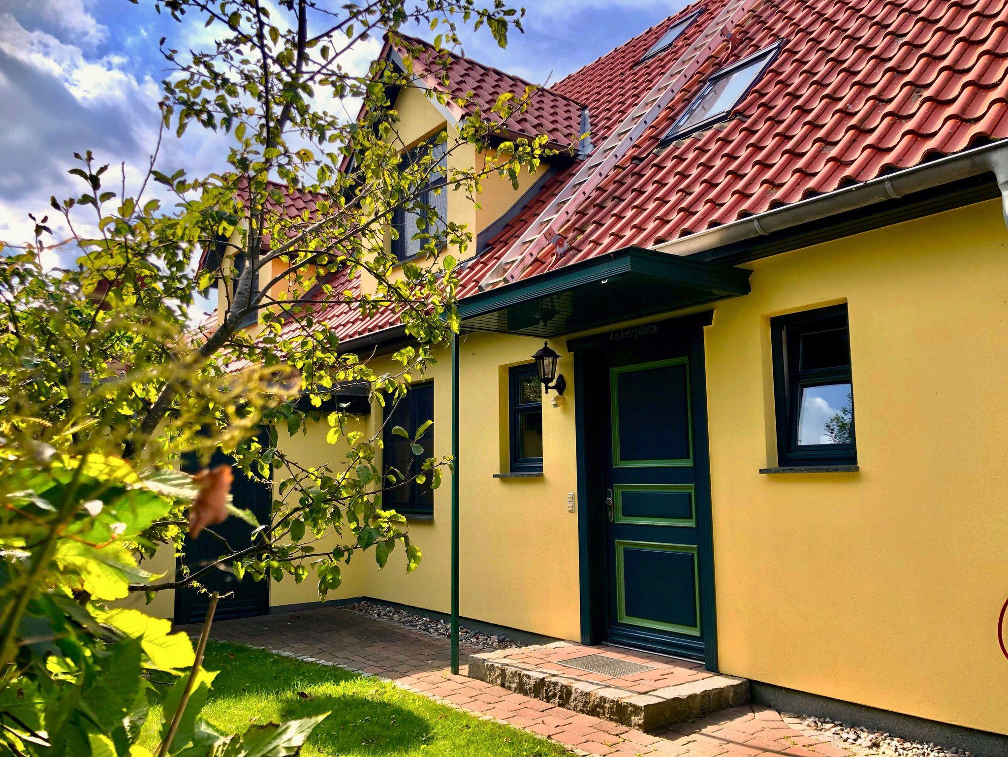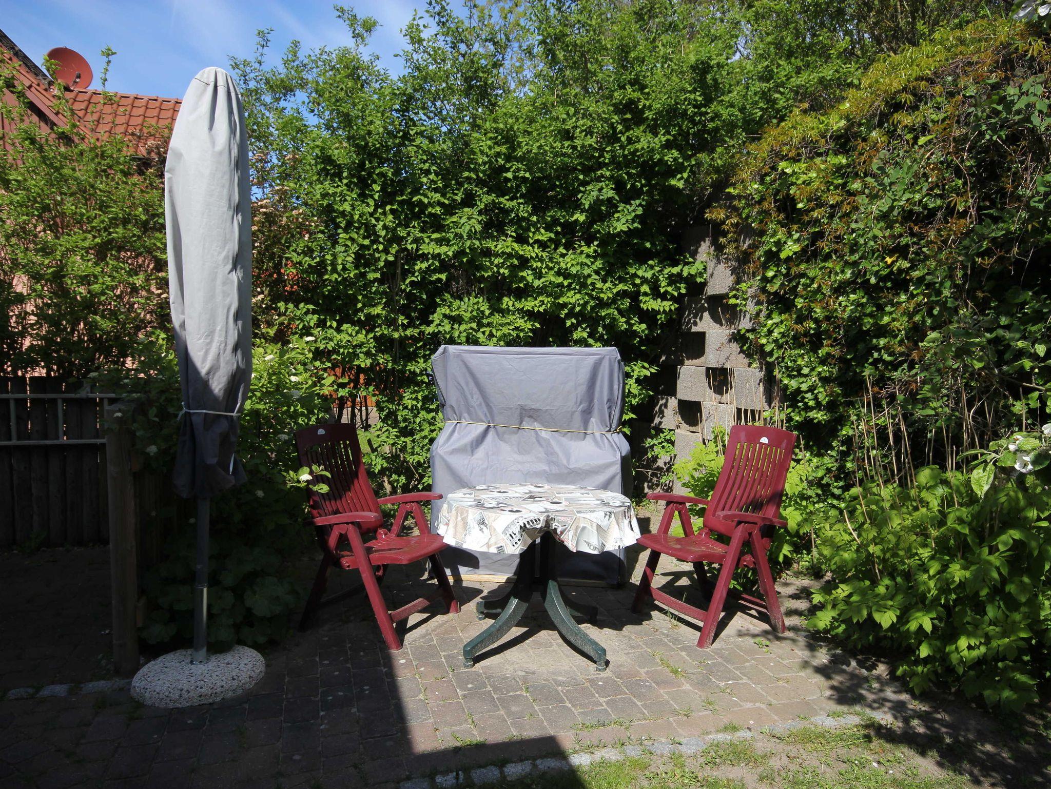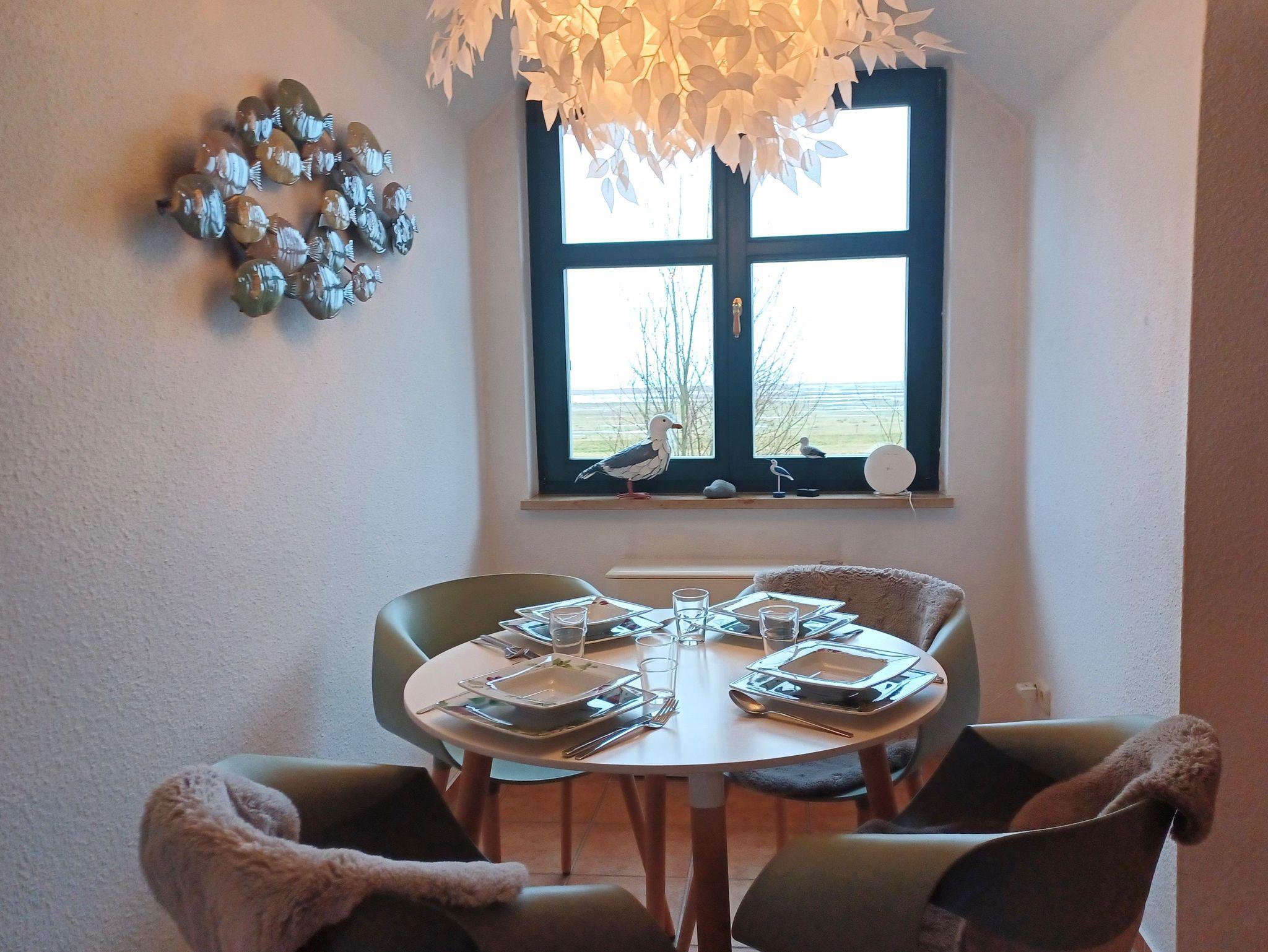 Gemütliche Ferienwohnung am Deich in Wustrow mit Kamin, Terrasse und Strandzugang, ideal für Familien und Haustiere.
