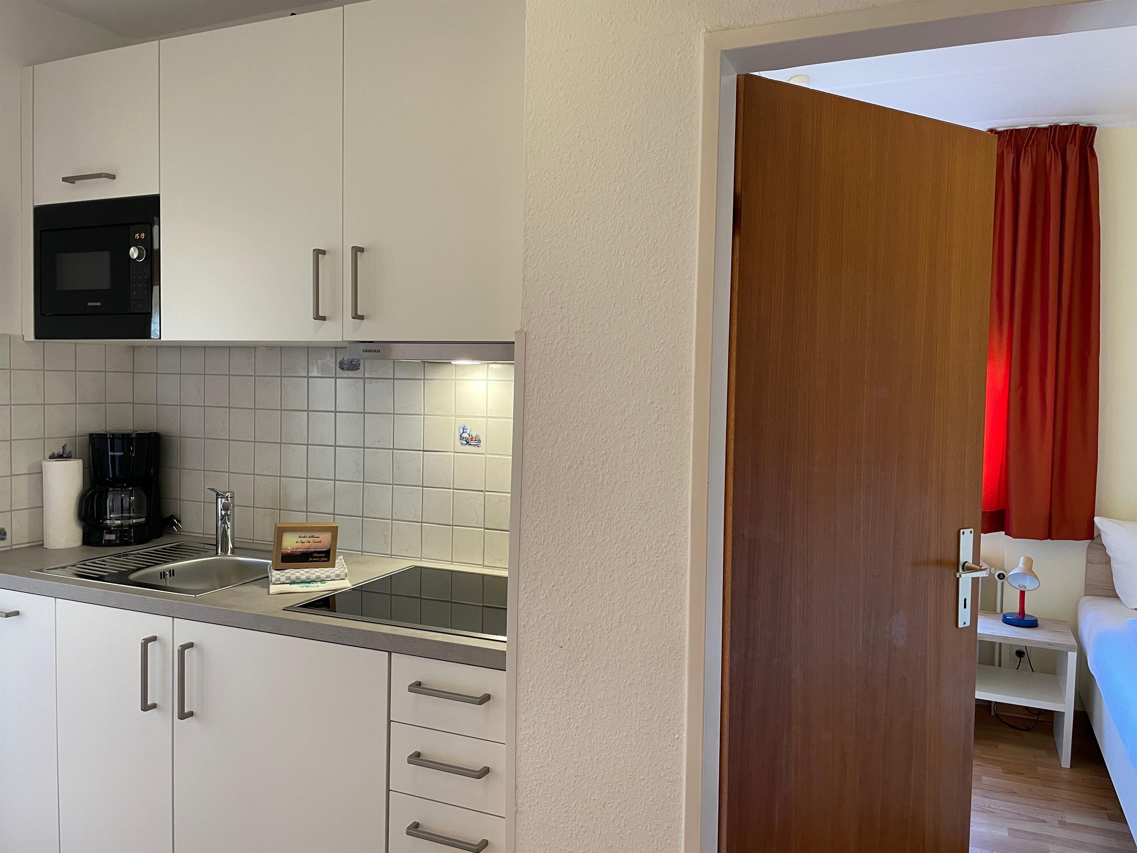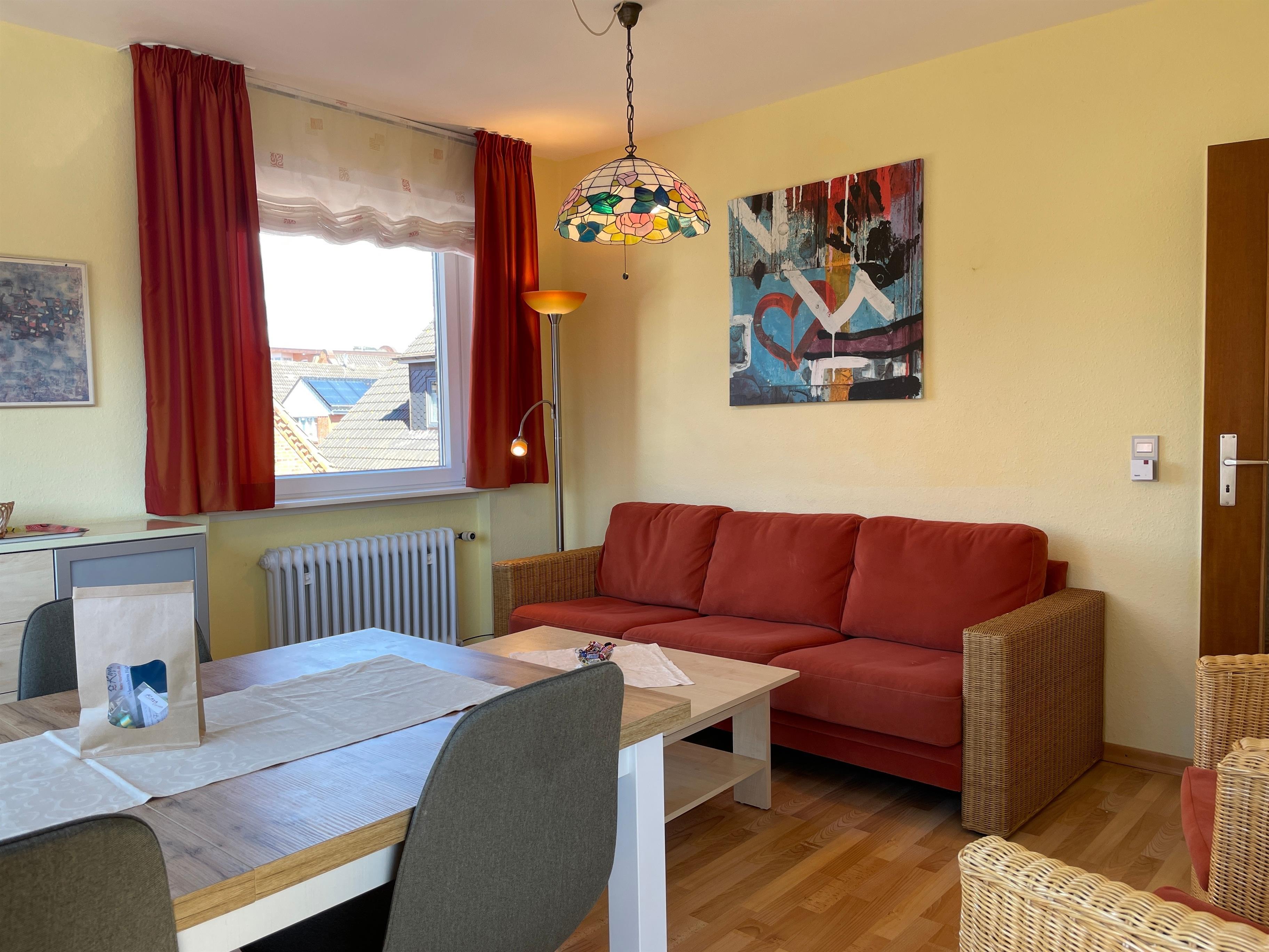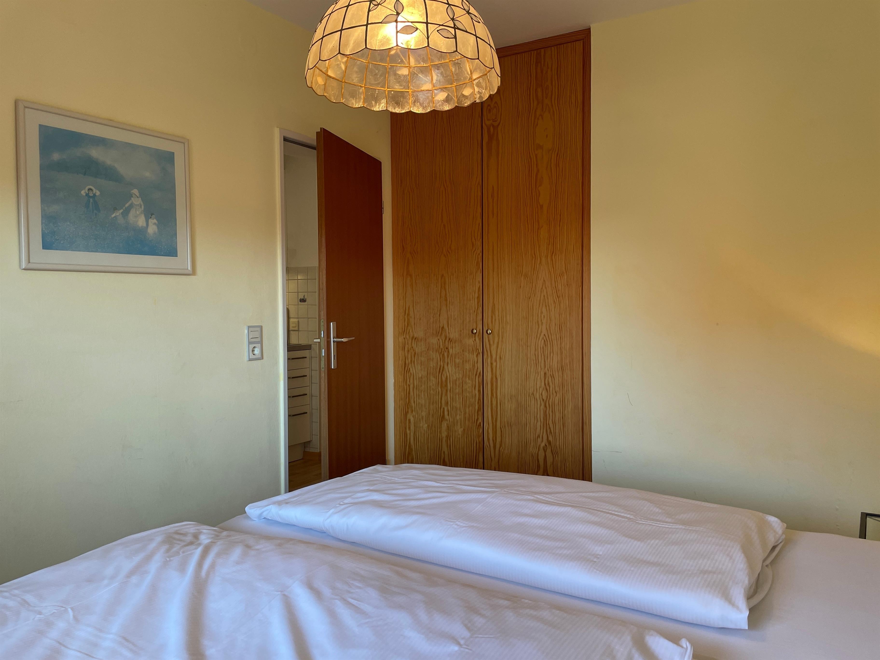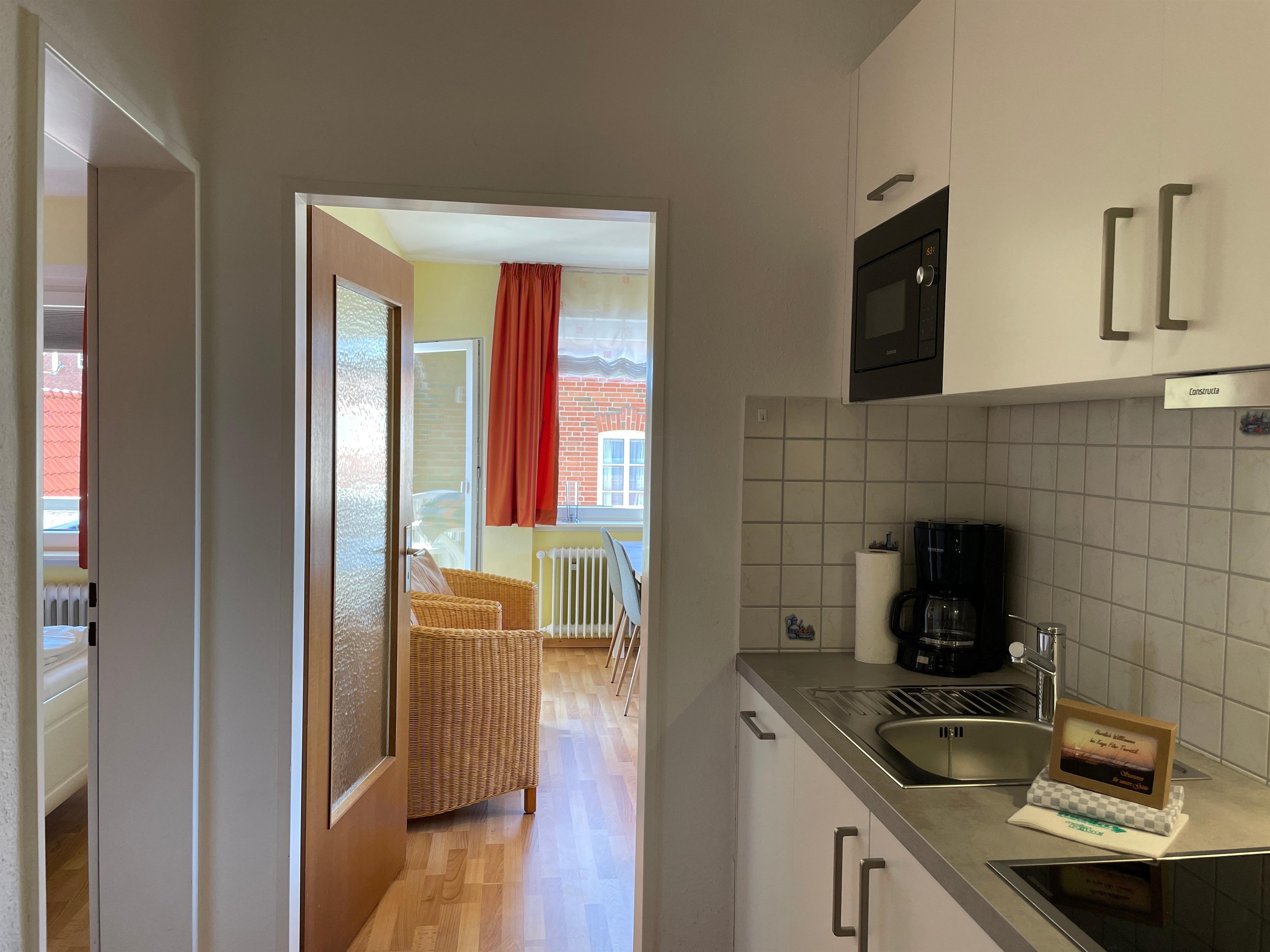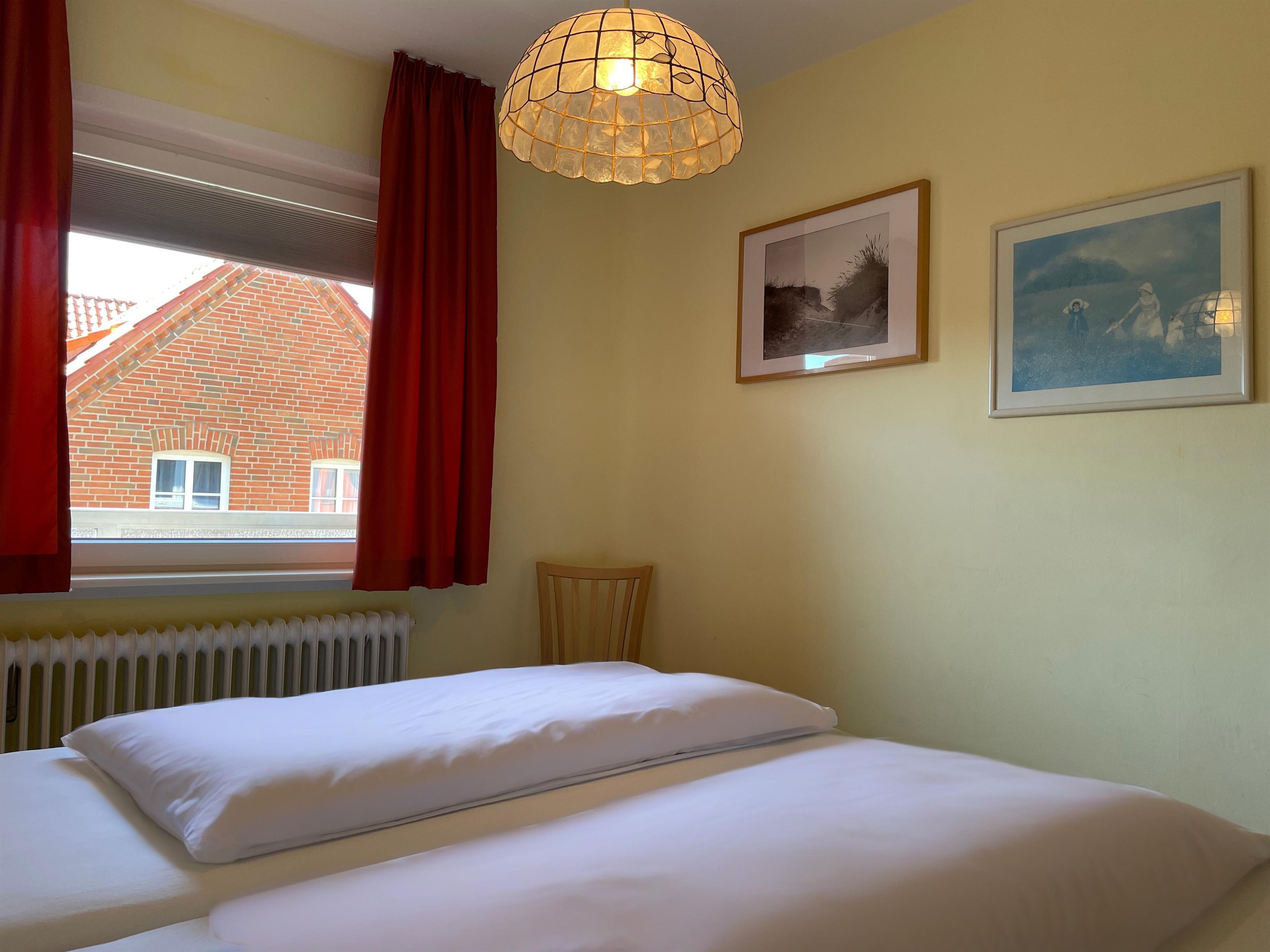Im ersten Obergeschoß liegt die Altstadtwohnung 2 und ist mit zwei Schlafzimmern ideal geeignet für kleine Familien. So haben KInder im Schlafzimmer mit zwei Einzelbetten ihr eigenes Reich, während Eltern im Schlafzimmer mit Doppelbett auschlafen könnten. Das Bad ist mit einer Dusche ausgestattet. Das freundlich eingerichtete Wohnzimmer ist hell und geräumig, genießen Sie hier Zeit mit der ganzen Familie zusammen. Die integrierte Küchenzeile ist gut ausgestattet, so dass Sie sich wunderbar zu Hause versorgen möchte, wenn Sie nicht mal eben hinaus vor die Tür möchten, wo sich eine Vielzahl an Cafés und Restaurants befindet. Weiterhin gehört zu der Wohnung ein Südwestbalkon mit einem malerischen Blick auf die Wyker Altstadt..