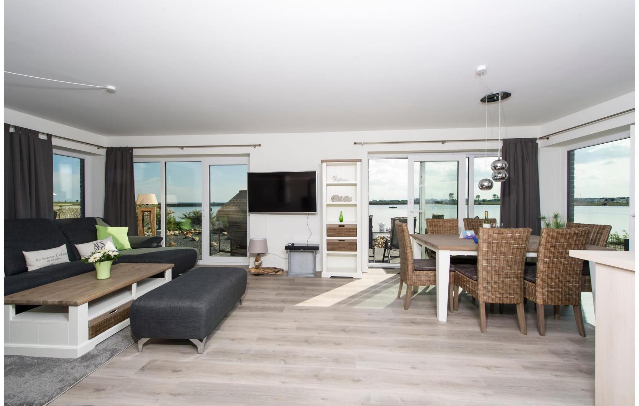 Der großzügige und lichtdurchflutete Wohn- /Essbereich stellt den Mittelpunkt der Ferienwohnung dar und überzeugt mit bodentiefen Fenstern, einer gemütlichen Sitzlandschaft und einem großen Esstisch, alles vor spektakulärer Wasserkulisse. Die offen gestaltete Küche bietet an hochwertiger Technik und Ausstattung alles, was das Kochherz begehrt. Direkt angrenzend an den Wohn-/Essbereich befindet sich die große Terrasse mit ganztags Sonne. In unmittelbarer Wassernähe und vor Hafenkulisse lässt sich hier entspannt die Seele baumeln lassen. Zwei Schlafzimmer bieten Platz für bis zu vier Erwachsene.