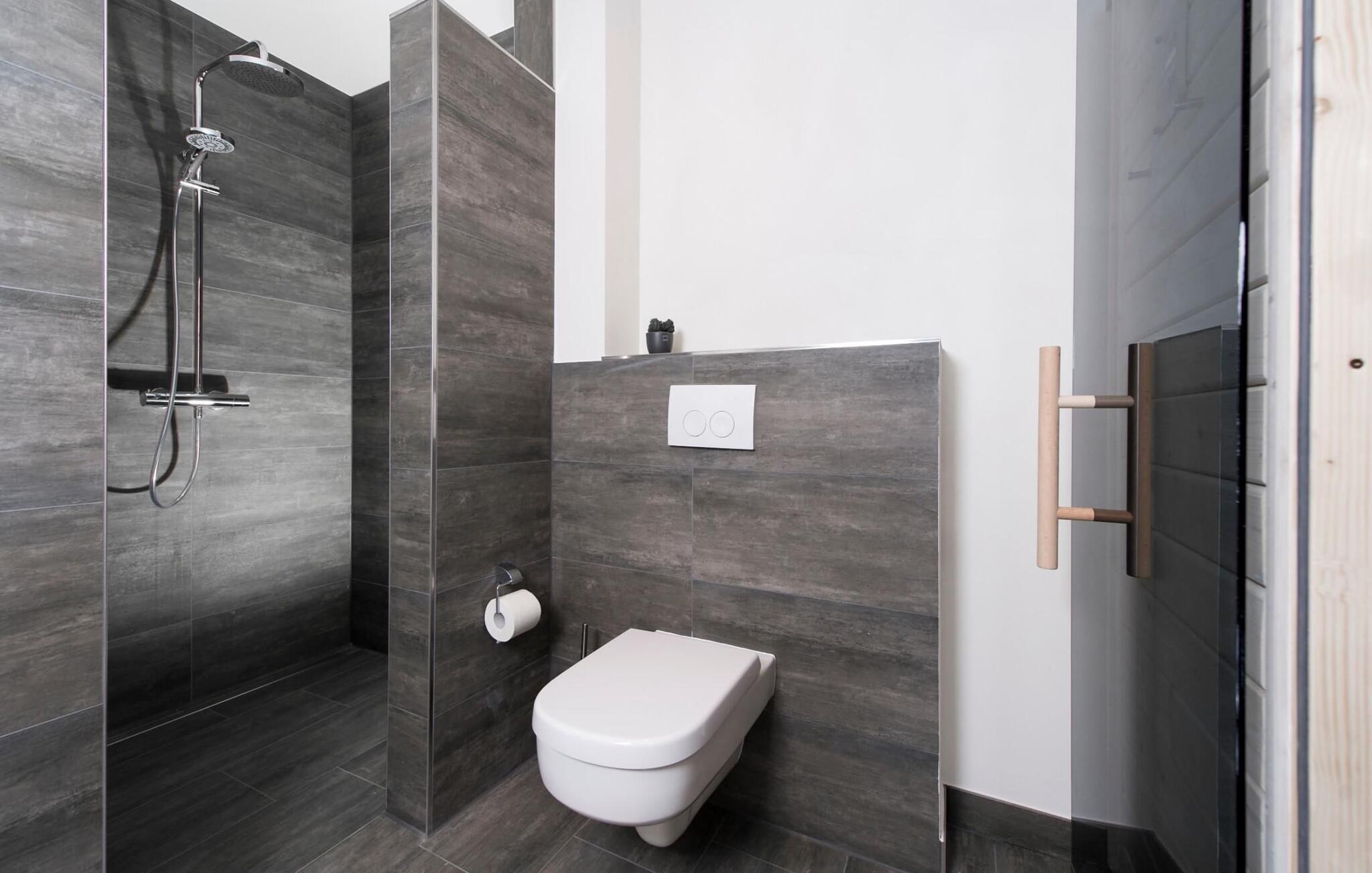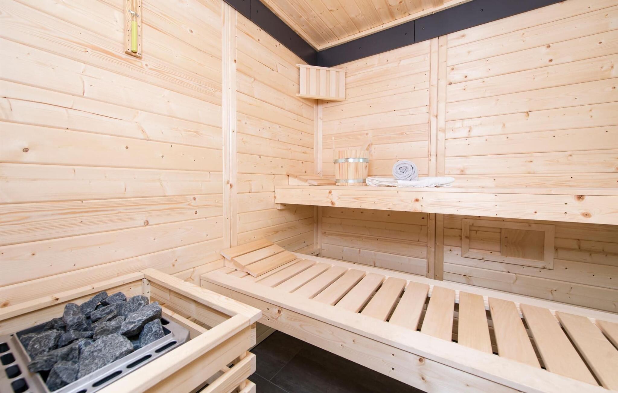 Das Hauptbadezimmer bietet neben einer bodengleichen Dusche auch ein persönliches Spa-Programm, denn die große finnische Sauna sorgt für Wellnessmomente.