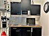 Eine kleine Küchenzeile mit Mikrowelle sowie ein Bad mit Dusche. Handtücher und Bettwäsche werden gestellt.